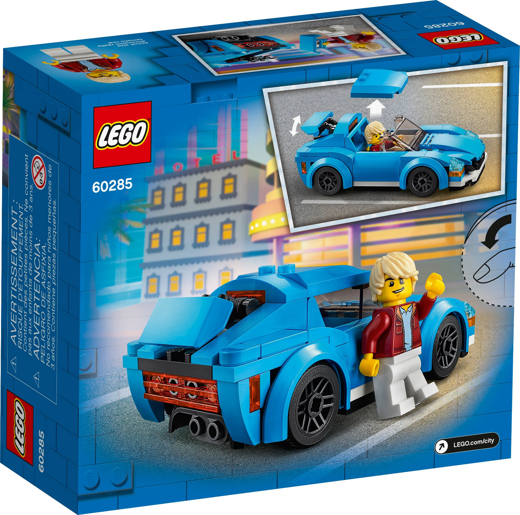 Kids with a passion for cool cars will love the LEGO® City Sports Car (60285). This vehicle is bursting with awesome design details, including aerodynamic bodywork, a removable roof for open-top driving, an adjustable rear spoiler, sporty black rims with ground-gripping tires and a detailed cockpit for the minifigure driver. Just add a touch of imagination and head for the highway!A LEGO treat for boys and girls aged 5 and upYou'll find building instructions for this LEGO City sports car toy in the box. Or you can download Instructions PLUS, part of the LEGO Building Instructions app for smartphones and tablets. This interactive construction guide, with amazing zoom and rotate viewing tools, quickly turns budding LEGO builders into master builders.The Great Vehicles of LEGO CityBoys and girls get to explore all kinds of realistic machines and vehicles with LEGO City Great Vehicles playsets, developing physical skills and confidence as they build and play.Introduce boys and girls aged 5 and up to the exciting world of LEGO® City with this impressive sports car construction set – an inspiring vehicle for imaginative role play.What’s in the box? All kids need to create the impressive LEGO® City Great Vehicles sports car, with room behind the steering wheel for the driver minifigure. A treat for kids who love cool cars.Awesome design with eye-catching bodywork, an adjustable rear toy spoiler, sporty black rims with ground-gripping tires and a detailed tinted cockpit with seating for the included minifigure driver.This LEGO® City Sports Car (60285) building set makes a great Christmas, birthday or any-other-day surprise for boys and girls aged 5 and up.When built, the LEGO® City sports car measures over 1.5 in. (4 cm) high, 4.5 in. (12 cm) long and 2 in. (5 cm) wide.Powered by kids with big imaginations – simply open the bags of bricks and the play can start right away.Includes a simple printed building guide and Instructions PLUS – an interactive construction guide for budding builders. Available in the free LEGO® Building Instructions app for smart devices.Move kids’ creativity up a gear with LEGO® City Great Vehicles sets – feature-rich vehicles and characters inspire imaginative play while helping youngsters develop physical skills and confidence.LEGO® components meet strict industry standards to ensure they are compatible and connect and pull apart consistently every time – it's been that way since 1958.LEGO® City bricks and pieces are dropped, heated, crushed, twisted and analyzed to make sure every building set meets stringent global safety standards.