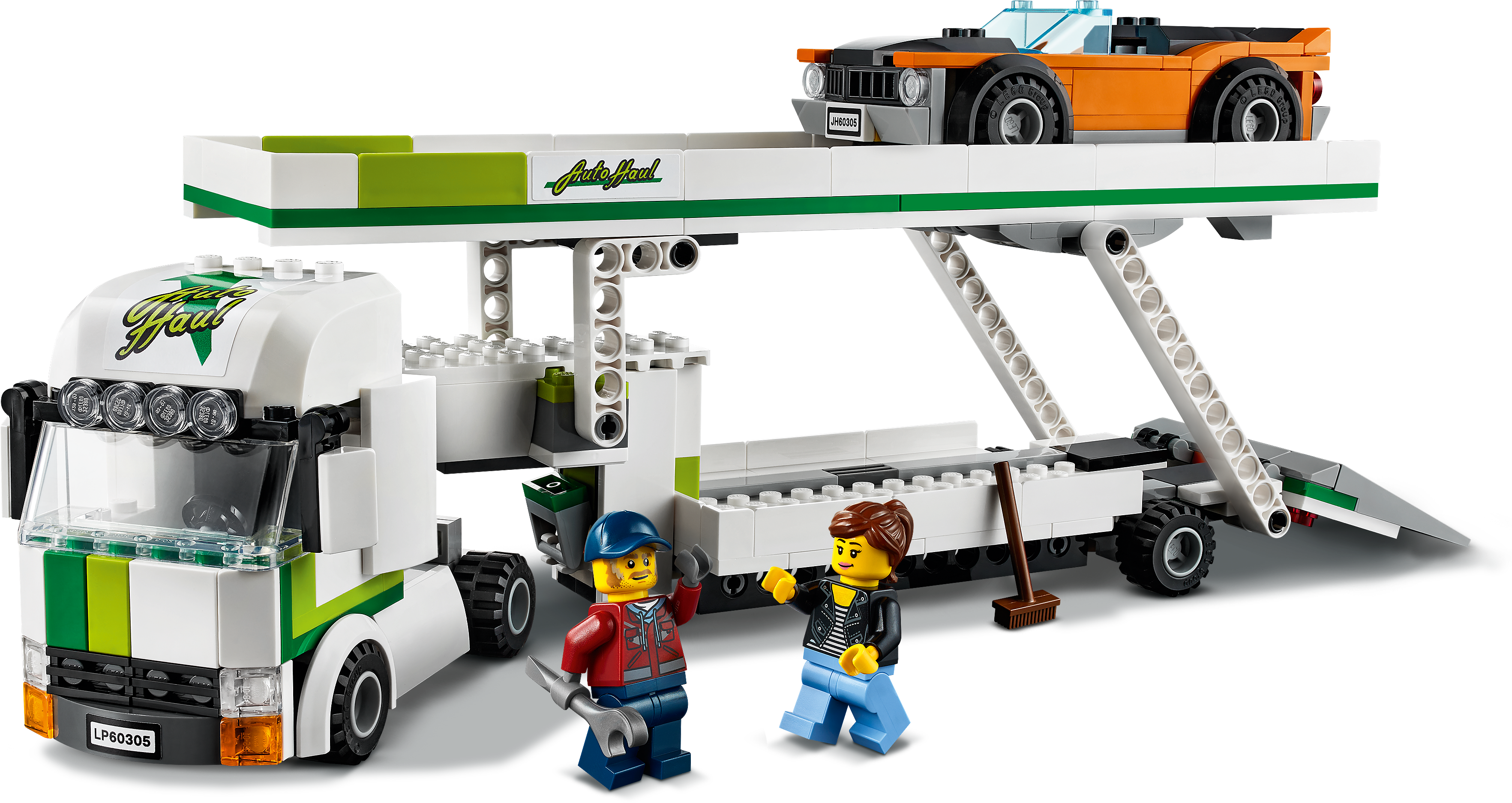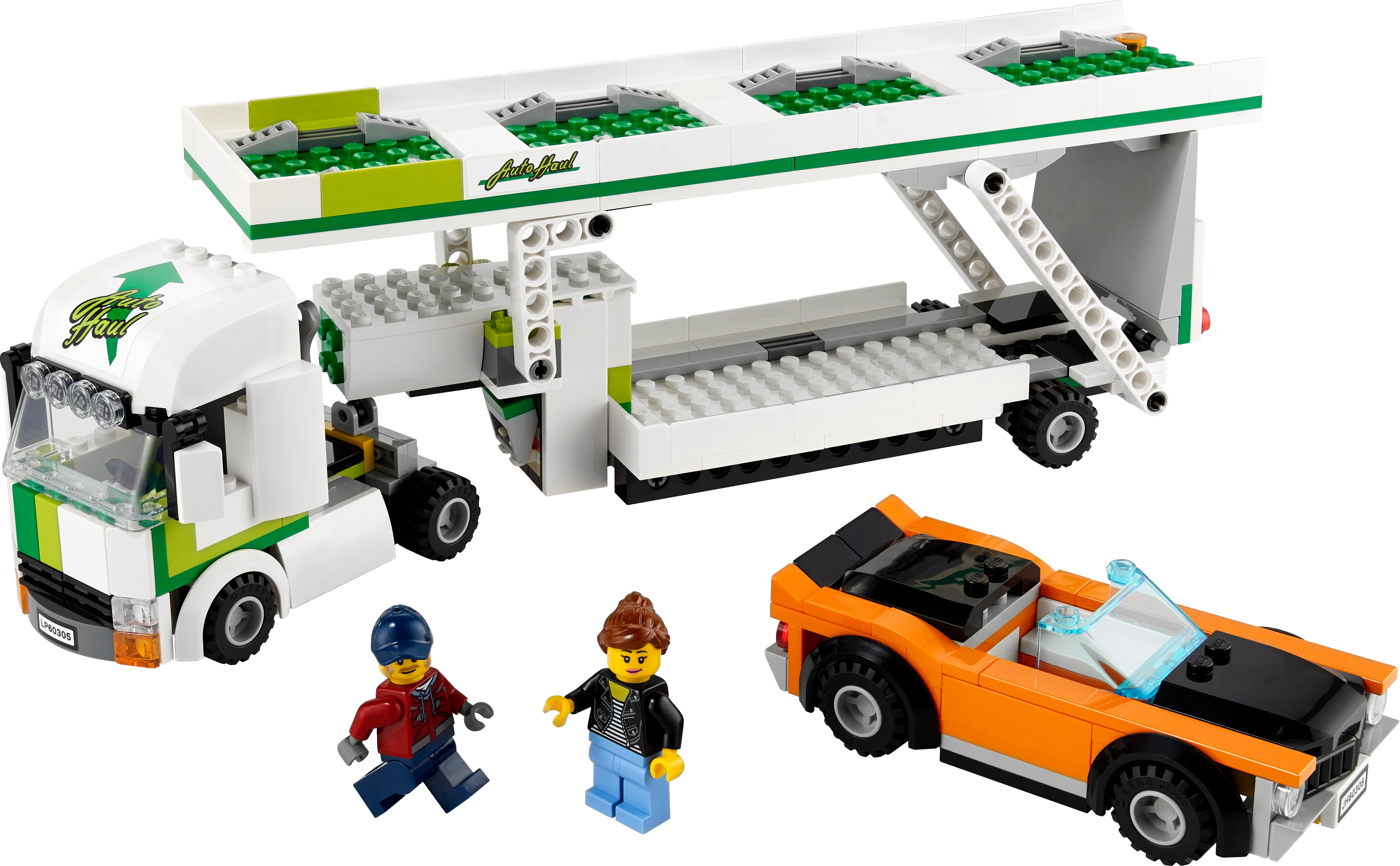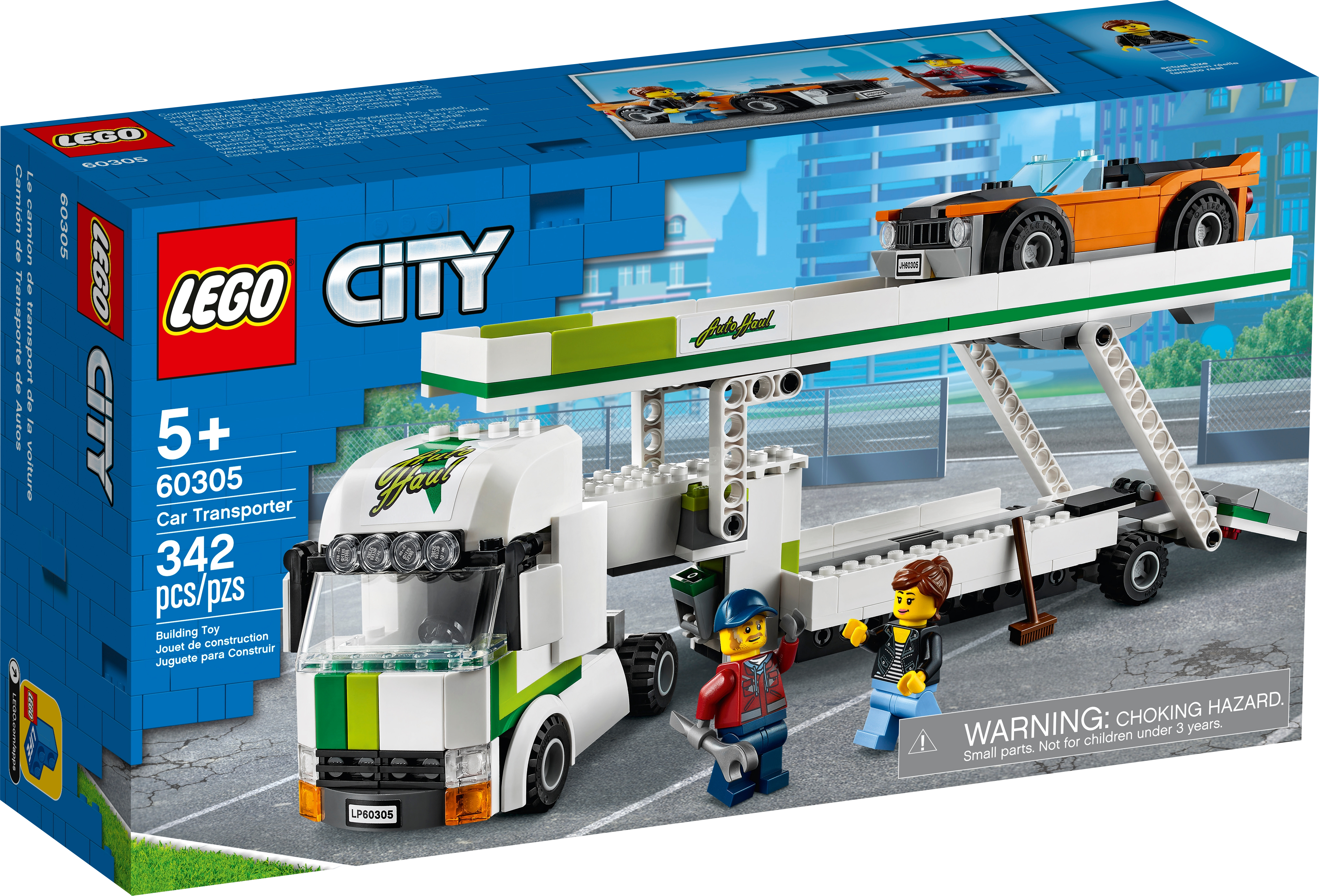 Kids can transport up to 3 LEGO® City Great Vehicles toy cars with the LEGO City Car Transporter (60305). This articulated transporter features a double-decker trailer with a raisable upper deck and working rear ramp. Kids also get a cool muscle car to transport, plus truck driver and motorist minifigures to kickstart the fun.Exciting building set for kids aged 5 and upThis car transporter playset comes with easy-to-follow building instructions that provide younger LEGO builders with a satisfying, independent build-and-play experience – so your little truck driver will be on the road in no time!LEGO City Great Vehicles – Cool toys for kidsKids grow up surrounded by amazing vehicles and machines, and with LEGO City Great Vehicles building sets they get to explore them up close, with realistic models and fun characters that inspire open-ended, imaginative play.Treat your everyday hero to this exciting LEGO® City Car Transporter (60305) building set, with cool toy vehicles and fun characters that will take imaginative role play into the fast lane.What's in the box? All kids need to create a toy car transporter and a cool muscle car with a removable roof, plus truck driver and motorist minifigures.Kids can raise and lower the trailer's upper deck and rear ramp to load and transport up to 3 LEGO® City Great Vehicles cars, including the cool muscle car included with this set.Makes a great Christmas, birthday or any-other-day treat for boys and girls aged 5 and up.When built, the LEGO® City car transporter toy measures over 4.5 in. (11 cm) high, 12 in. (31 cm) long and 3 in. (8 cm) wide.LEGO® accessory elements in this set include a broom and a wrench.Includes a printed building guide and Instructions PLUS – an interactive construction guide with zoom and rotate viewing tools for young builders. Part of the free LEGO® Building Instructions app.LEGO® City Great Vehicles playsets nurture kids’ physical skills and confidence with feature-rich models and fun characters that inspire open-ended creative play.All LEGO® components meet strict industry standards to ensure they are consistent, compatible and fun to build with – it's been that way since 1958.LEGO® components are dropped, heated, crushed, twisted and analyzed to make sure they meet stringent global standards for safety.