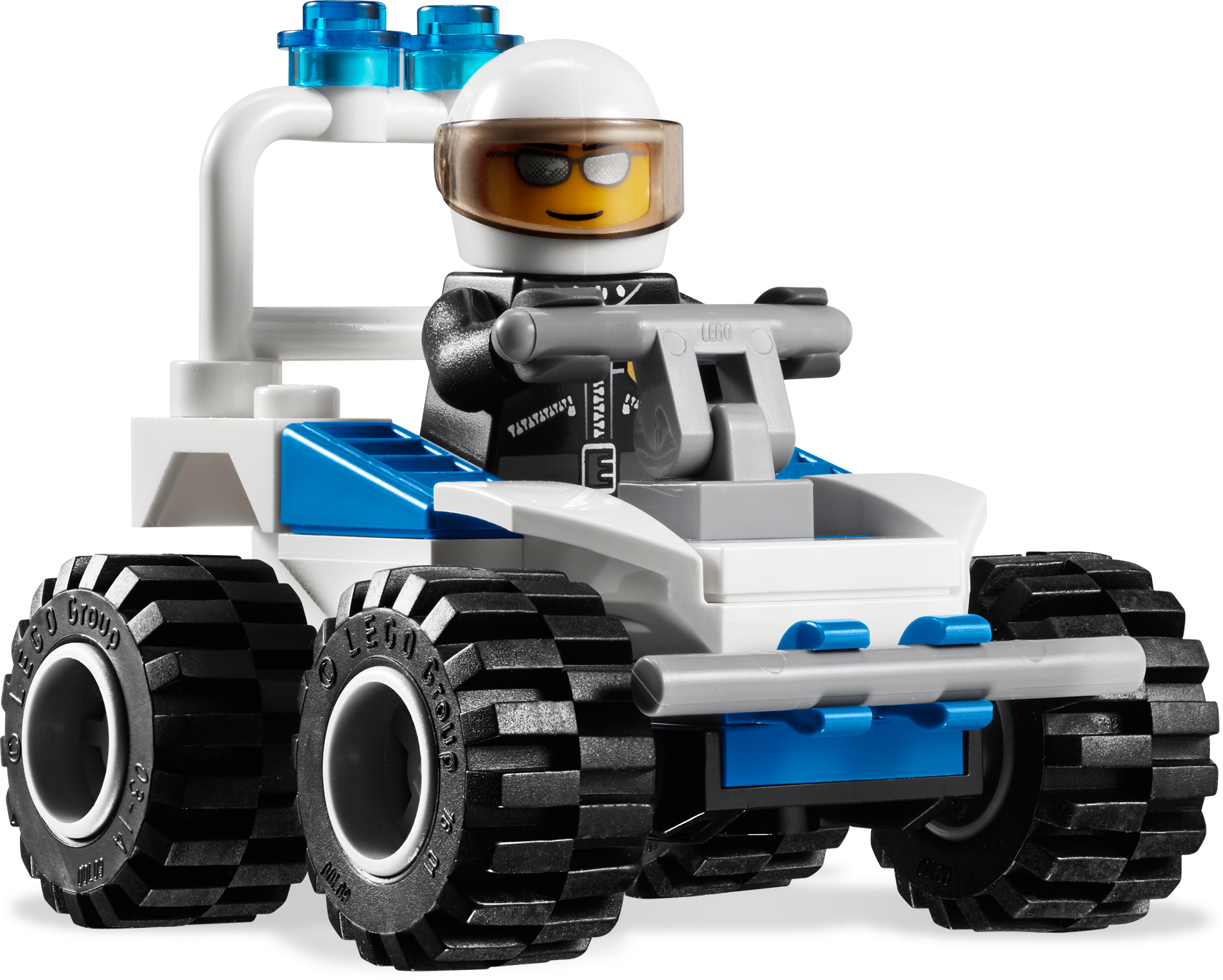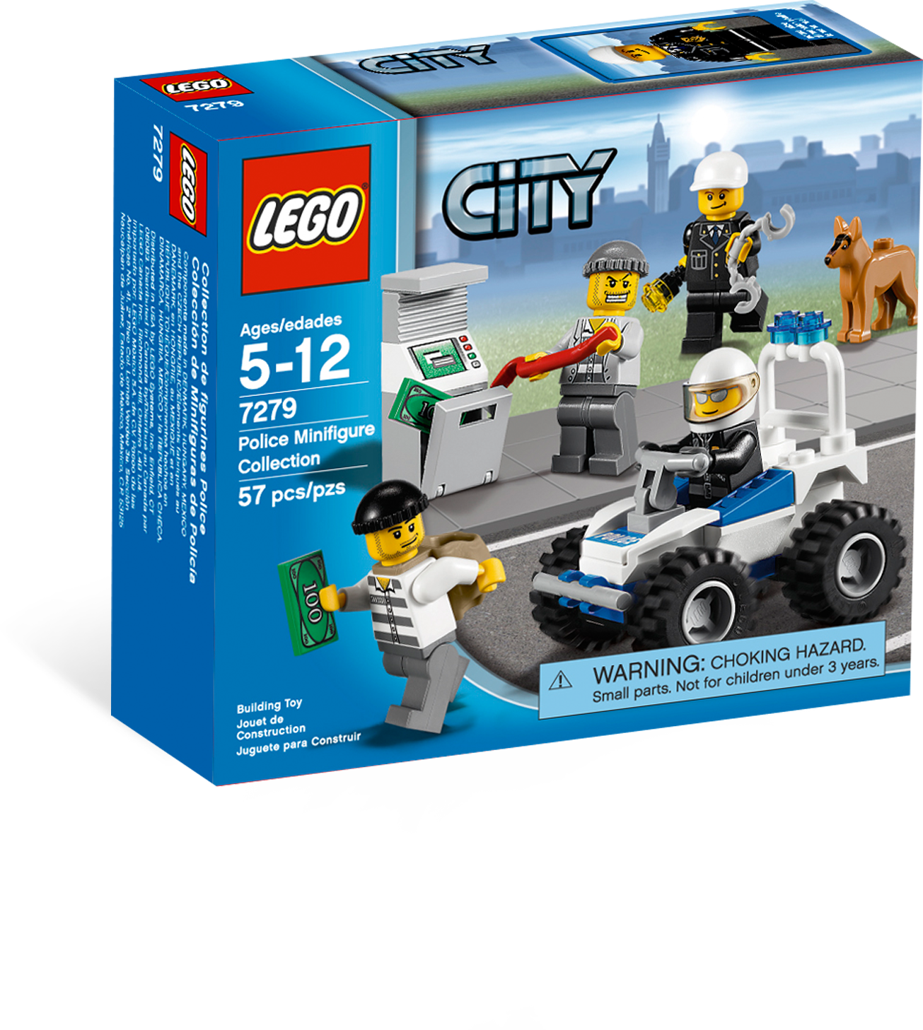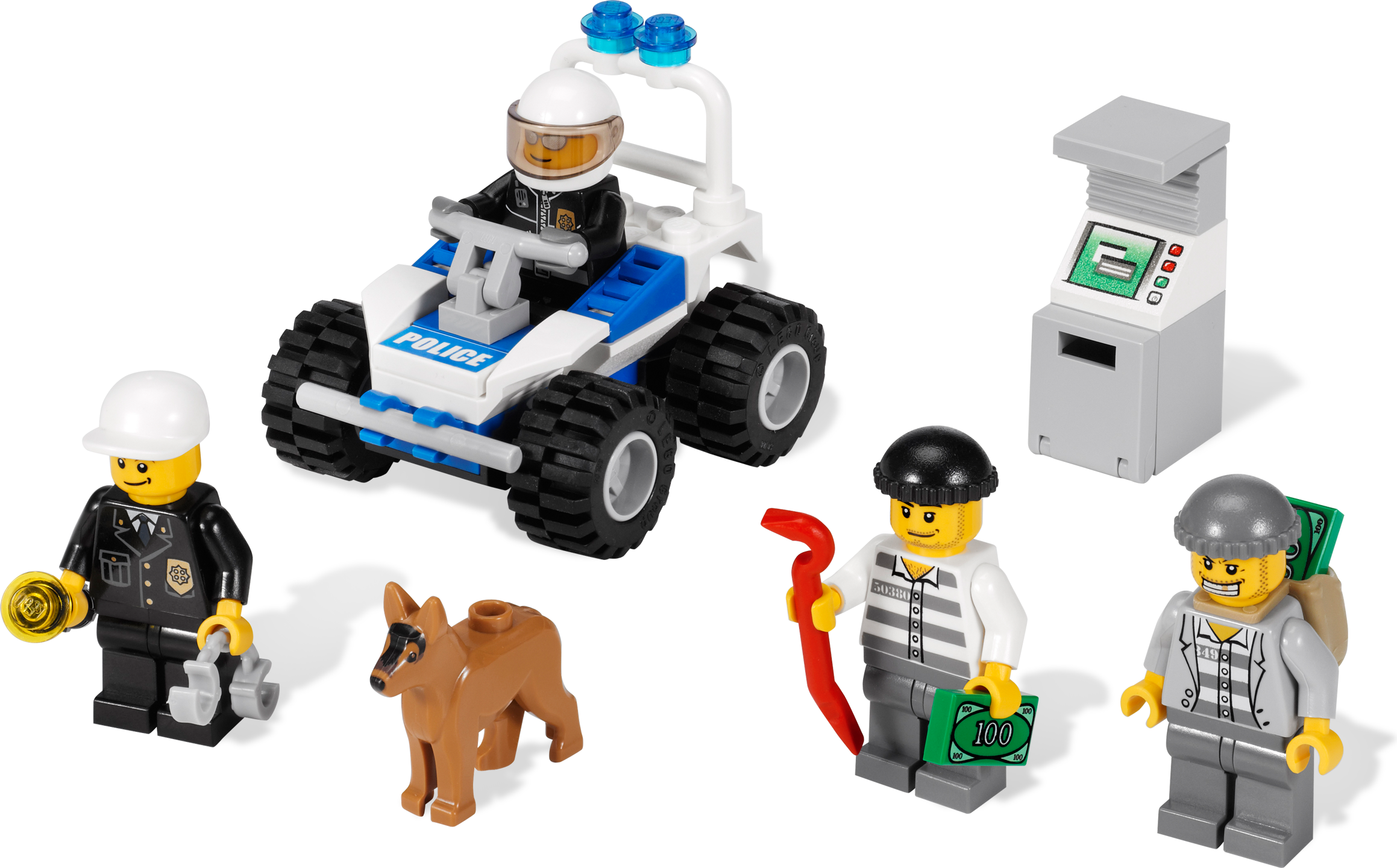 Catch the robbers before they get away! Caught stealing money from the ATM machine, the 2 robbers try to escape the police on foot. The police need the help of the trusty police dog and ATV to catch them and put them behind bars! Includes 4 minifigures: 2 police officers and 2 robbers Features ATM machine, quad bike, police dog, handcuffs, money sack, money brick and flashlight Insert money brick into ATM! Police ATV measures over 2” (5cm) tall 2” (5cm) long
