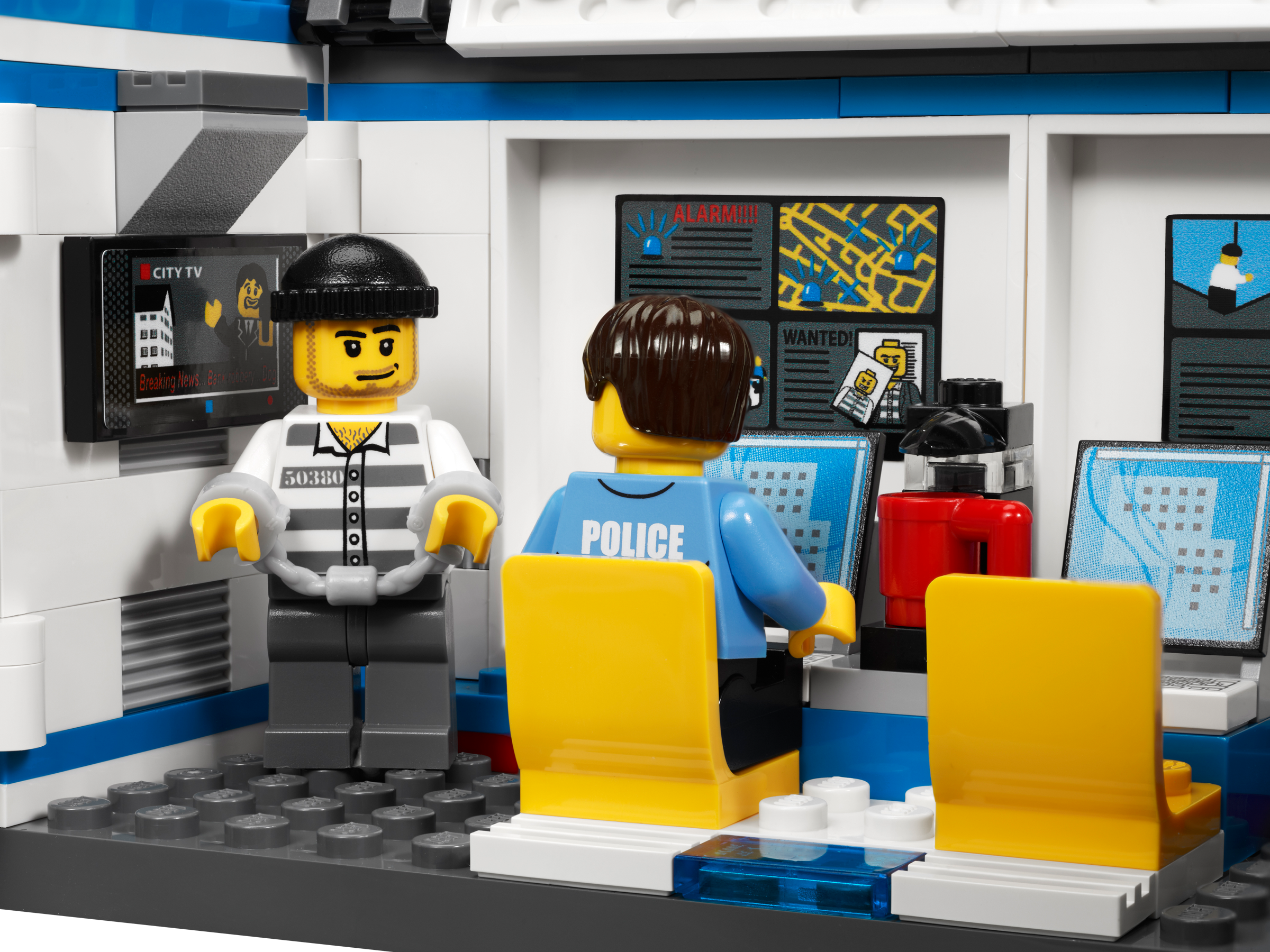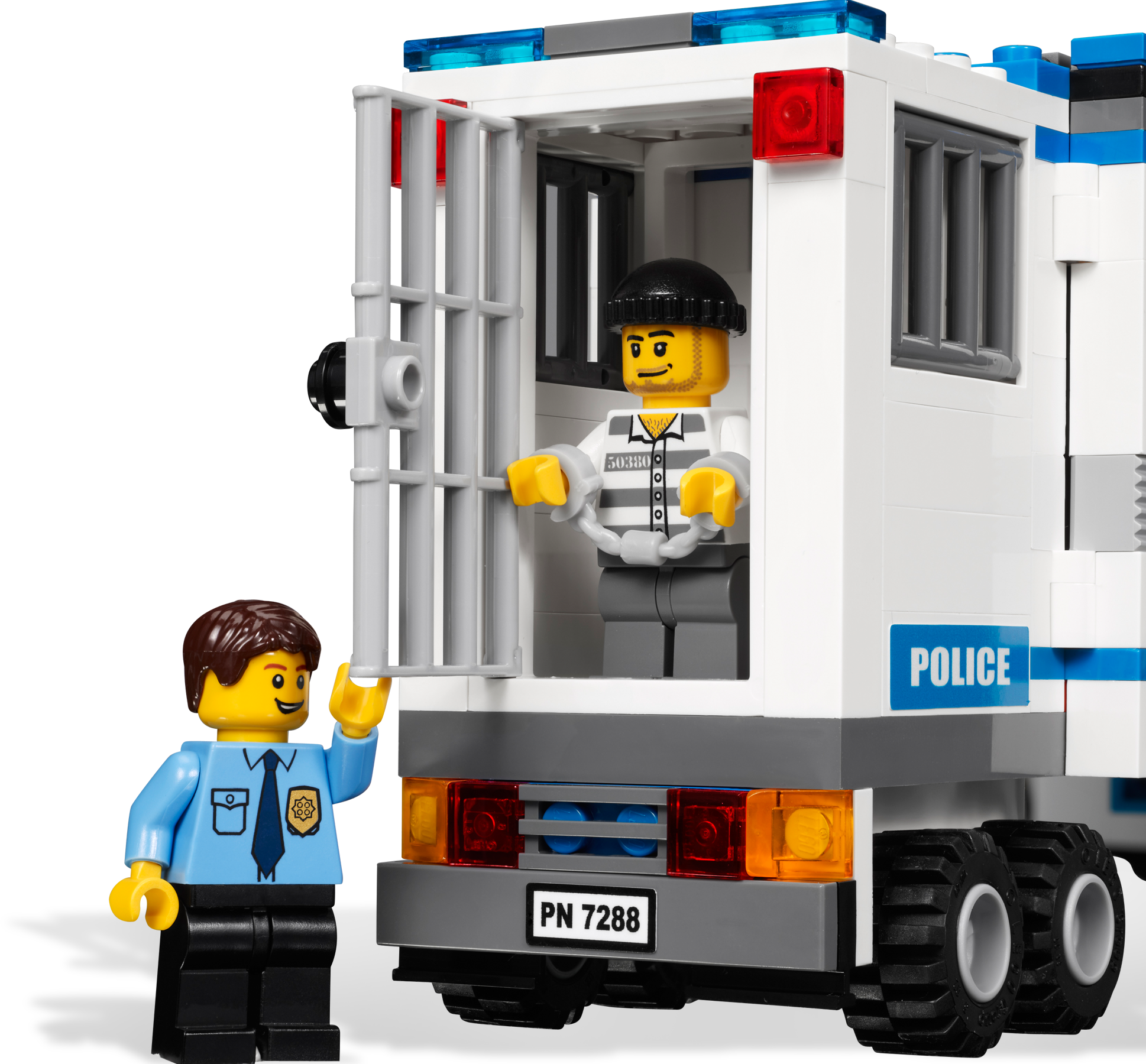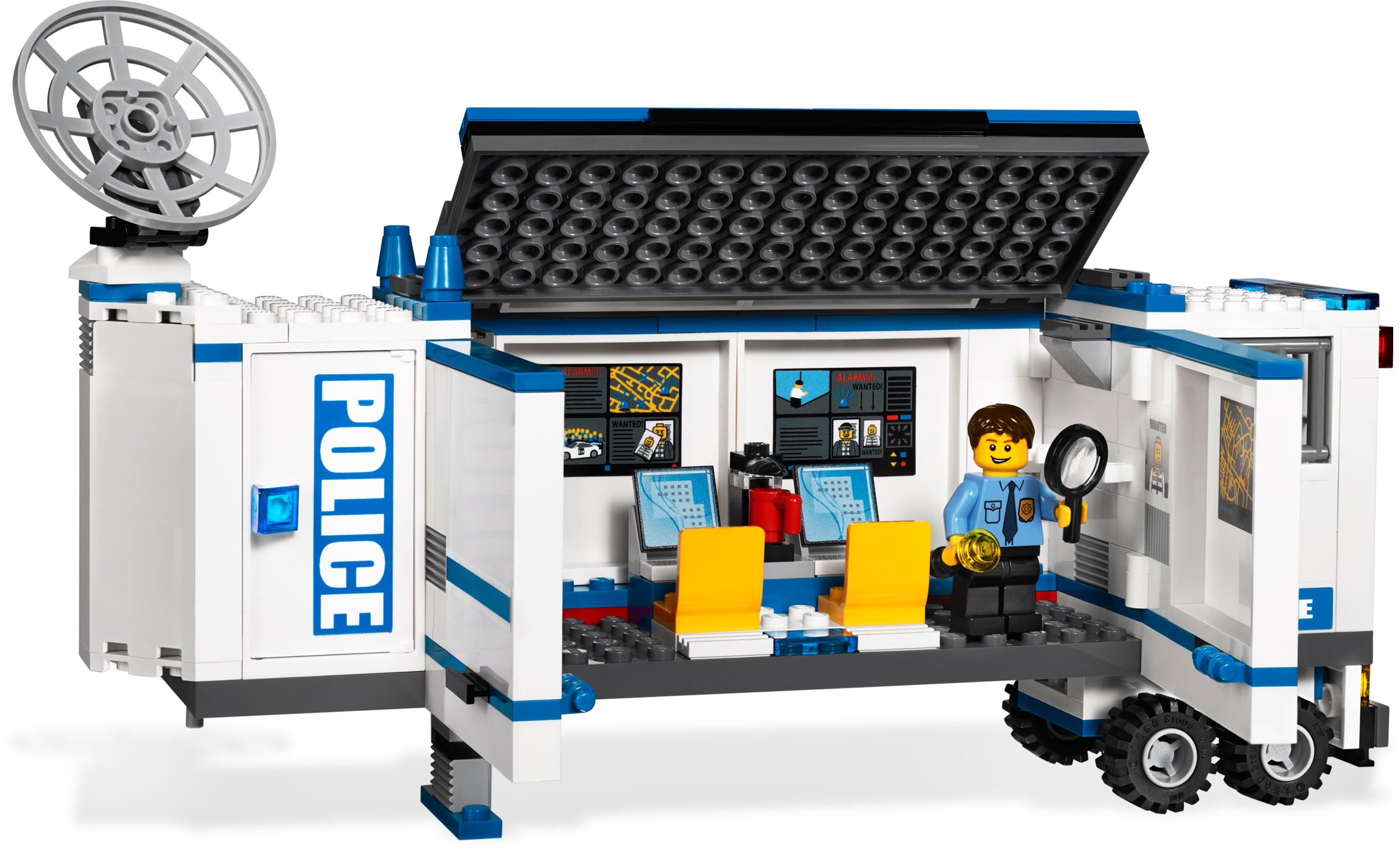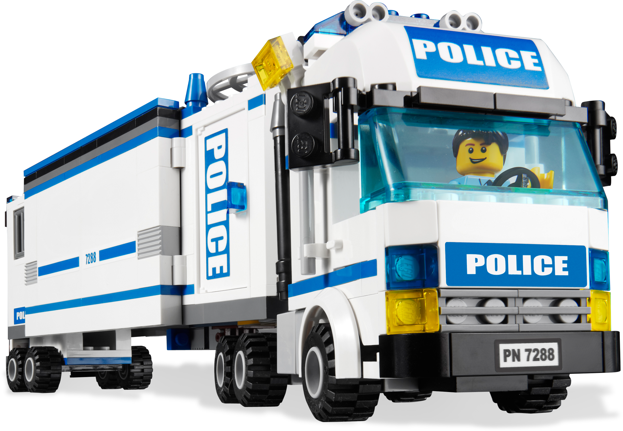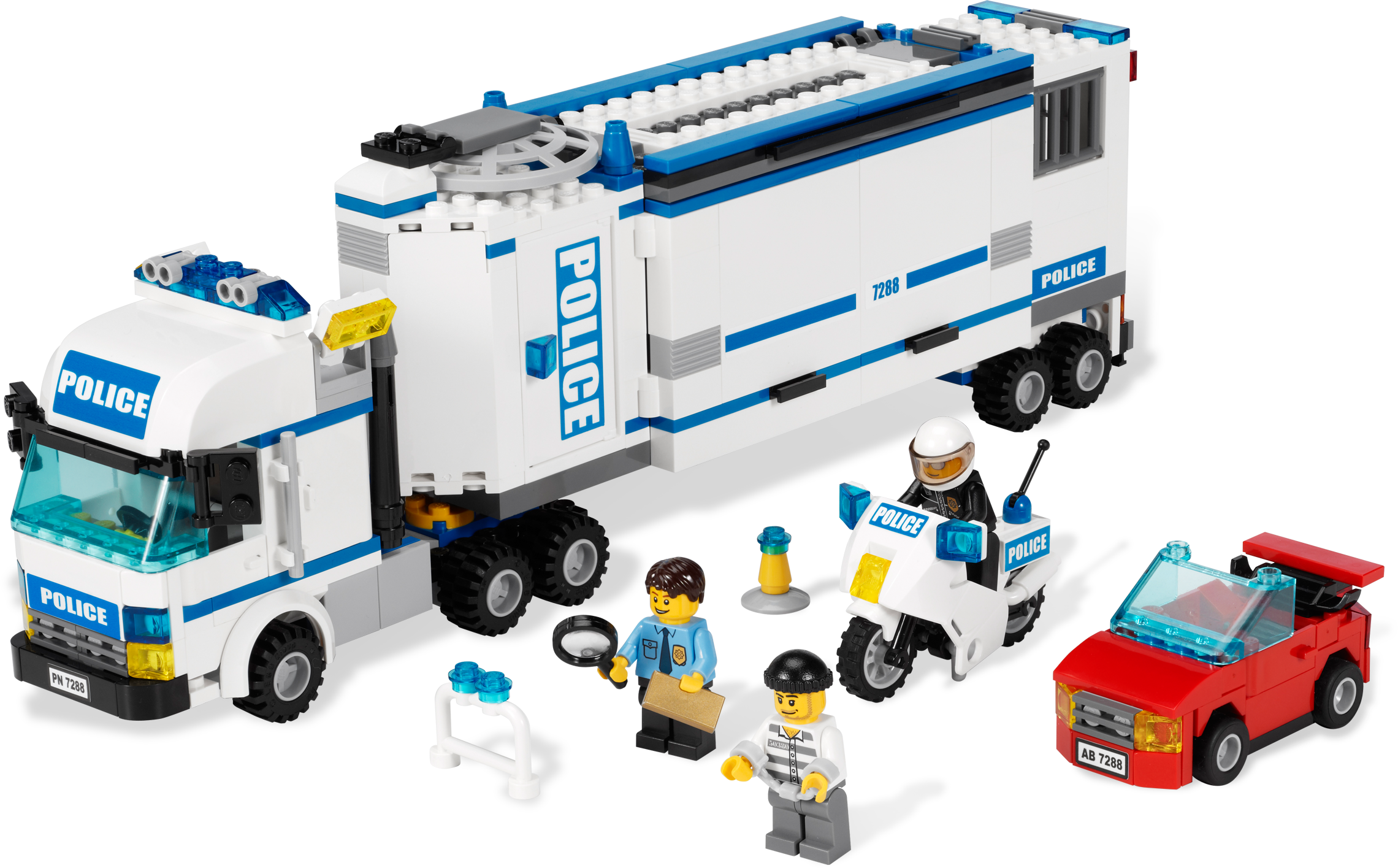 Move to the action with the Mobile Police Unit! Move the LEGO® City Mobile Police Unit right into the action! As the detective monitors the control center, he alerts the police officer that the robber is escaping in a sports car with a bar of gold. Chase him down on the police motorcycle and put him in the mobile station’s prison! Includes 3 minifigures: 2 police officers and 1 robber Features 3 vehicles: Mobile Police Unit, red sports car and police motorcycle Minifigure accessories include handcuffs, flashlight, magnifying glass and gold brick Open side of trailer to reveal control center full of cool details! Detach cab and prisoner trailer! Mobile Police Unit measures 13” (33cm) long