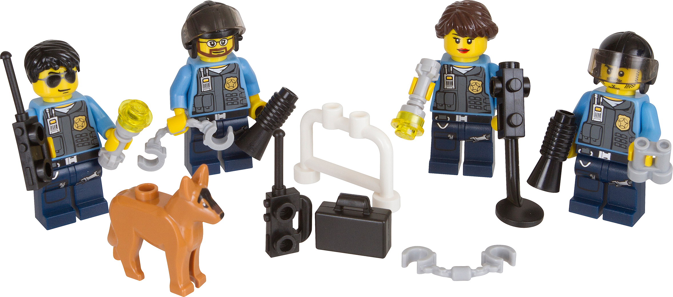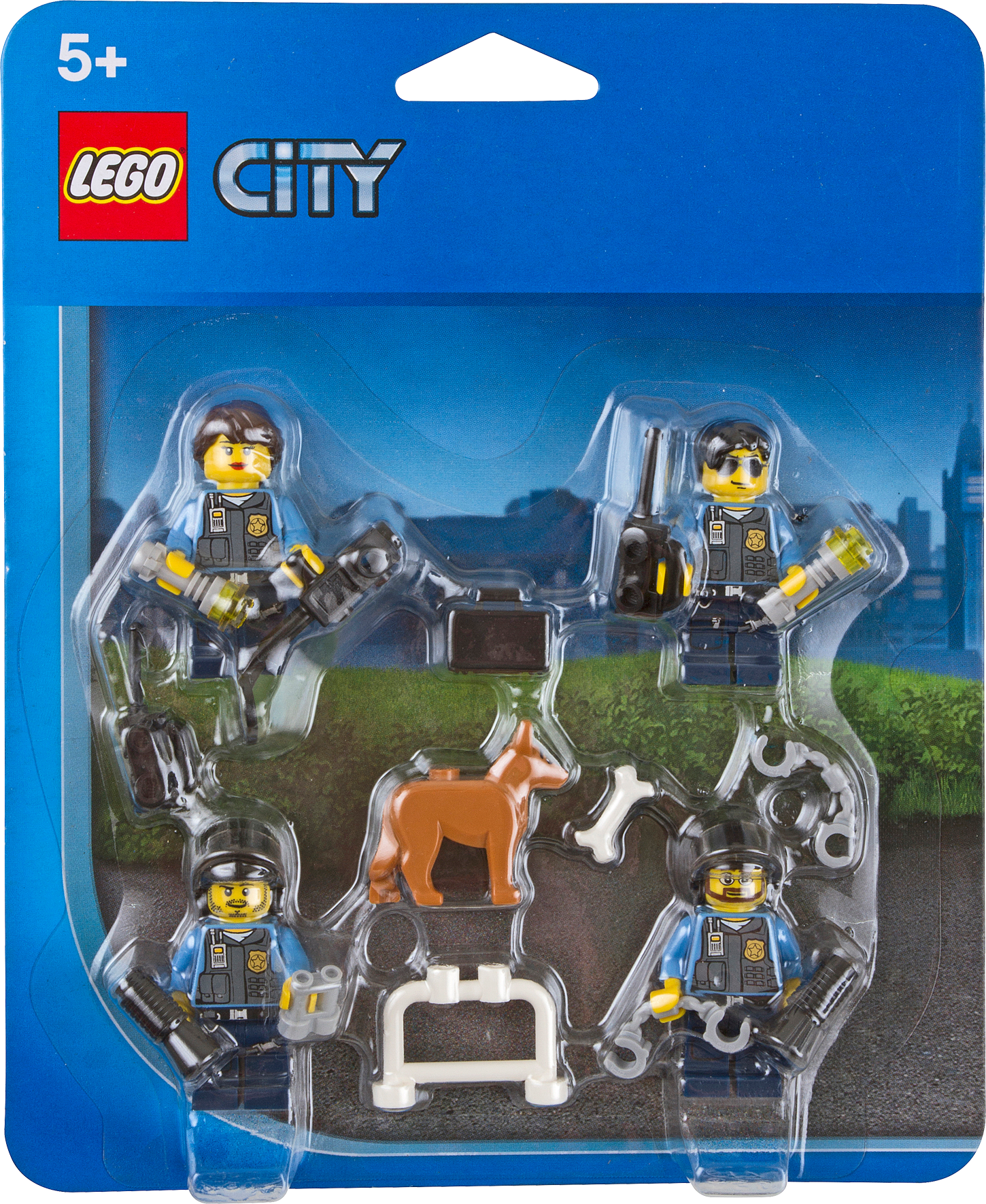 Fight crime in LEGO® City! Fight crime in LEGO® City with 4 prebuilt police minifigures and a police dog! Begin or expand your LEGO City Police collection with tons of story-sparking accessories including a police barrier, bone, handcuffs, binocular element, metal detector element, flashlight, walkie-talkie element set, briefcase and 2 megaphones.• Includes dog and 3 pre-built male and 1 female police minifigures with accessories• Features police barrier, bone element, 2 handcuff elements, binocular element, metal detector element, flashlight, walkie-talkie element set, briefcase and 2 megaphones.• Expand your LEGO® City Police collection!