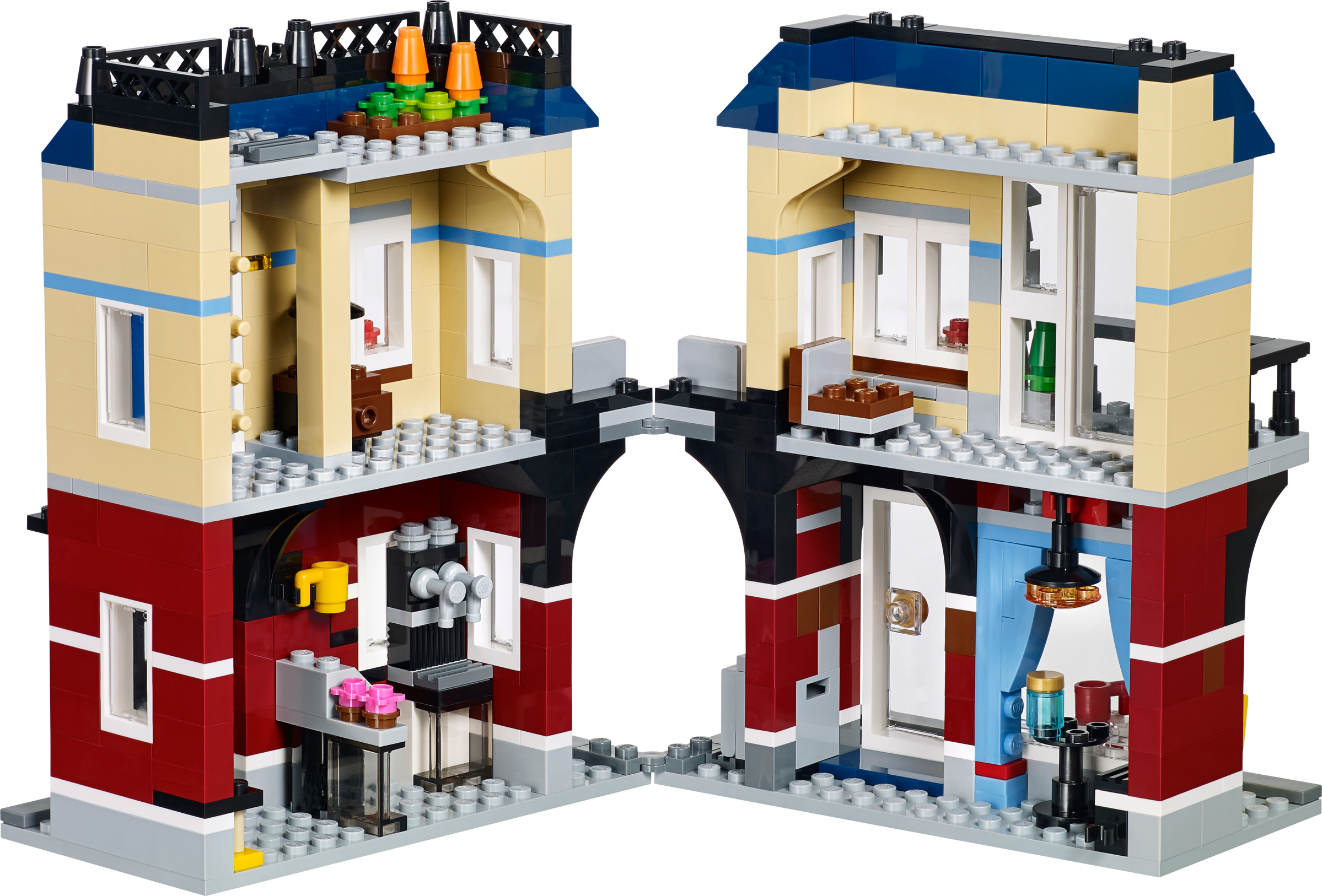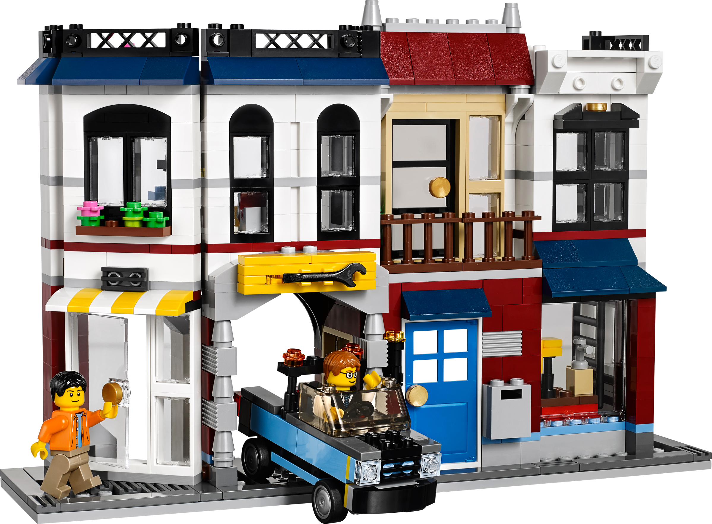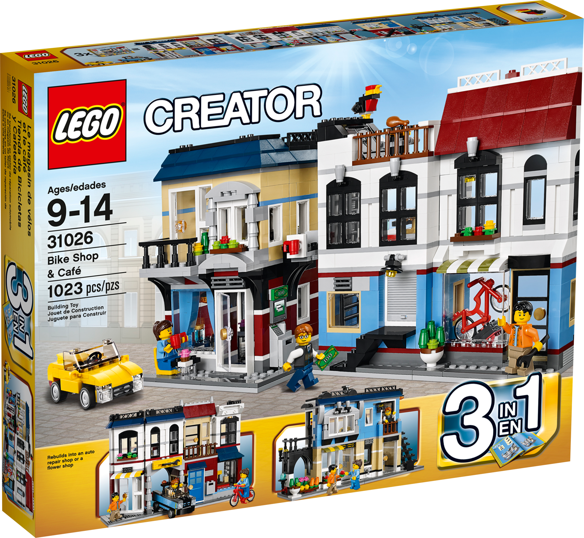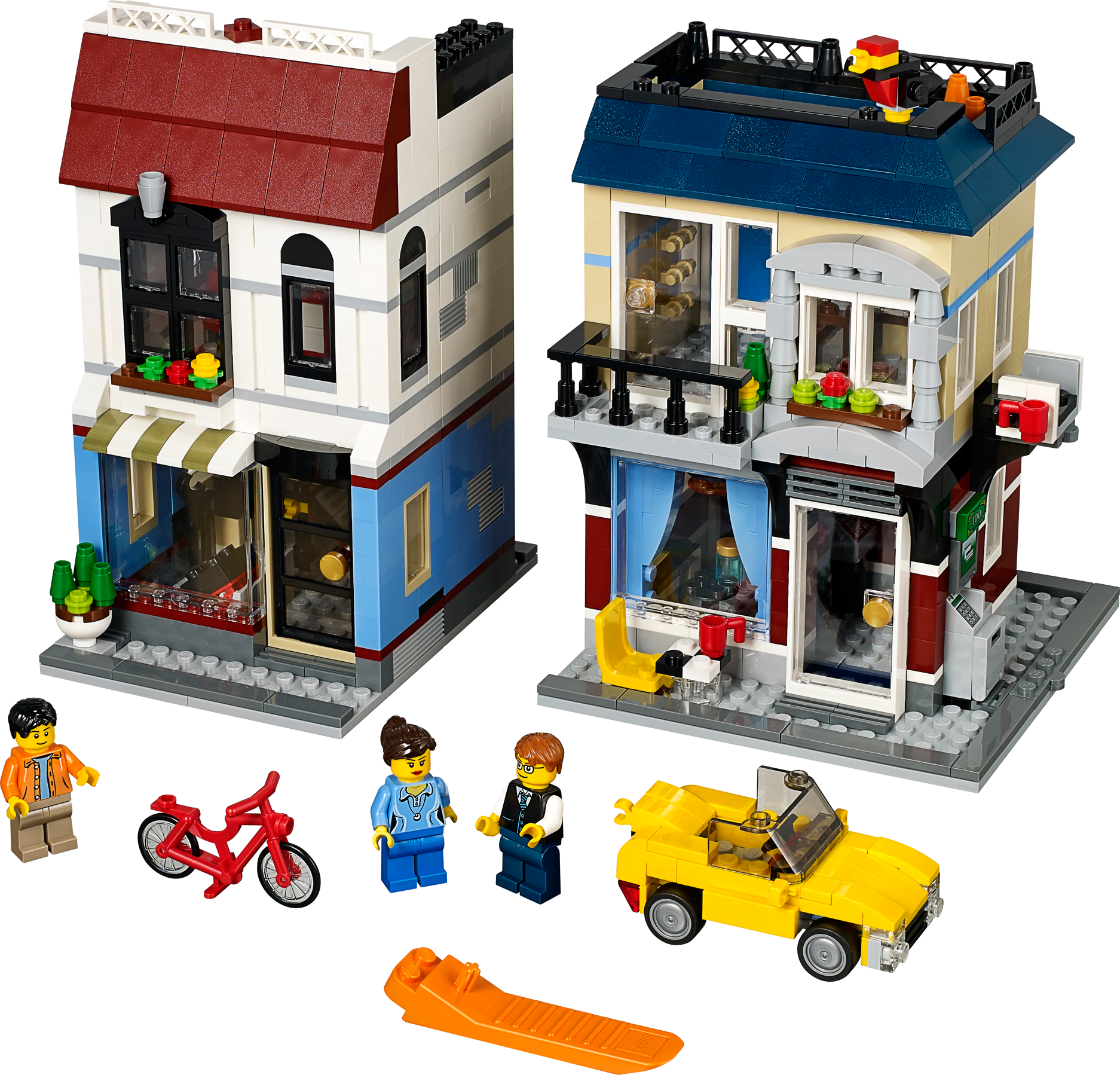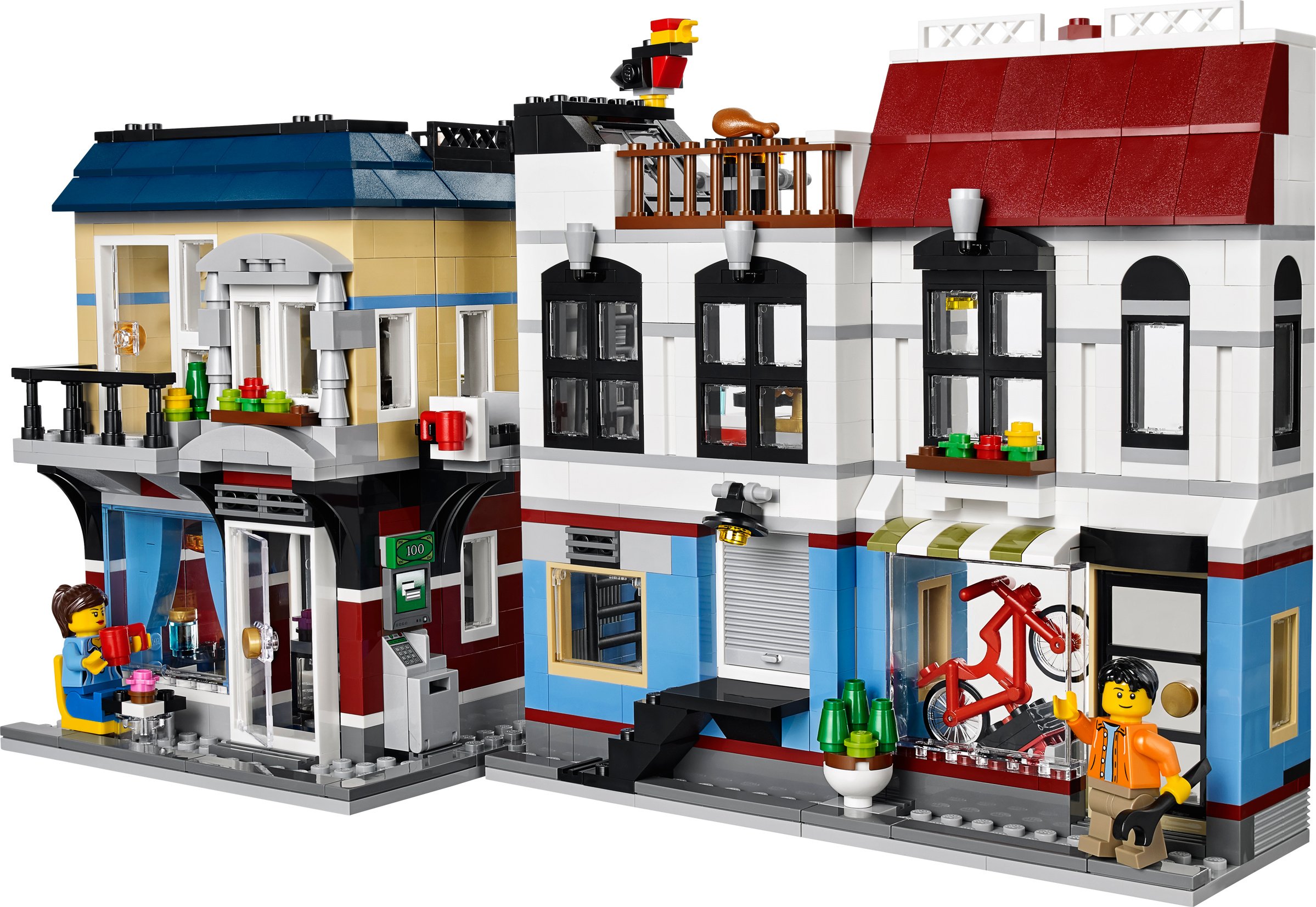 Open up for a world of adventure with the 3-in-1 Bike Shop & Café! Open a world of adventures with this exciting 3-in-1 Bike Shop & Café. Serve delicious muffins and espresso coffee to your customers at the cozy café. Then visit the neighboring bike shop, buy the cool red bike that's for sale, mount it on your car rack and head for the hills! Fold out the Bike Shop & Café for your very own main street, where you can add your own LEGO® creations! What kind of shop will you build next? You can also rebuild the set to create an auto repair shop or a flower shop. Includes 3 minifigures: 2 men and a woman.Includes 3 minifigures: 2 men and a womanFeatures 2 separate buildings: a bicycle shop and a caféBicycle shop features a loading ramp, removable red bicycle, tools, and first-floor apartment with kitchen area including a sink and stove, bed and access to a rooftop area with barbequeCafé features outdoor seating, a bank ATM, money bill, cash register, 2 muffins, espresso machine with cups, cozy indoor seating area with curtains, stairs to first-floor apartment with chest of drawers, lamp and chair, and access to a rooftop area with a vegetable gardenAlso includes a car and buildable birdTake the cool red bike for a spin!Spend your day at the cozy caféLoad up the car and go for a driveEnjoy a relaxing rooftop barbeque3-in-1 model: rebuilds into an auto repair shop or a flower shopBike Shop & Café measures over 7” (19cm) high, 2” (6cm) deep and 17” (44cm) wideAuto repair shop measures over 5” (15cm) high, 2” (6cm) deep and 9” (25cm) wideFlower shop measures over 5” (15cm) high, 2” (6cm) deep and 9” (25cm) wide