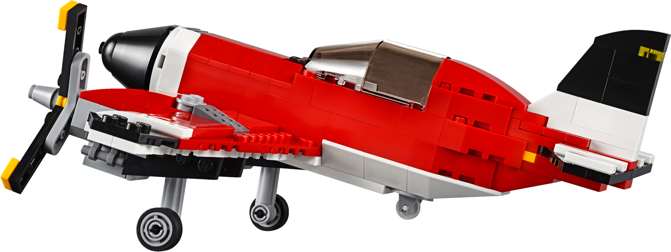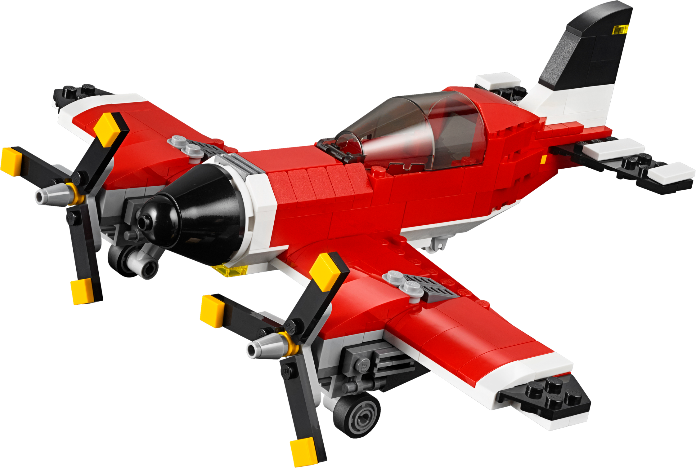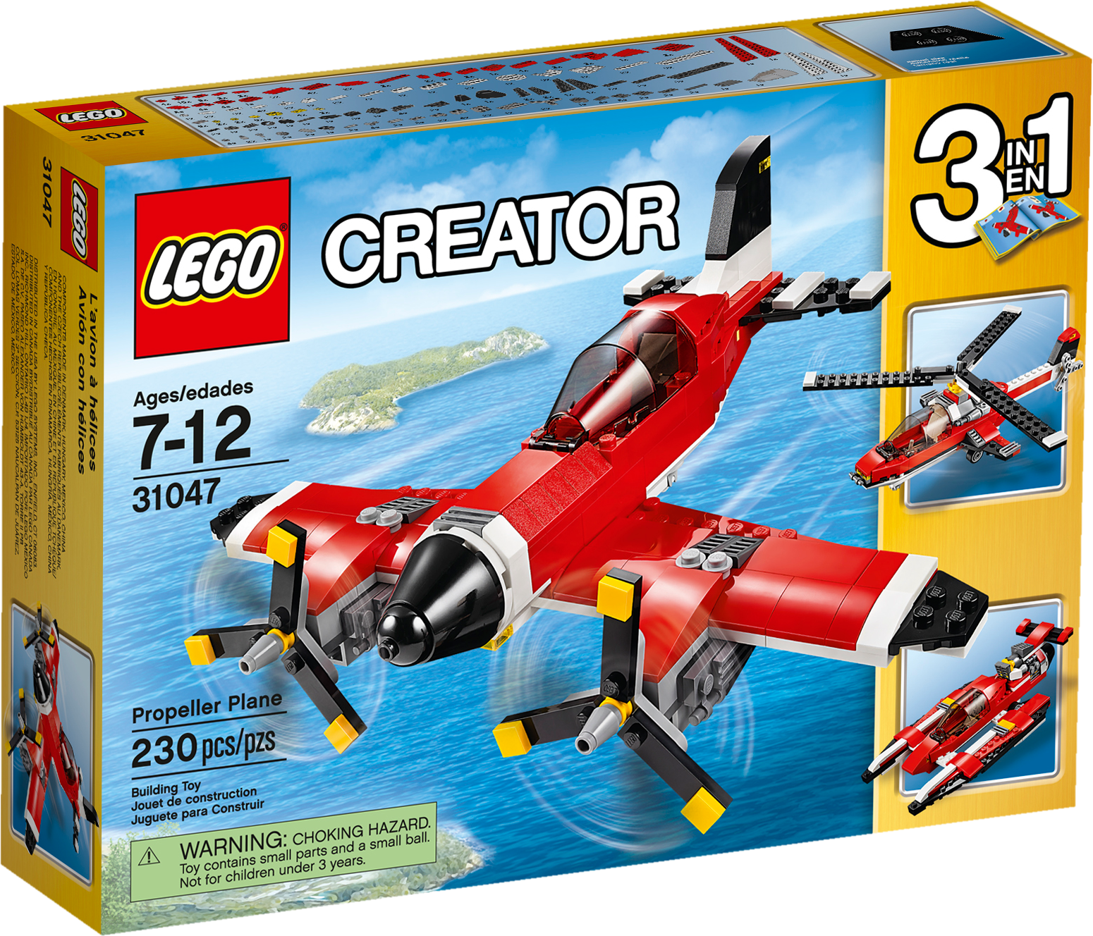 Take a flight in the cool 3-in-1 Propeller Plane! Experience this classic aircraft, featuring a beautiful red, white and black color scheme, spinning propellers and an opening cockpit with room for a minifigure (not included). Climb aboard, zoom down the runway and launch into the air. When you’ve completed your flight, lower the wheels to make a perfect landing! Rebuild to create a high-tech hydroplane or a helicopter. Features spinning propellers, retractable wheels and an opening cockpit with room for a minifigure (not included). Check out the red, white and black color scheme. Open the cockpit and climb aboard. Lower the wheels and make a perfect landing. This set offers an age-appropriate building experience for ages 7-12. Includes more than 225 LEGO® bricks. 3-in-1 model: rebuilds into a hydroplane or a helicopter. Propeller Plane measures over 4” (11cm) high, 7” (19cm) long and 9”(25cm) wide. Hydroplane measures over 1” (5cm) high, 8” (21cm) long and 4” (11cm) wide. Helicopter measures over 3” (8cm) high, 10” (26cm) long and 7” (20cm) wide.