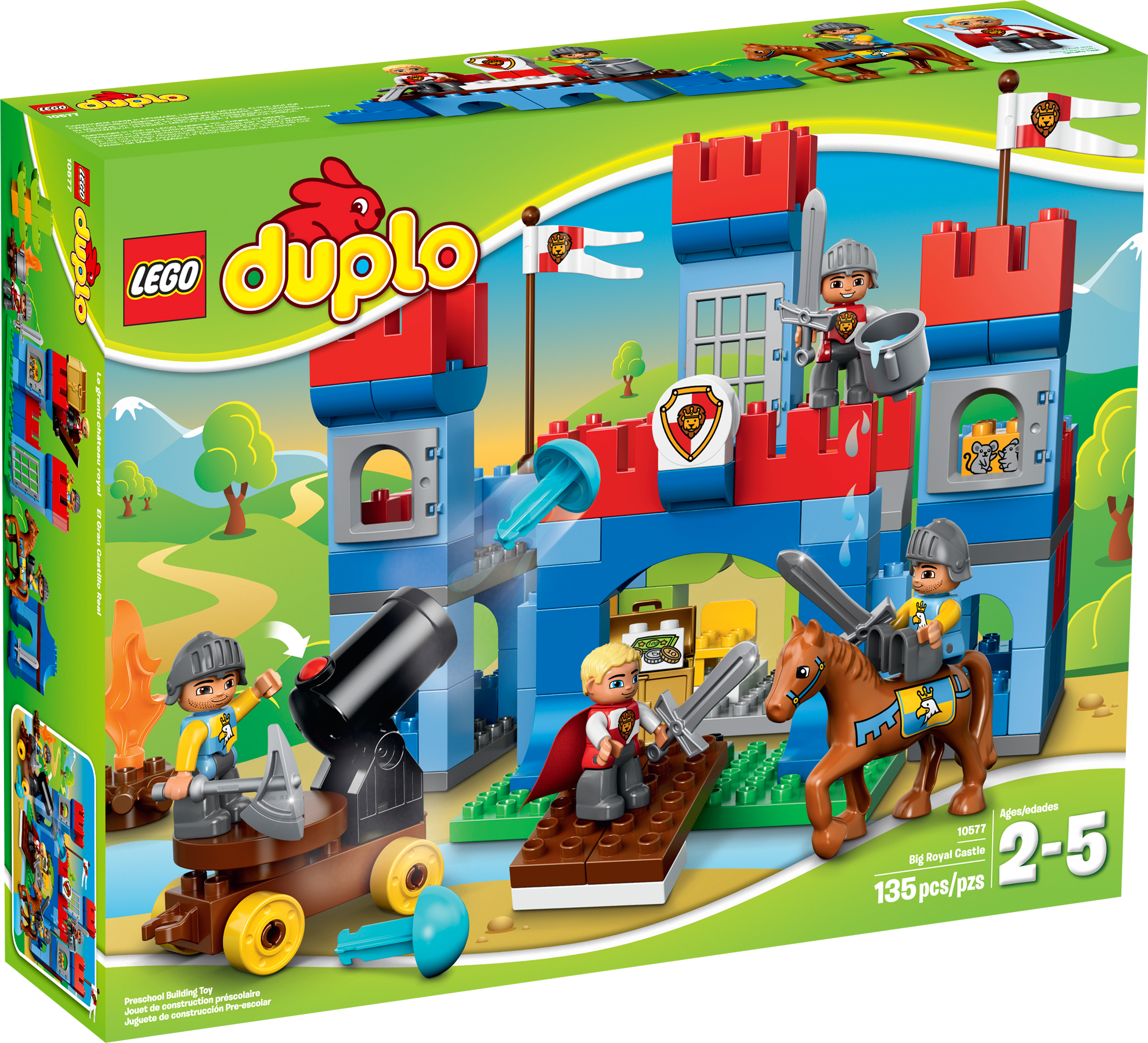 Raid the castle and take the King’s treasure! Storm the Big Royal Castle and let the play begin! Jump the drawbridge and fight the loyal knights to find the King and his treasure. This set has everything your child needs to create adventure after adventure. Help them grow and learn as they build the castle in many different ways using all the extra bricks and accessories to start their stories. Teach them about history as they enjoy role play between the King and the knights. The fun and action is endless!Includes 4 LEGO® DUPLO® figures: The King and 3 knightsFeatures the Big Royal Castle with towers, flags, drawbridge and opening windowsAccessories include a horse, swords, cannon, axe, throne, cauldron, treasure and fire element, and decorated bricks with mice and coinsJump the drawbridge and enter the castleBattle the King and the knightsFind the treasure and ride away on the horseHelp your child master construction skills with this big modelTeach your youngster about kings, knights and castles!LEGO® DUPLO® products are specially designed to be fun and safe for younger handsCastle measures over 11" (29cm) high, 12" (31cm) wide and 10" (27cm) deepCannon measures over 4" (11cm) high, 4" (12cm) long and 2" (6cm) wideHorse stands over 4” (11cm) tallMakes an ideal addition to any LEGO® DUPLO® town collection