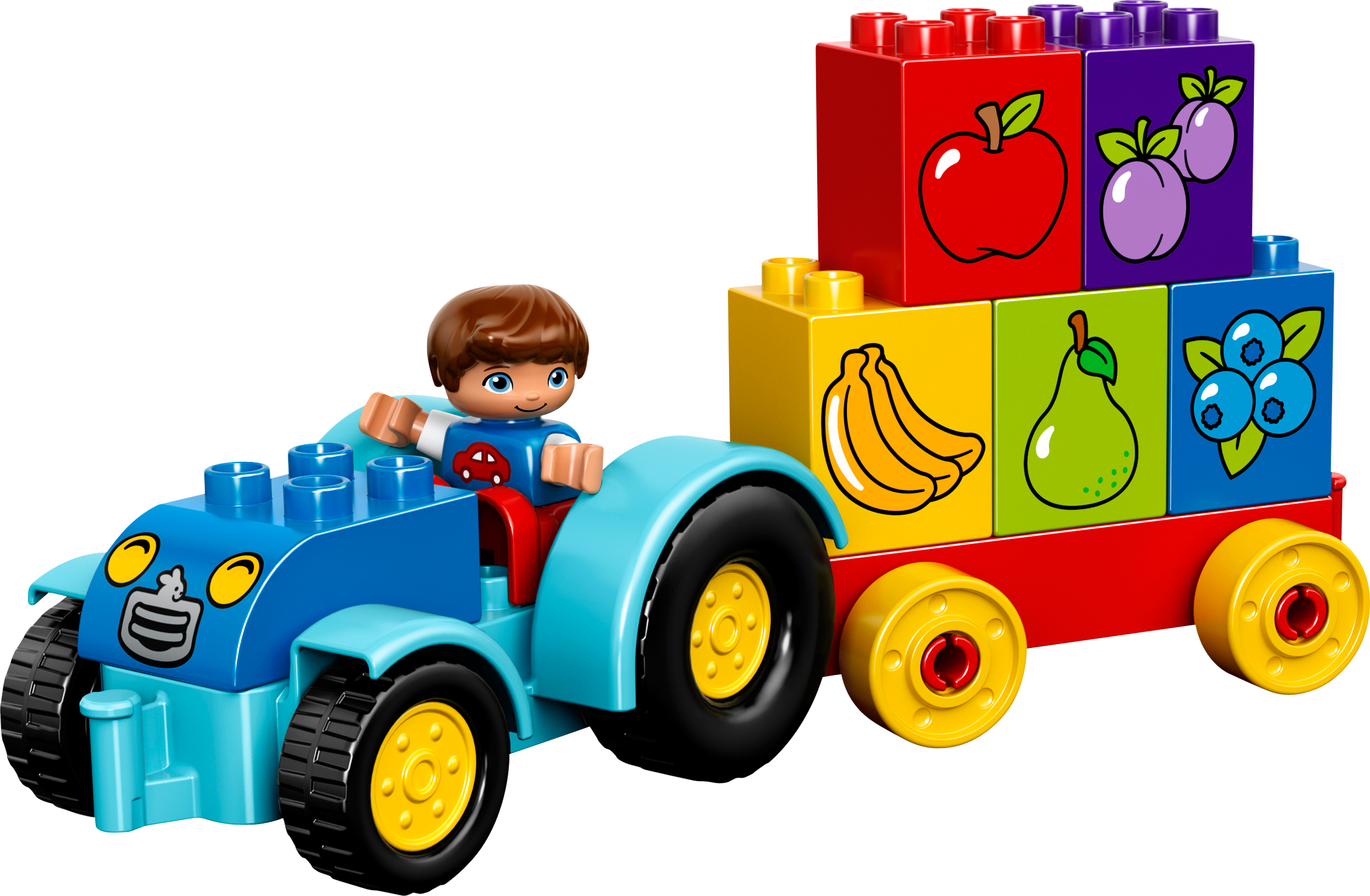Learn about colors and fruits with this easy-to-build set! Play and learn with LEGO® DUPLO® My First Tractor! Put the chunky pieces together to build the tractor, then stack and unload the colorful fruits in the basket. Teach your child about colors and fruits with the special decorated bricks. Start your stories with this easy-to-build set including large LEGO DUPLO bricks that are designed especially to be safe and suitable for little hands. Includes 2 child LEGO DUPLO figures. Includes 2 child LEGO® DUPLO® figures Features a buildable tractor and basket Includes 6 brightly colored decorated bricks featuring different fruits Toddlers will love the easy-to-build tractor with rolling wheels Play with your toddler while introducing colors and fruits Create fun role play scenarios with the LEGO® DUPLO® figures LEGO® DUPLO® products are specially designed to be safe and suitable for small hands Tractor measures over 4" (11cm) high, 9" (23cm) long and2" (7cm) wide Combine with 10617 LEGO® DUPLO® My First Farm to extend developmental learning and play opportunities