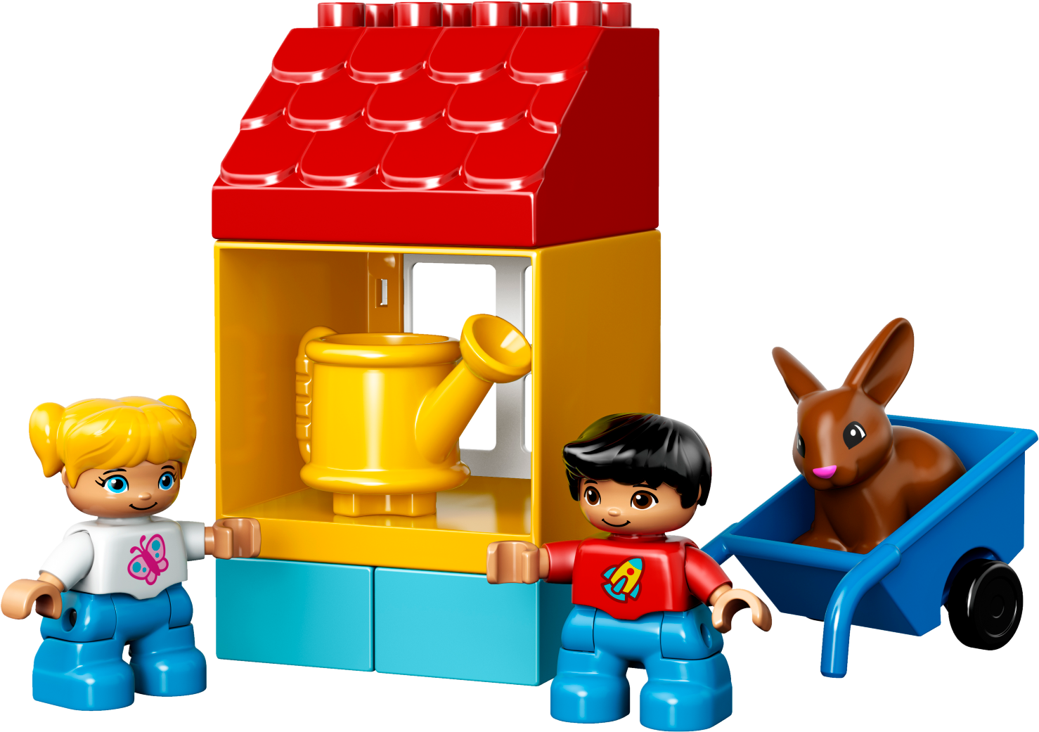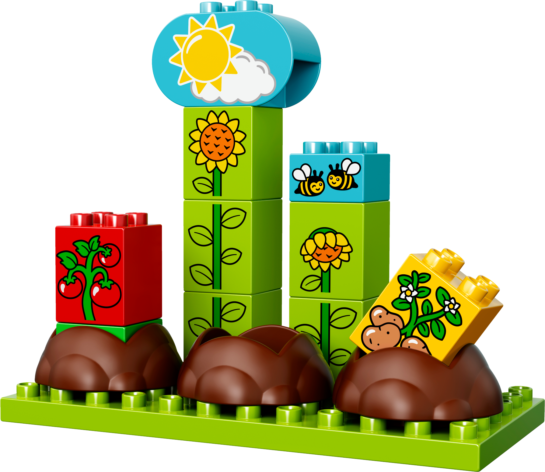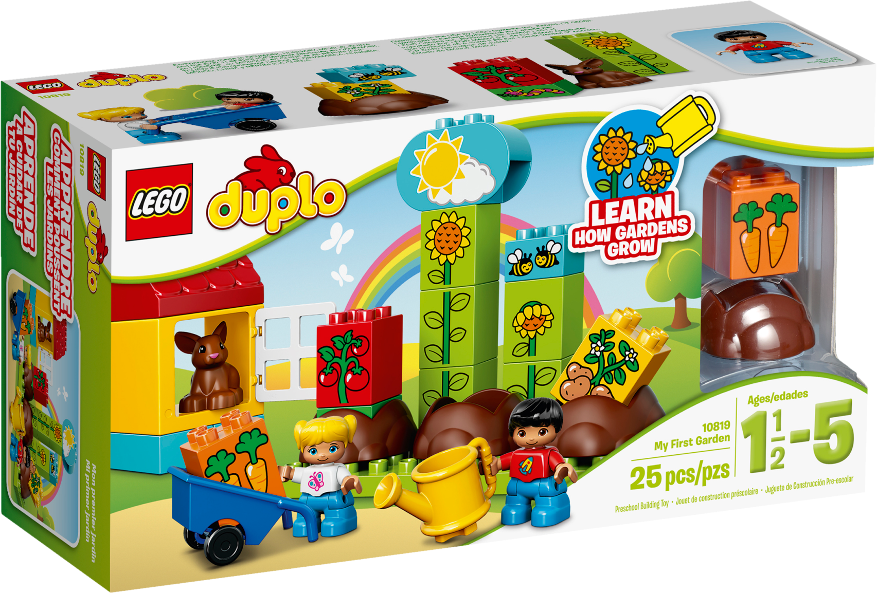 See how your garden grows with LEGO® DUPLO®! My First Garden develops early building skills as toddlers stack the bricks to make their plants grow, with sunflowers, tomatoes, carrots and potatoes to choose from. Use the rain/sun decorated brick to help your child learn about how plants grow from the ground to flower or fruit. LEGO® DUPLO® bricks are specially designed to be safe for little hands. Includes 2 child DUPLO figures plus a bunny. Includes 2 child LEGO® DUPLO® figures plus a bunny. Features a buildable garden and a rabbit hutch with an opening door. Accessories include a wheelbarrow, watering can and 3 hide-and-seek bricks as soil. Also includes bricks decorated as a worm, bees, carrots, potatoes, tomatoes and stalks, as well as double-sided bricks decorated as sunshine/rain and blooming/drooping sunflowers. Stack the bricks and watch your garden grow. Use the double-sided weather brick to choose sunshineor rain. Build the hutch for the friendly bunny and give it some carrots. Help your child master basic building skills while learning about gardens and nature. Toddlers will love creating role-play stories with a garden theme. LEGO® DUPLO® products are specially designed to be fun and easy for little hands. Garden model with sunflowers measures over 6” (16cm) high, 7” (19cm) wide and 3” (9cm) deep.