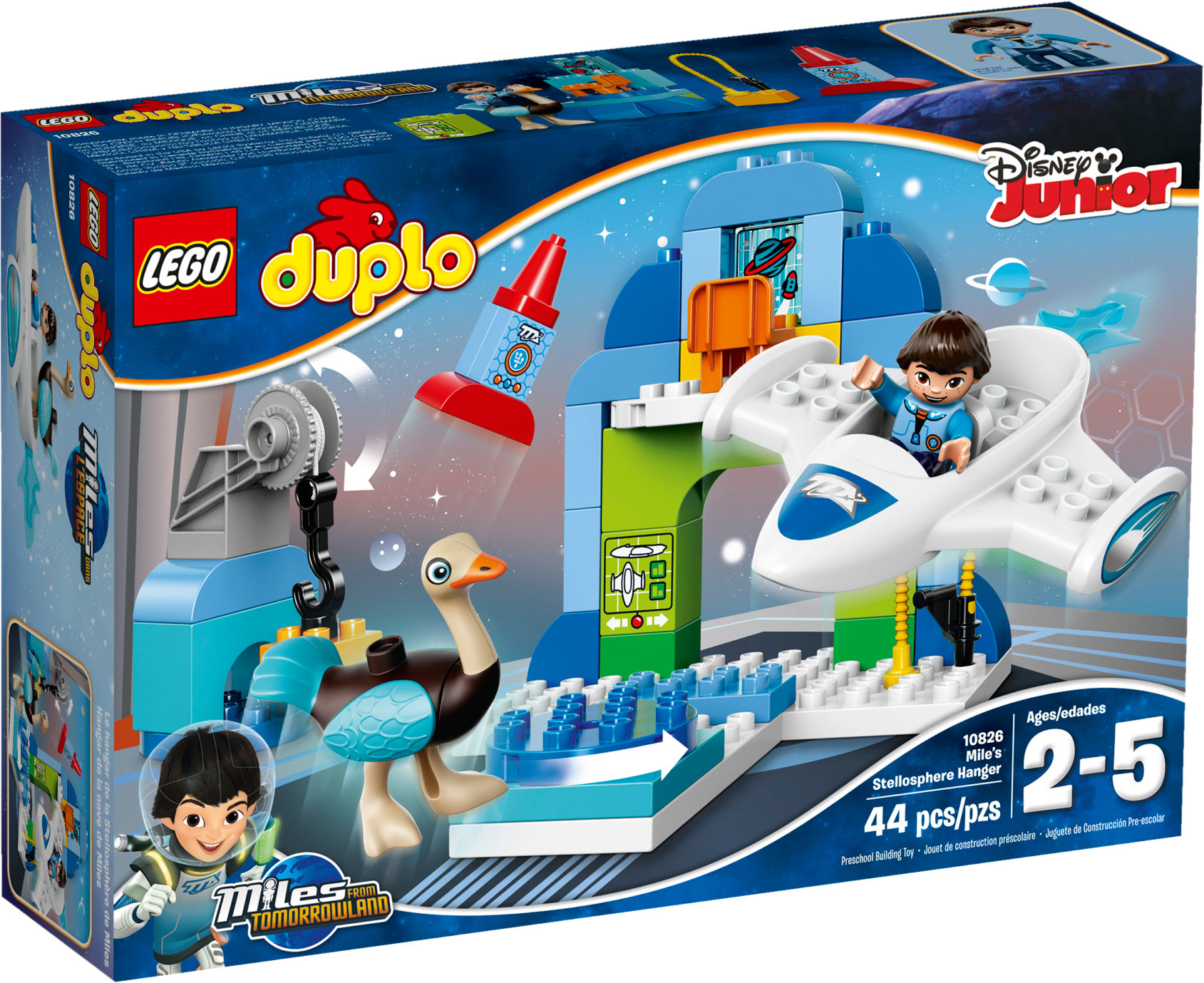 Cruise away on a space mission in Miles’ Spaceship! Little astronauts will love Disney Miles From Tomorrowland. The outer space environment provides endless opportunities for exploration and role play, with all the different tools any space explorer could need. Young children can build and rebuild the Stellosphere Hangar then blast off in Miles’ Spaceship! Includes a LEGO® DUPLO® figure: Miles plus Merc. Includes a LEGO® DUPLO® figure: Miles plus Merc. Features the Stellosphere Hangar with a spaceship, turntable, crane, rocket, refueling pump and a chair. Prepare Miles’ amazing spaceship for takeoff. Create your own space stories with these lovable Disney characters. With the hangar, crane, turntable and rocket to build, there are so many opportunities for creativity in this set. Accessory elements include a blue flame and bricks decorated as a planet monitor, spaceship monitorand rocket decoration as story starters. Help your child master basic construction skills by building and rebuilding this simple model. LEGO® DUPLO® products are specially designed to be fun and easy for little hands. Space station measures over 7” (19cm) high, 7” (19cm) wide and 8” (22cm) deep. Spaceship measures over 6” (17cm) long, 5” (15cm) wide and under 1” (2cm) high. Combine with 10824 Miles´ Space Adventures for even more Disney Miles From Tomorrowland fun.