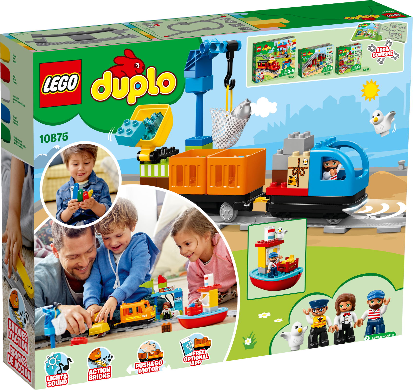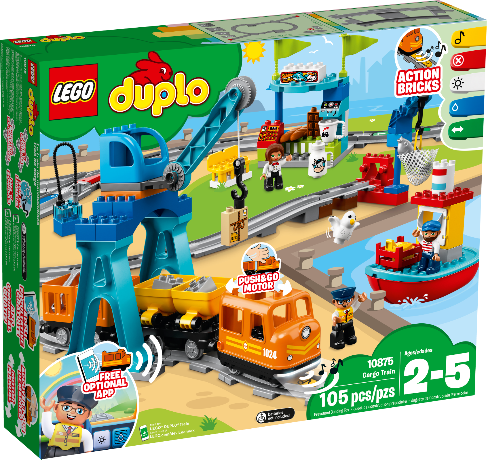 Features a buildable Push & Go locomotive with lights and sounds, 2 cargo trucks with tipping function, 5 color-coded action bricks, harbor area with small crane and boat, large crane, café, loading/unloading station and 24 pieces of track including switches, hills, a crossing and stops.