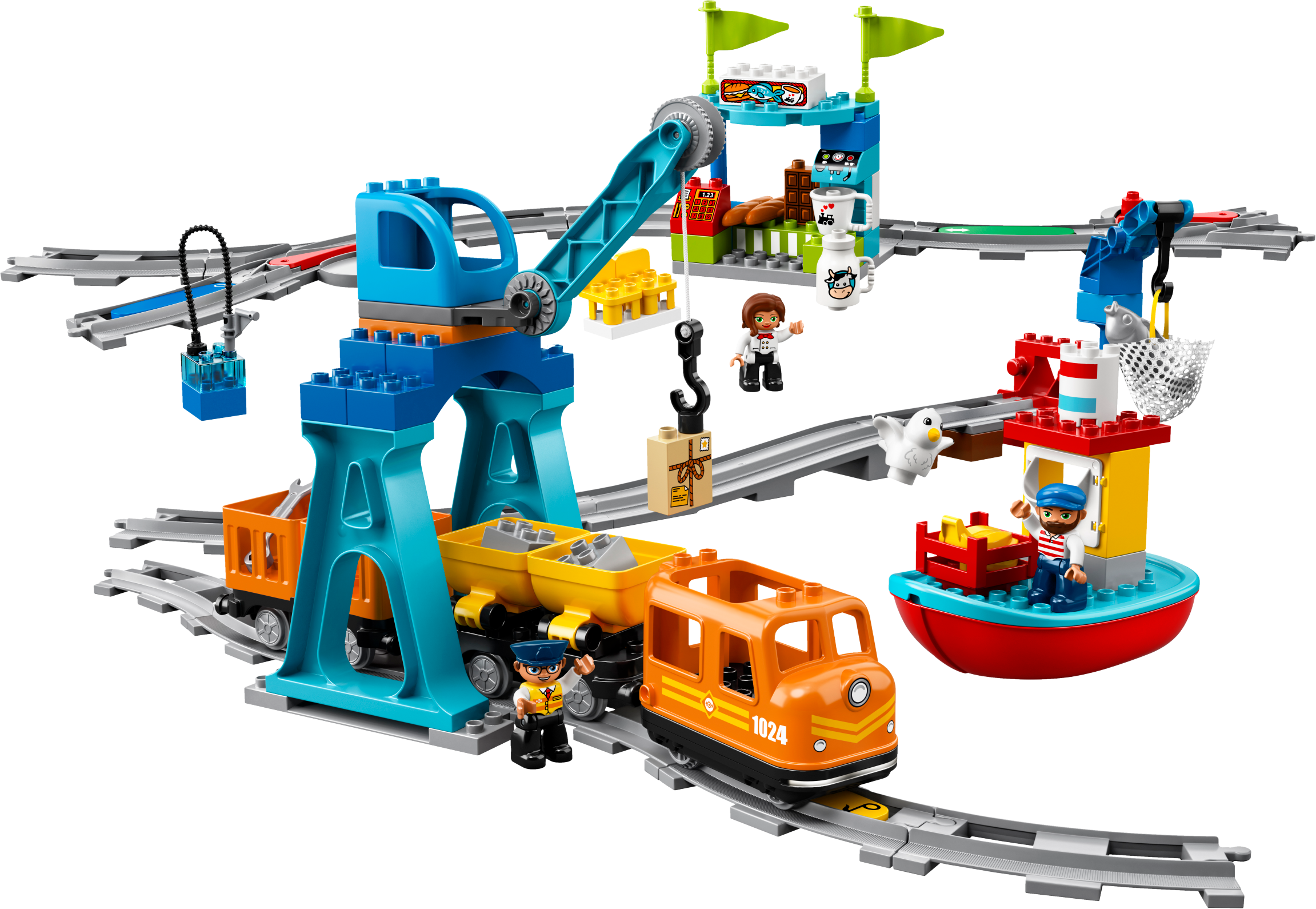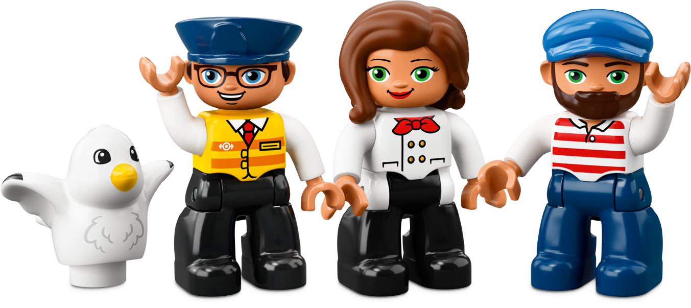 Includes cargo train driver, captain, and shopkeeper LEGO® DUPLO® figures, plus a seagull figure.