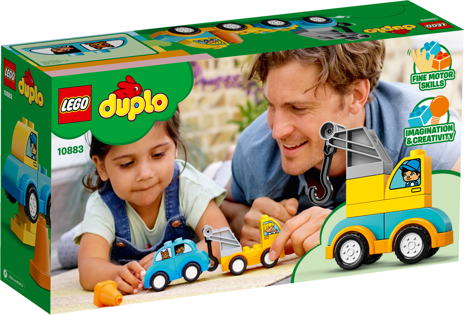 Your child will love to rescue the broken-down car over and over again with LEGO® DUPLO® 10883 My First Tow Truck for toddlers. It’s easy to build and develops fine motor skills, while the toy tow truck and car have window bricks decorated with characters to encourage role-play. This compact little set is a great preschool toy to take and play wherever you go! DUPLO bricks are specially designed to be safe for little hands. Features a tow truck for kids with hook and a car. Also includes a traffic cone element. Help your child master basic construction skills with these 2 simple vehicles, then hook the car onto the toy truck and drive it away! Encourage language development and pretend play as young children play out breakdown and rescue situations. The endless creative play possibilities of LEGO® DUPLO® toys set the stage for toddlers to become creative thinkers. LEGO® DUPLO® products are specially designed to be fun and easy for little hands. Makes an ideal preschool toy for toddlers. Tow truck toy measures over 1” (7cm) high, 3” (12cm) long and 2” (6cm) wide. Car measures over 2” (6cm) high, 3” (9cm) long and 2” (6cm) wide.