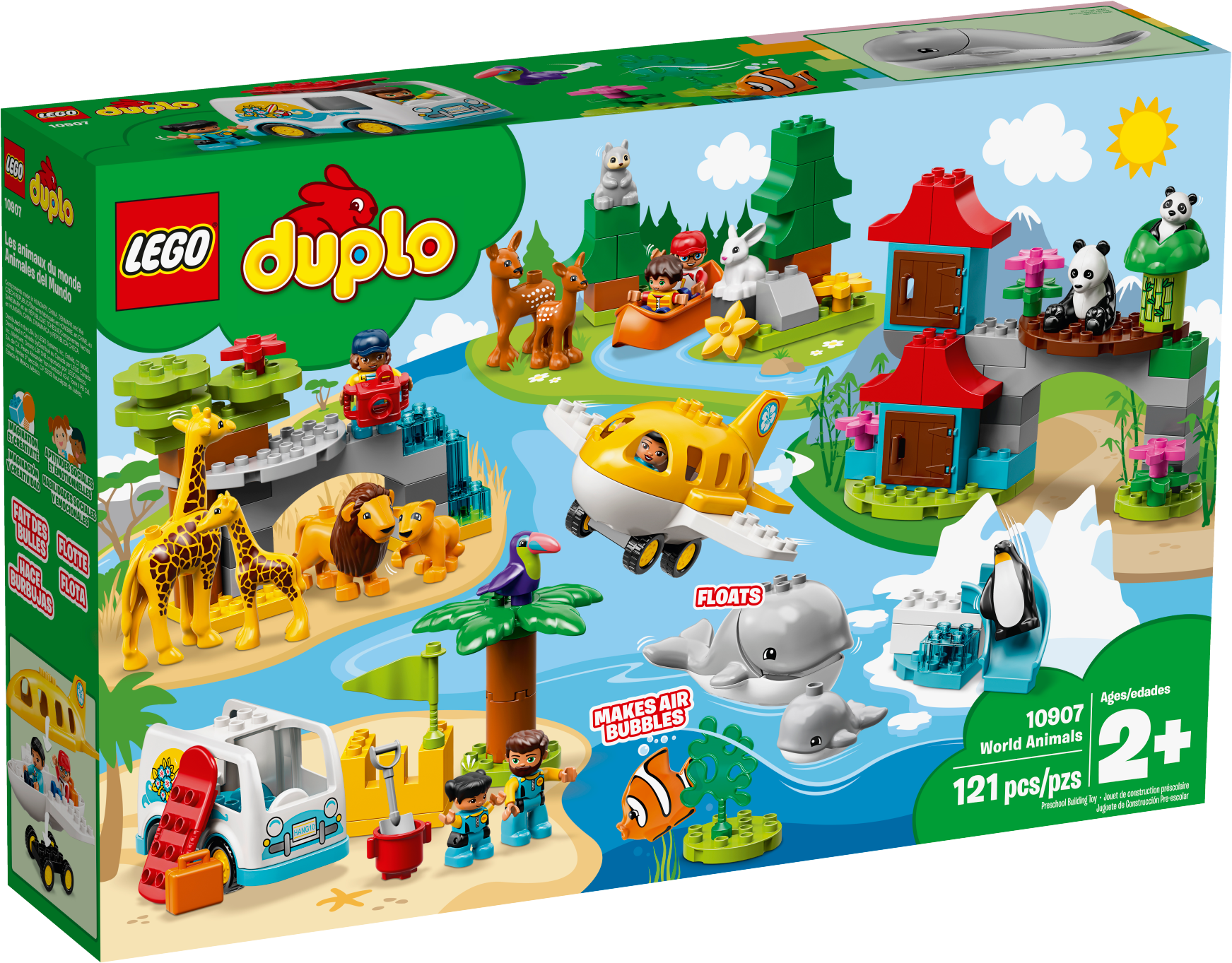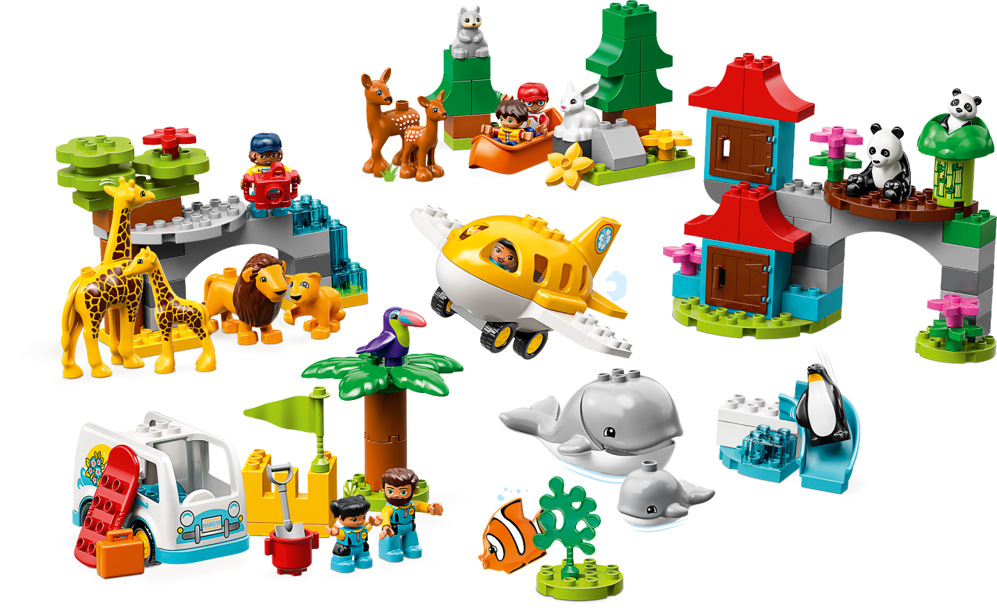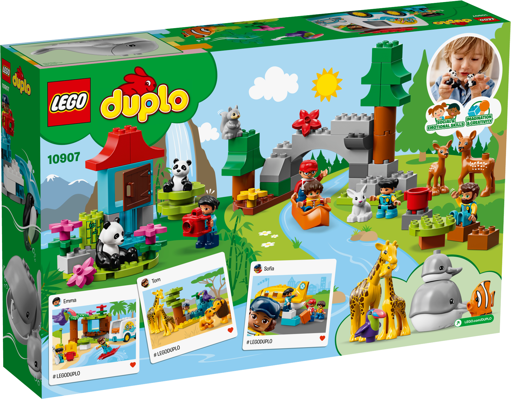 Introduce your toddler to a world of animals and environments with the LEGO® DUPLO® 10907 World Animals playset! Take a safari across the African savannah and pretend to photograph lions and giraffes, spot cute woodland creatures as you canoe along a woodland river, build a sandcastle on a tropical beach, go whale watching at the south pole… With a captivating range of toy animals, buildings, vehicles, characters and accessories, this globe-spanning educational toy for toddlers contains endless opportunities to engage and inspire any preschooler. Includes 6 LEGO® DUPLO® figures: a traveler, pilot, surfer dad and child, and a canoer dad and child. Also includes 15 DUPLO® toy animal figures: an adult and baby giraffe, adult and baby lion, adult and baby panda, adult and baby deer, adult and baby whale, penguin, toucan, fish, rabbit and a squirrel. This toddlers' adventure toy features a surf van, airplane and canoe, plus 5 buildable environments representing 4 unique and distinctive worlds: a forest, a savannah, a tropical beach and Antarctica. Accessory elements include a surfboard, camera, travel case, spade and drinking mug. Savannah measures over 6” (17cm) high, 8” (22cm) wide and 2” (6cm) deep. Temple measures over 7” (20cm) high, 10” (27cm) wide and 3” (9cm) deep. Car measures over 3” (9cm) high, 5” (14cm) long and 2” (6cm) wide. Airplane measures over 4” (11cm) high, 7” (18cm) long and 7” (19cm) wide.
