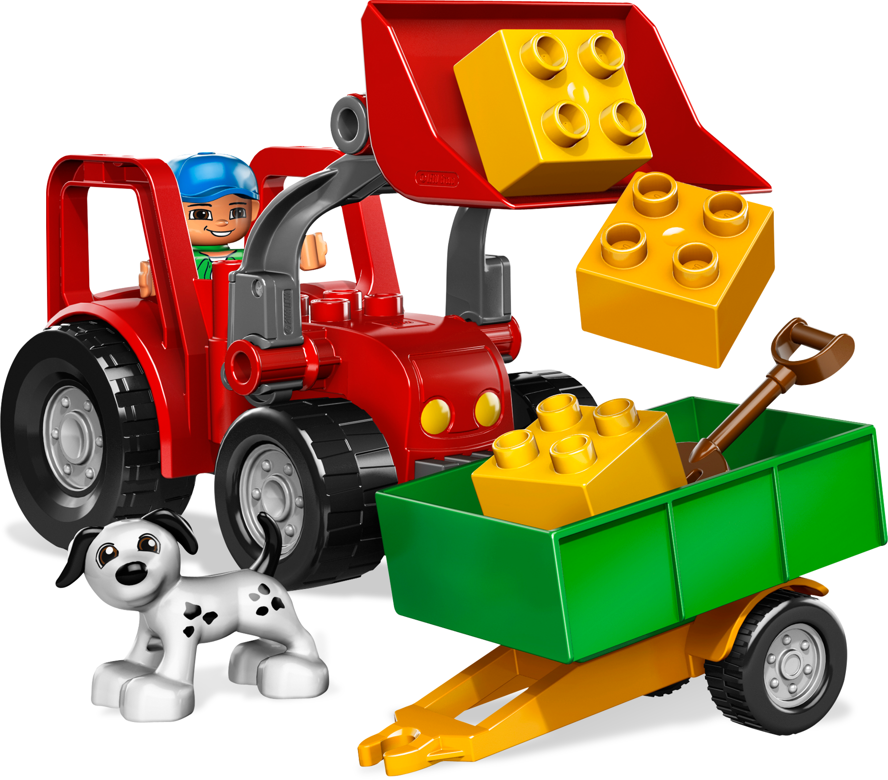 Farm work is hard, but this trusty red Tractor is here to help! It’s harvest time on the farm, and the Farmer and his cute dog are going to be busy with work. Good thing they have this sturdy, safe tractor to help them get around! Includes tractor, cart, farmer and moreFarm tractor and wheeled cart help the farmer harvest his crop!Tractor and cart measure over 15" long