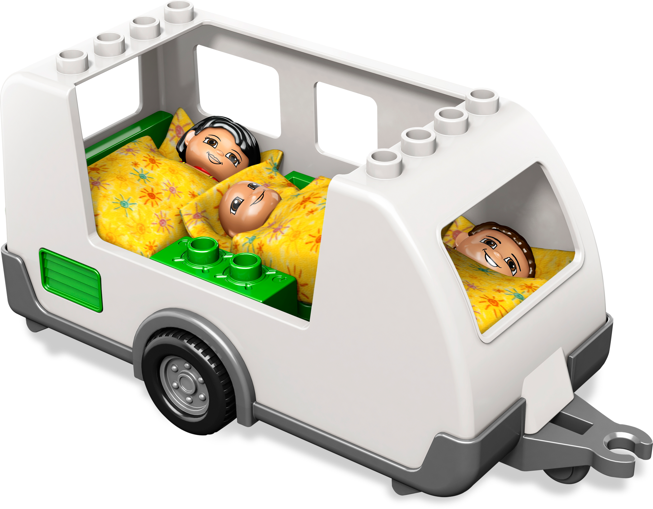 Summer time is great for a camping trip! Summer’s here and the weather’s warm so it’s the perfect time for a camping trip! While Mom entertains the baby, Dad is busy barbecuing dinner! Includes Mom, Dad and baby LEGO® DUPLO® figures; caravan and car plus more fun accessories!Includes 3 LEGO DUPLO figures: Mom, Dad, and babyFeatures 3 cloth sleeping bags, barbecue, 3 chairs, bread, flower and flower potCaravan measures over 7" (17cm) longCar measures 5" (12cm) long