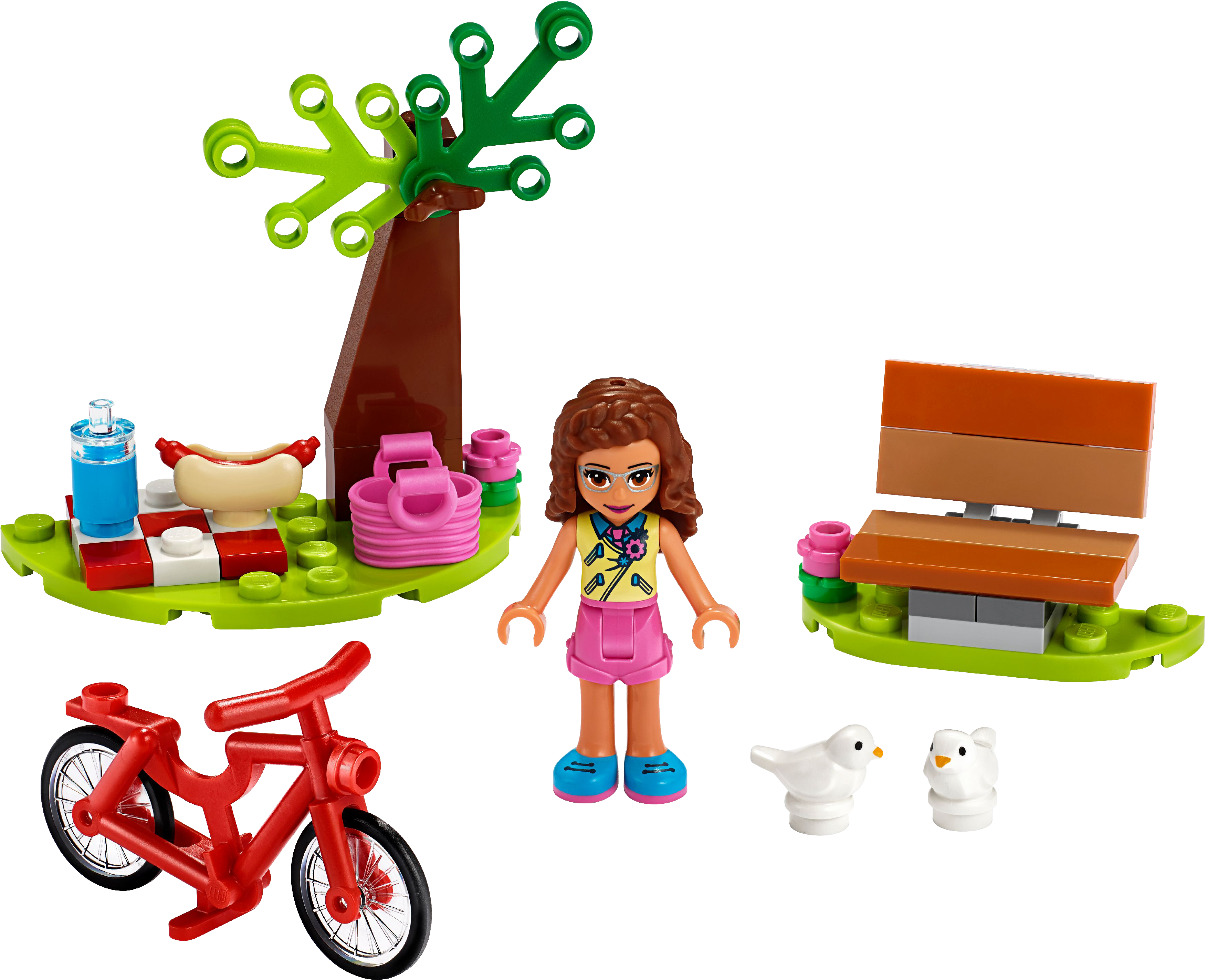 Build this bench so Olivia can take a break from her bike ride and relax in the park while she enjoys lunch. Unpack her picnic bag and lay out the food under the tree. Introduce children to LEGO Friends, where kids can play out the adventures of the TV series, meeting LEGO® Friends characters that are just like them. In Heartlake City they'll always have a buddy they can explore their interests with, because there's always room for one more friend.