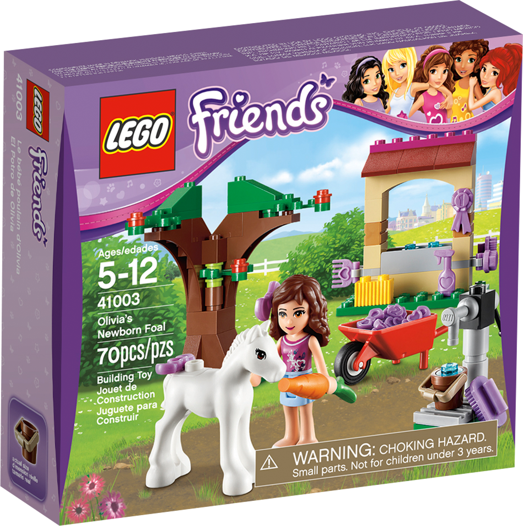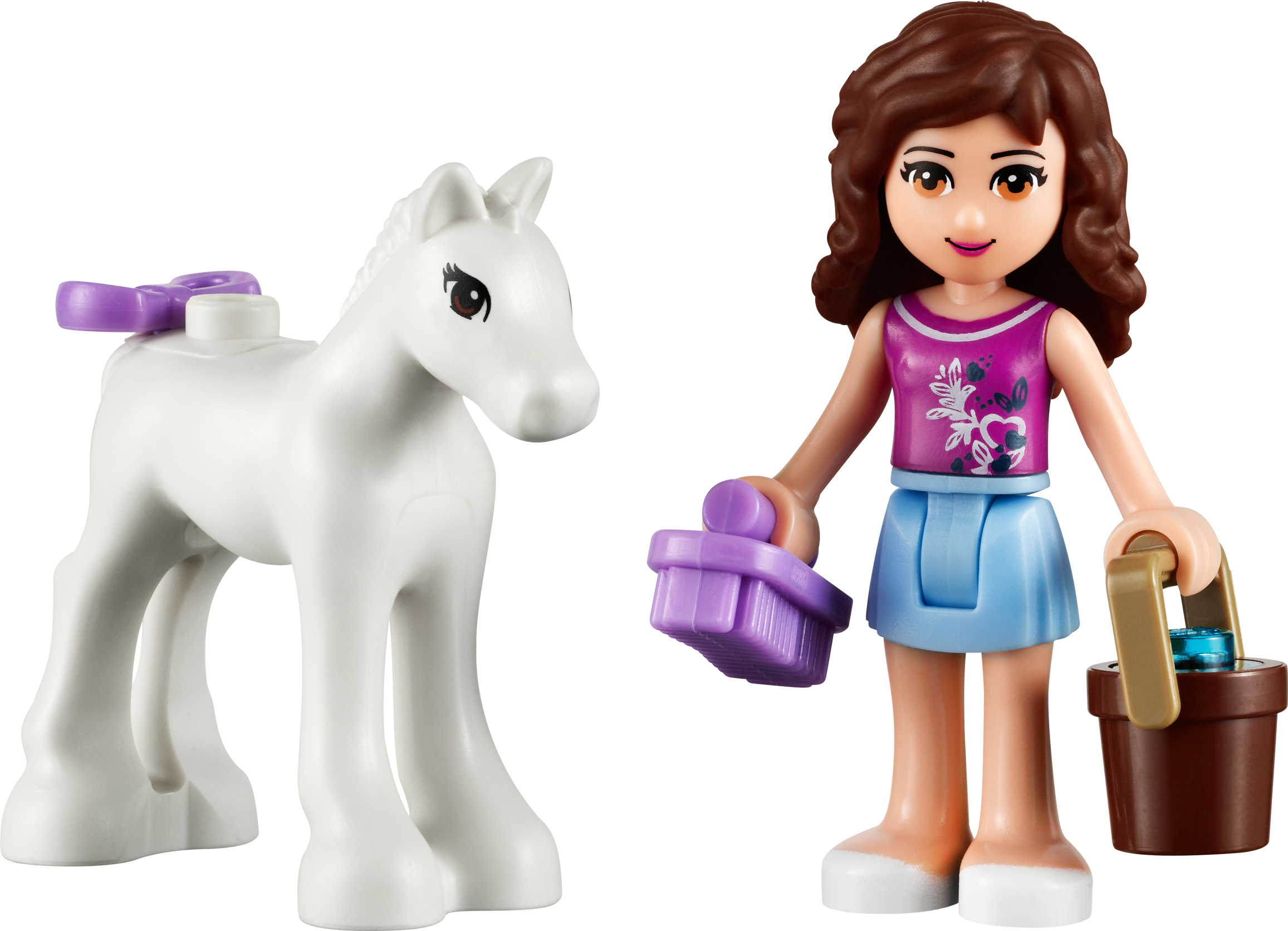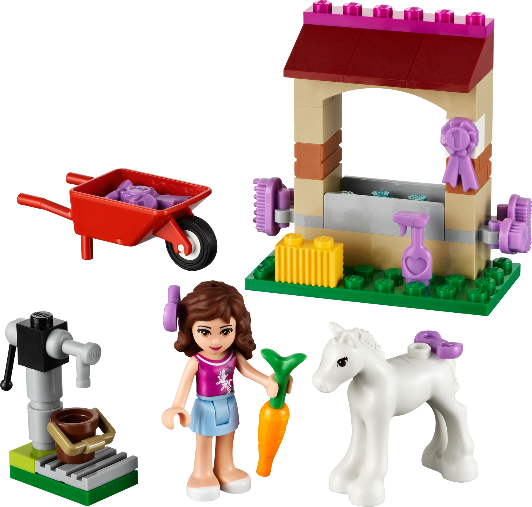 Take care of the Newborn Foal! Take care of the newest arrival in the Heartlake City stables with Olivia and fun accessories! Get water from the moving pump to fill up the trough and feed the foal with the carrot! Then use the wheelbarrow to collect the hay for the foal under the buildable tree. Groom her with the accessory pack including ribbons, brushes and combs to make her very pretty! Includes Olivia mini-doll figure.• Includes Olivia mini-doll figure• Features a foal, tree, wheelbarrow and moving water pump, shelter with trough• Accessories include a bucket, hay, flowers, a carrot, prize ribbon and a grooming accessory pack with bows, brushes, combs and ribbons• Move the water pump up and down!• Collect the hay with the wheelbarrow!• LEGO® Friends pieces are fully compatible with all LEGO bricks• Collect all of the LEGO Friends sets for a whole world of LEGO Friends fun!• LEGO mini-dolls are LEGO figures made especially for the world of LEGO Friends that can be customized and combined in thousands of ways • Measures over 3" (9cm) high, 2" (6cm) wide and 6" (16cm) long