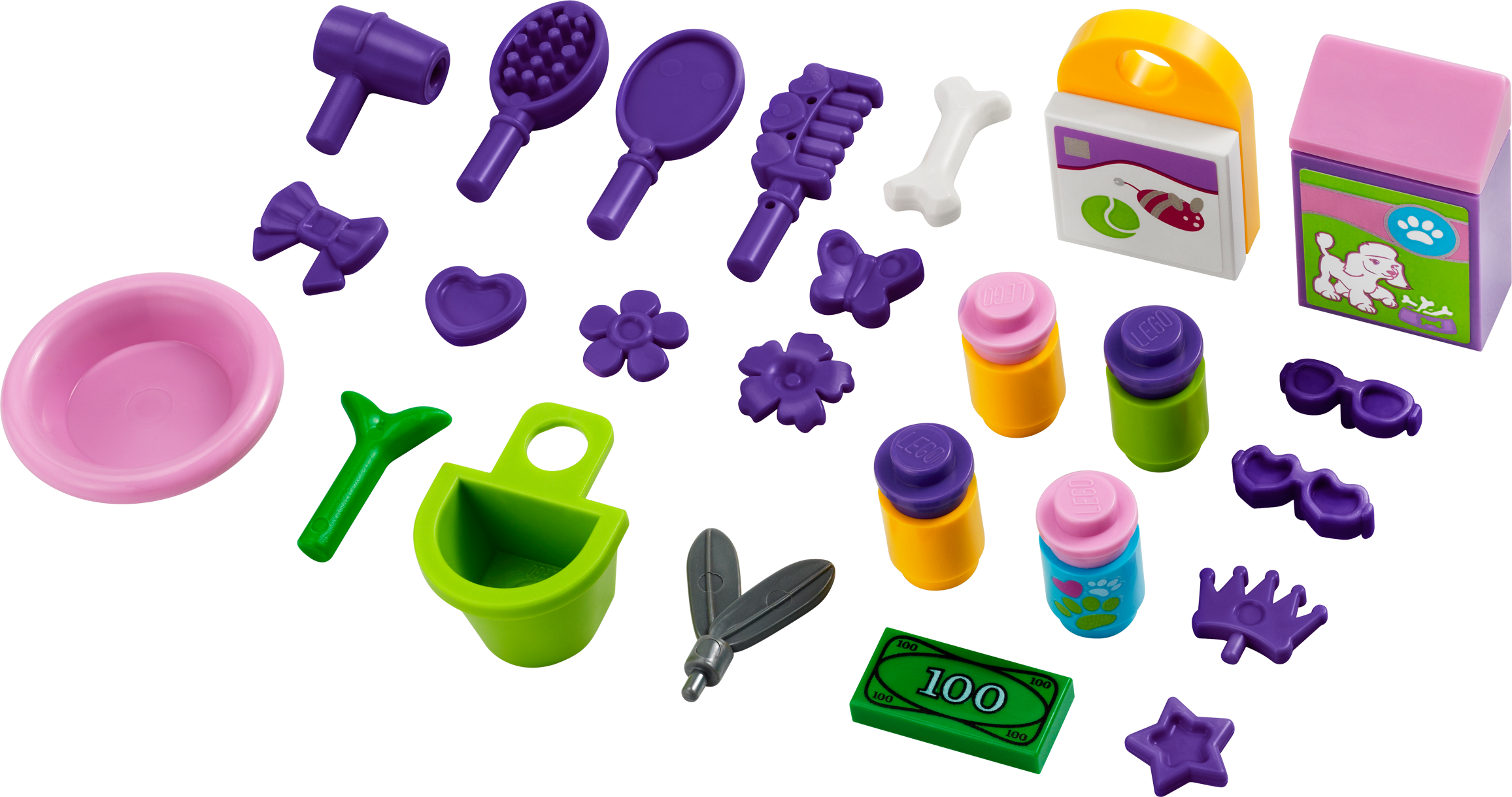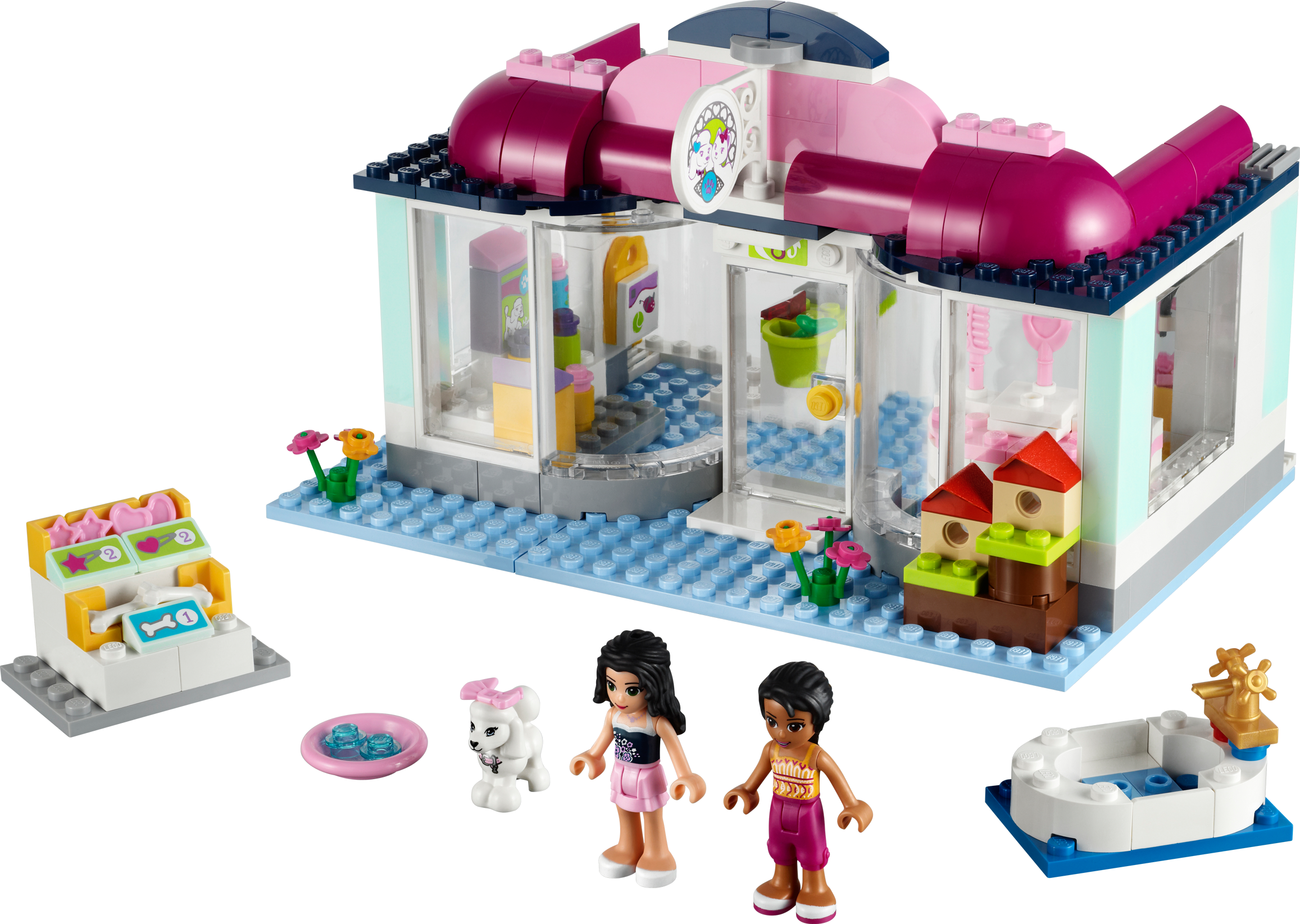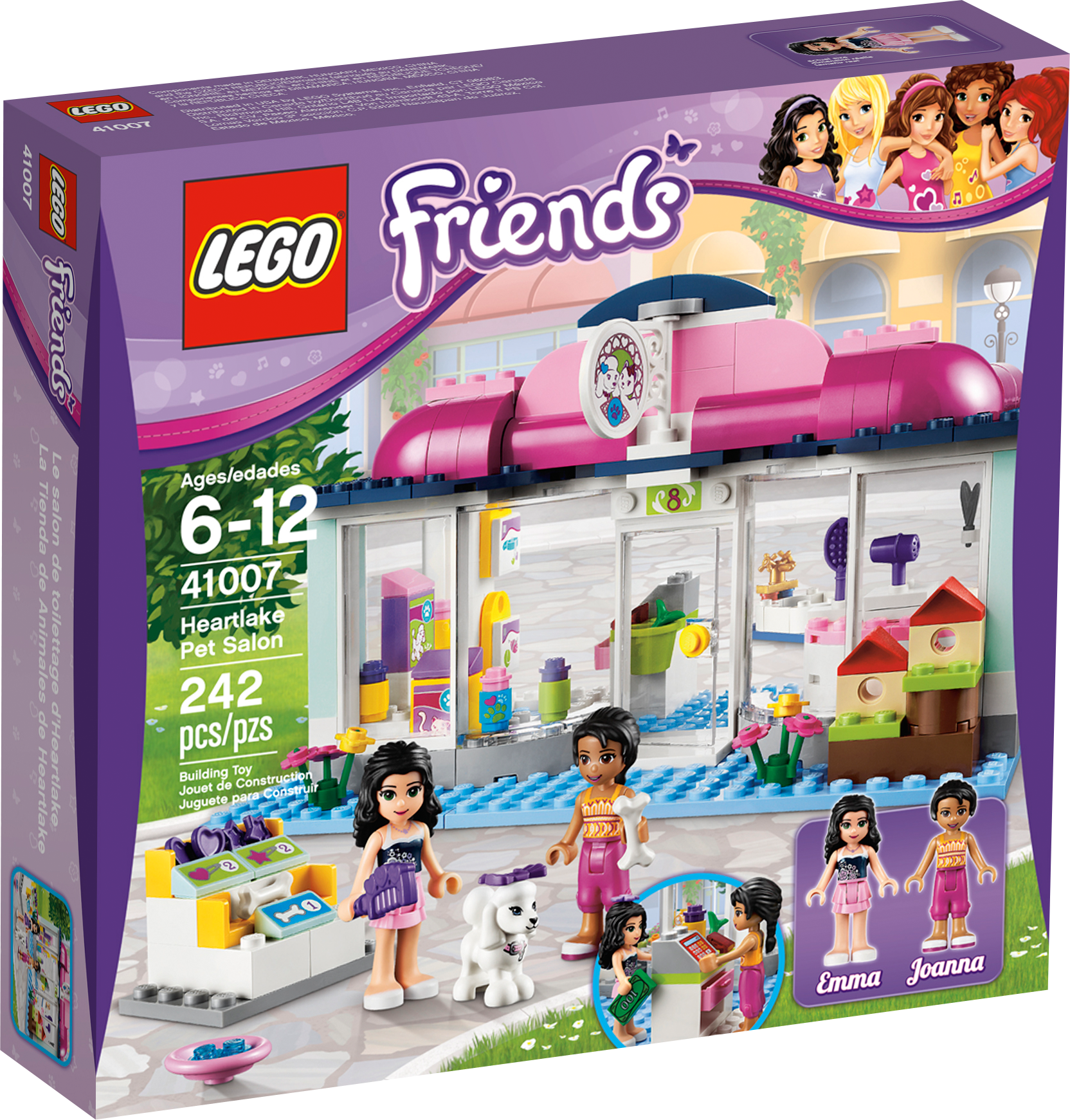 Pamper every pet at the Heartlake Pet Salon! Celebrate the grand opening of the Heartlake Pet Salon! Everyone's excited to check it out! Help Emma to shampoo her friend Joanna's pretty white poodle in the bubble bath, then trim and clip her on the rotating grooming table. Use the blow dryer and brushes to make her perfect! While Joanna is waiting for her puppy to be groomed, help her to shop for new pet food and lots of accessories in the salon's shop. Then fill up the water dish at the tap for the poodle to drink. With all of these accessories and functions, you can really pamper all of the pretty pets in Heartlake City! Includes Emma and Joanna mini-doll figures and a poodle.Includes Emma and Joanna mini-doll figuresFeatures poodle, rotating grooming table, bath tub, birdhouses, shop counter, accessory stand, water dish and faucetAlso includes purple hair accessories, grooming tools, pet food, decorated bottles and hanging packages with pet accessoriesShop for everything your pet needs!Rotate the grooming table!Customize your model by moving the different elements around in the shop!LEGO® Friends pieces are fully compatible with all LEGO bricksCollect all of the LEGO Friends sets for a whole world of LEGO Friends fun!LEGO mini-dolls are LEGO figures made especially for the world of LEGO Friends that can be customized and combined in thousands of waysMeasures over 4" (12cm) high, 5" (13cm) wide and 8" (22cm) long