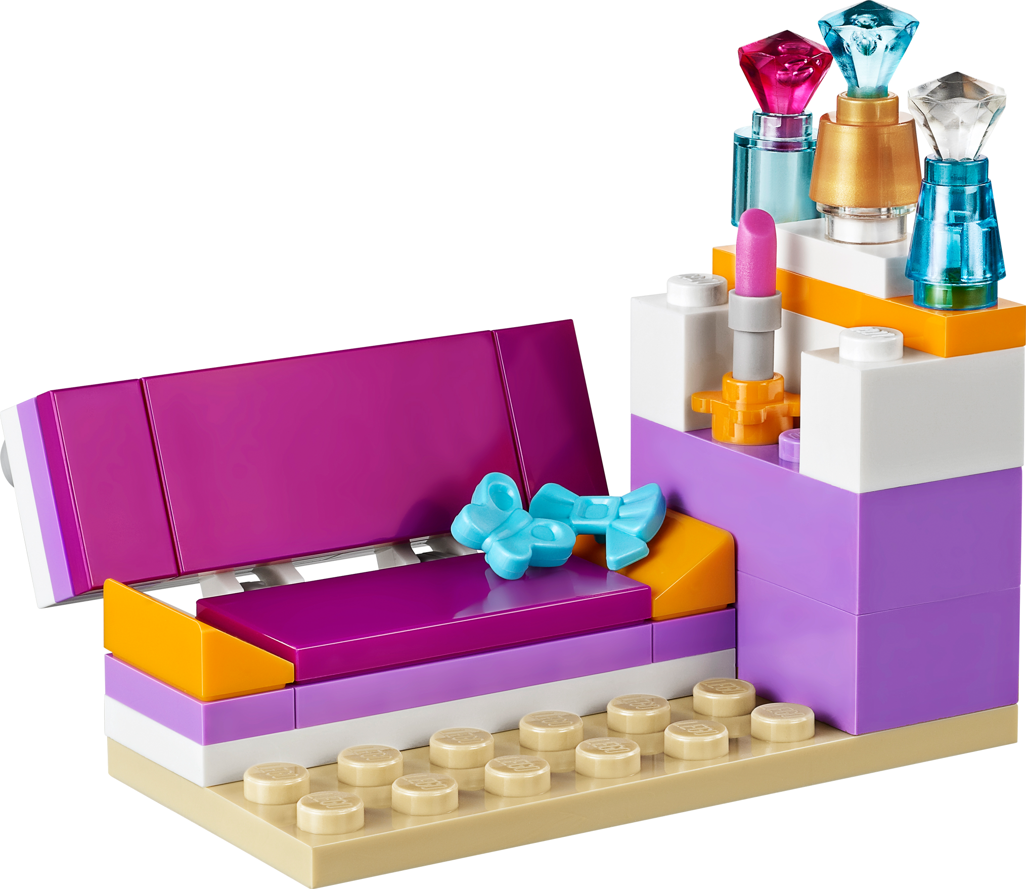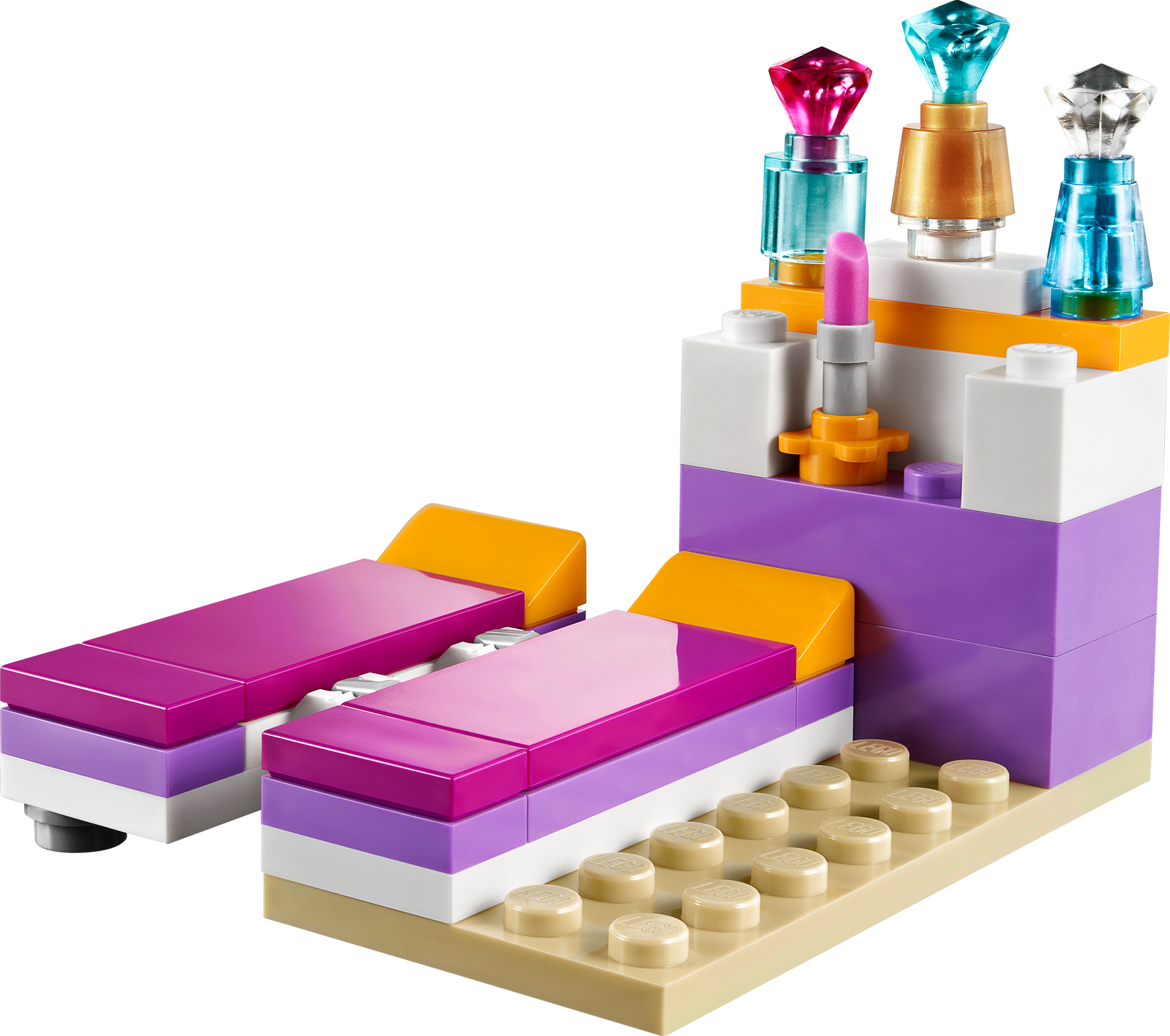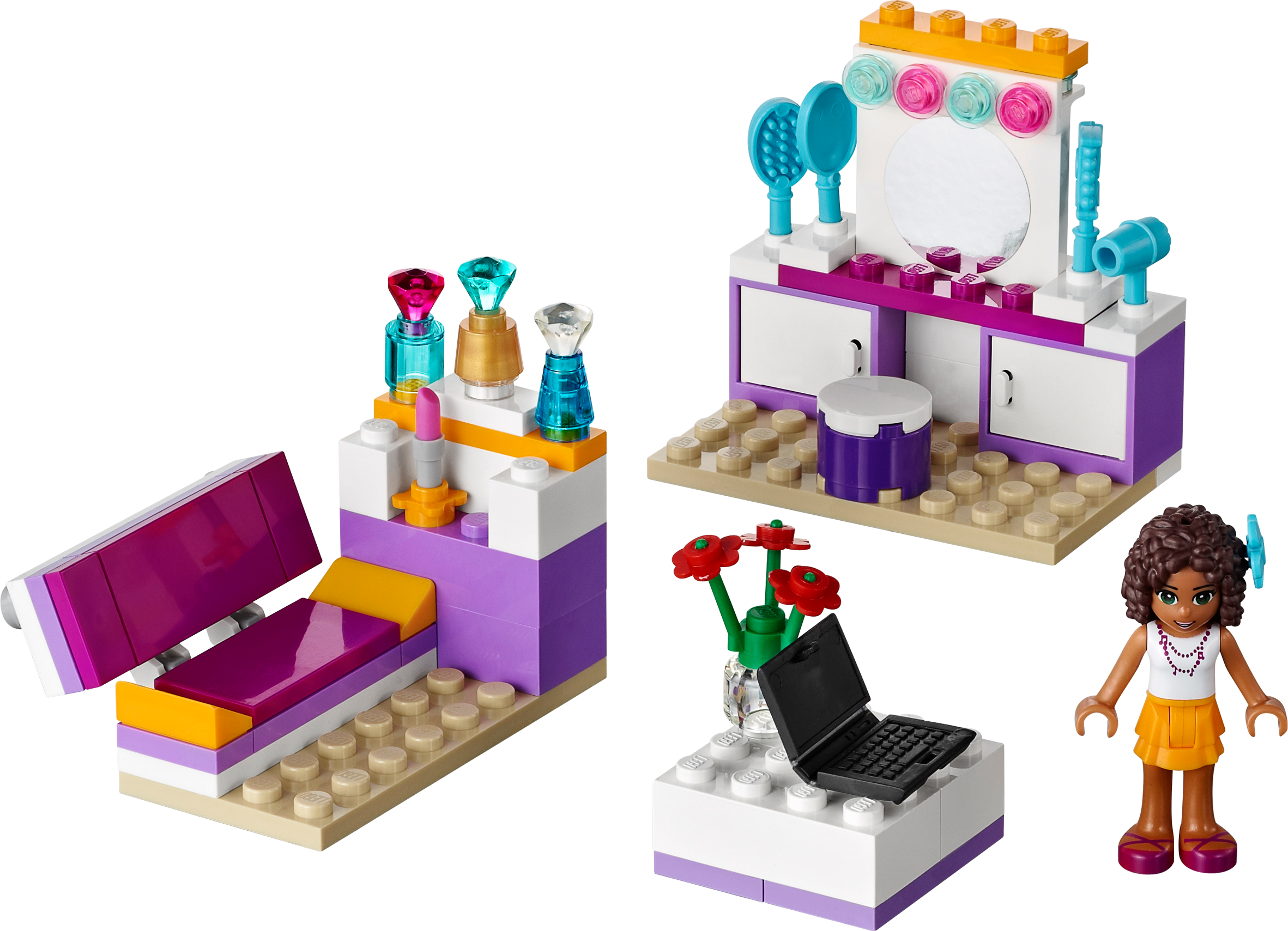 Hang out or host a sleepover in Andrea’s Bedroom! Andrea loves playing in her pretty bedroom. It’s so much fun to style her hair in front of the vanity with its stool, mirror and accessories. Put on lipstick, and then pick the perfect perfume for the day from her super-cool collection of fancy perfume bottles! Before the LEGO® Friends arrive for a sleepover, Andrea waters her pretty flowers and updates her blog with her laptop. Fold down her cool sofa into a bed before her friends arrive! Includes Andrea mini-doll figure.• Includes Andrea mini-doll figure• Features makeup vanity and stool with hair accessories, coffee table with flower vase and laptop, convertible sofa with stand for perfume bottles and lipstick• LEGO® Friends pieces are fully compatible with all LEGO System bricks• Collect all of the LEGO Friends sets for a whole world of LEGO Friends fun!• LEGO mini-dolls are LEGO figures made especially for the world of LEGO Friends that can be customized and combined in thousands of ways• Measures over 2" (6cm) high, 6" (16cm) wide and 1" (3cm) deep