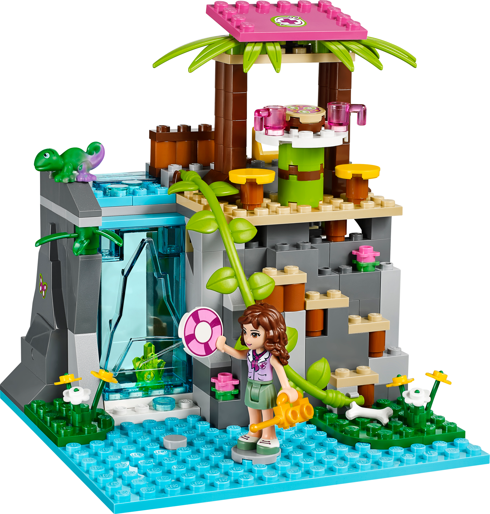 Rescue the tiger cub from the water and explore the beautiful Jungle Falls! Help the tiger in trouble at the beautiful but powerful Jungle Falls! Rush to the riverside and find the tiger stranded in rough waters. Wade in and help Olivia build a dam to stop the waterfall before pulling the tiger to safety. Then head up to the cliff-top hut to cool down with a drink and some fresh fruit salad in the company of the friendly chameleon. Later you can explore the jungle caves together. Who knows what treasures you will find! Includes Olivia mini-doll figure, a tiger cub and a chameleon Features a cliff with stairs, waterfall with dam function, cliff hut with table and stools, trees, flowers and a flexible vineAccessories include driftwood, glasses, fruit salad plates and a precious gem Slide the dam across and stop the waterfallRescue the stricken tiger cub stranded on the driftwoodClimb on the liana to hunt for hidden treasure in the secret caveChill out in the cliff-top hut after a tiring day at the Jungle FallsCliff scene with hut and waterfall measures over 5” (13cm) high, 4” (12cm) wide and 2” (7cm) deepCombine with all the other LEGO® Friends jungle sets to enjoy more animal rescue adventures