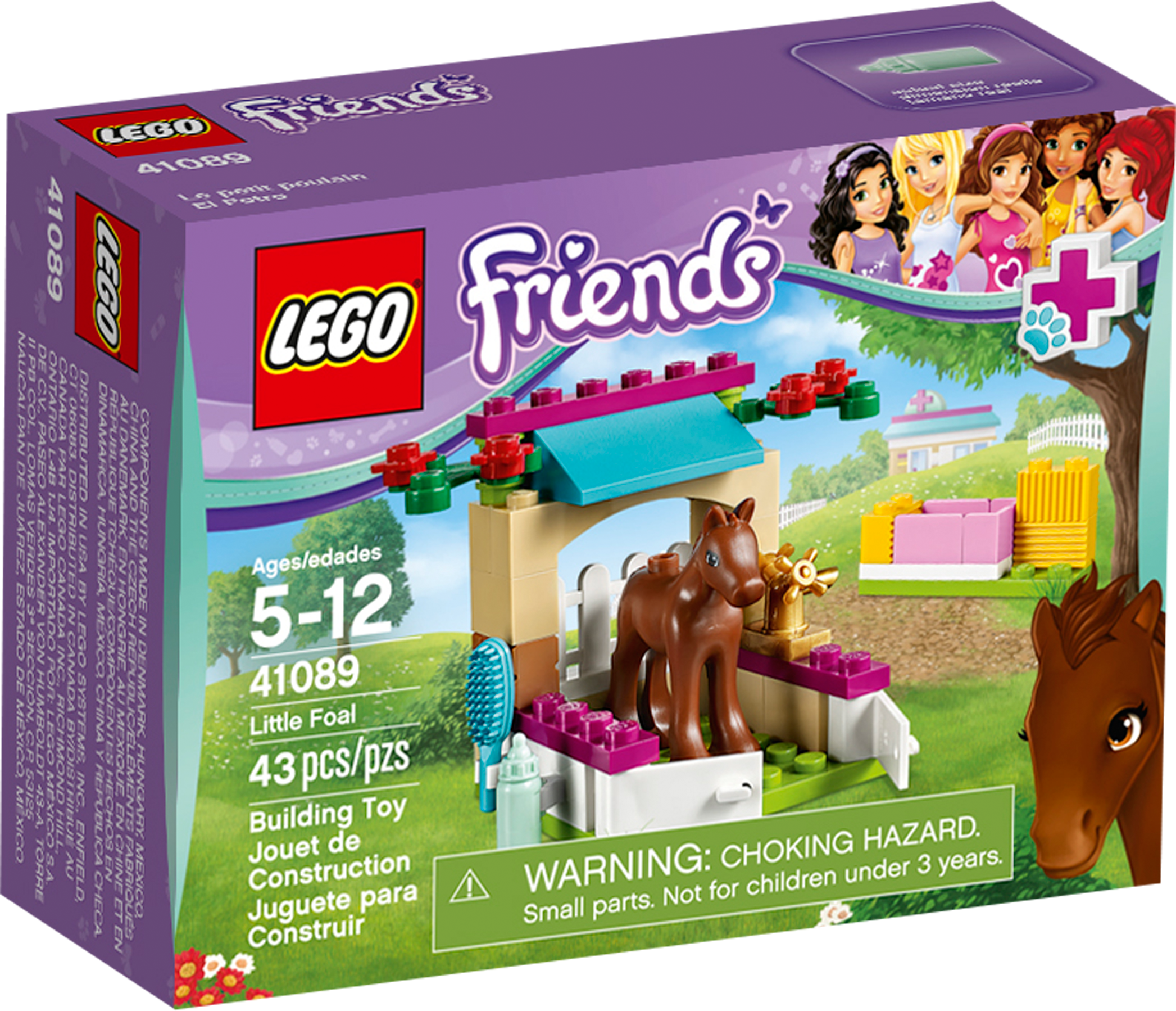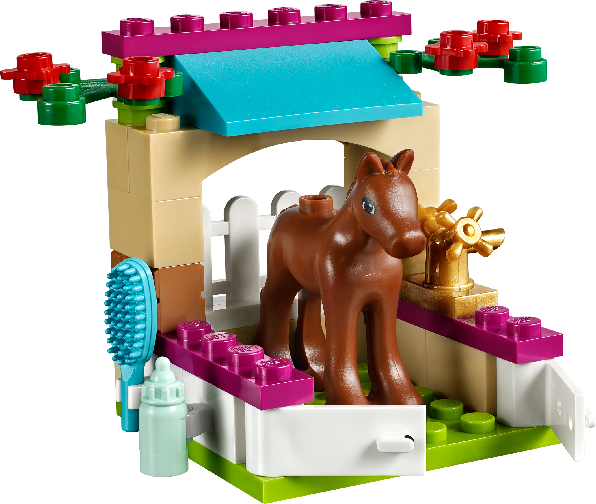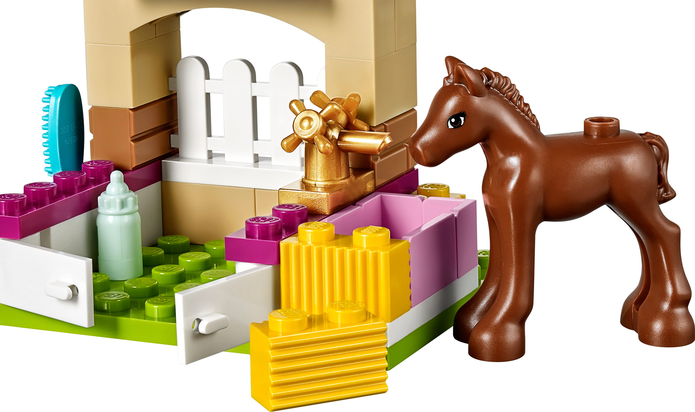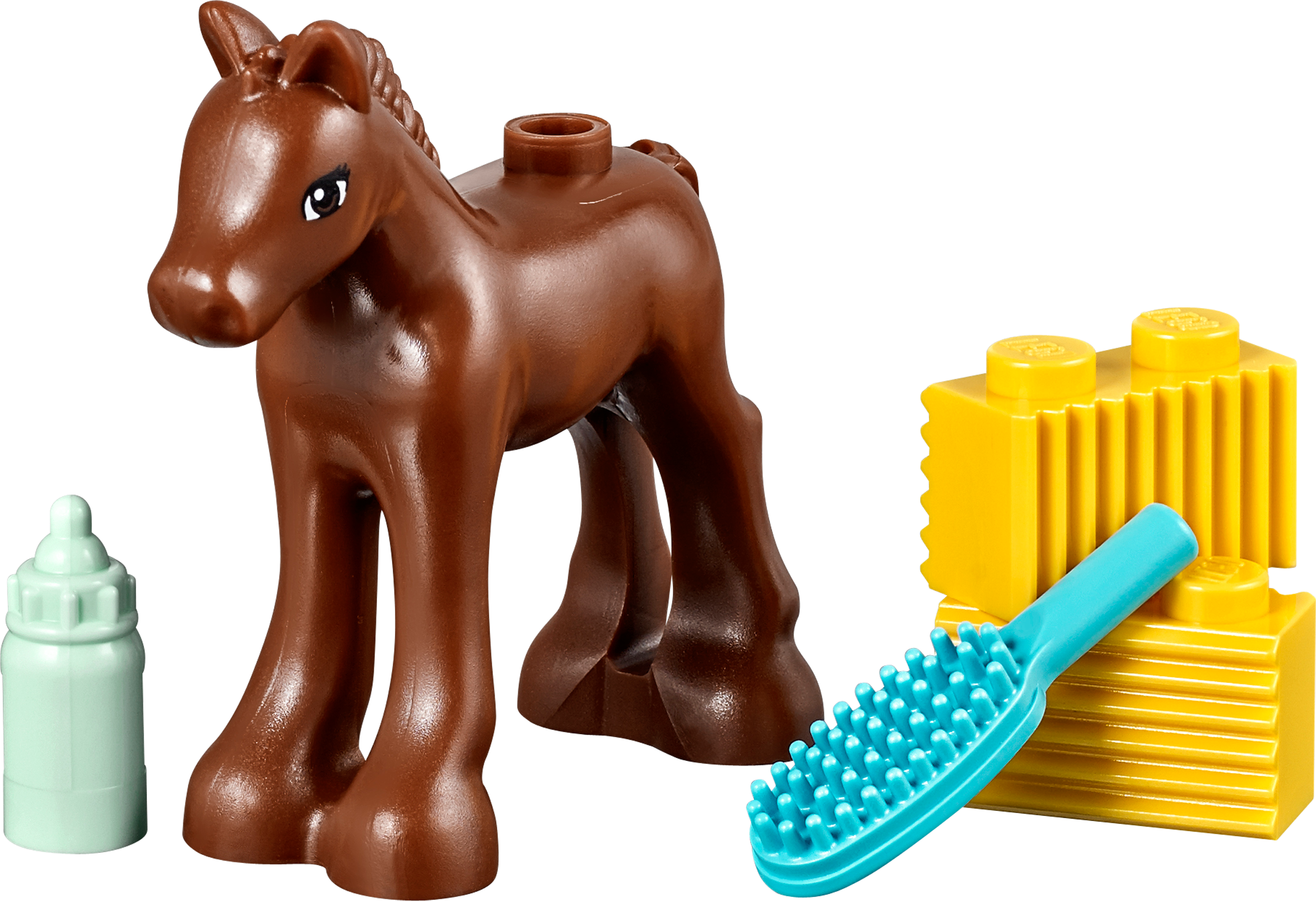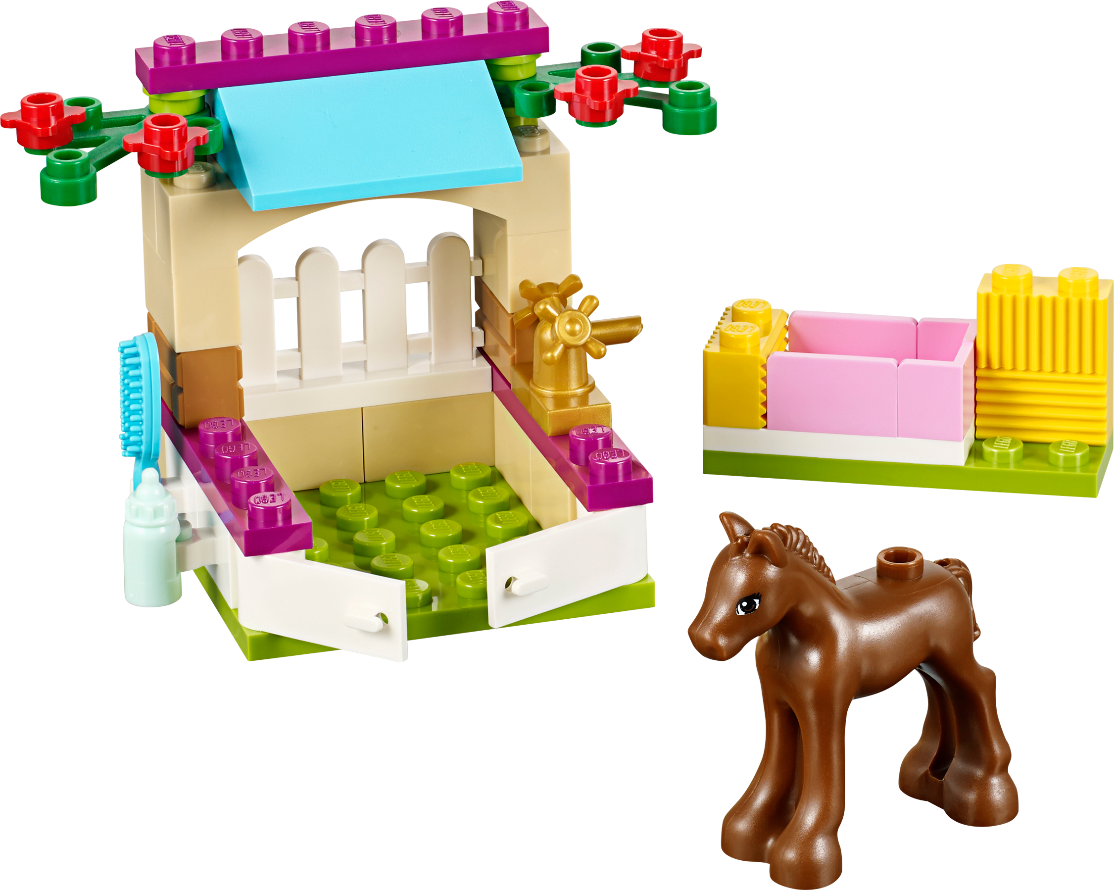 Bottle feed and groom a newborn foal! Build a cute little stable for the baby foal! Feed the foal with the feeding bottle until he is strong enough to eat the hay. Look after him as he gains strength and have fun grooming him. Then help him trot out of the stable doors to play and take a drink from the water trough. Combine with the 41085 Vet Clinic and 41086 Vet Ambulance to check the brand new baby foal over. Includes a foal. Includes a foal Features a buildable stable with opening doors, fence and a water trough Accessories include a feeding bottle, hay bricks and a brush Build a cute stable for the newborn foal Bottle feed the foal to help it grow stronger Use the brush to groom the foal Stable measures over 1” (5cm) high, 2” (6cm) wide and 1” (4cm) deep Combine with 41085 Vet Clinic and 41086 Vet Ambulance to give the newborn foal a medical examination Collect 41087 Bunny & Babies and 41088 PuppyTraining to complete the set