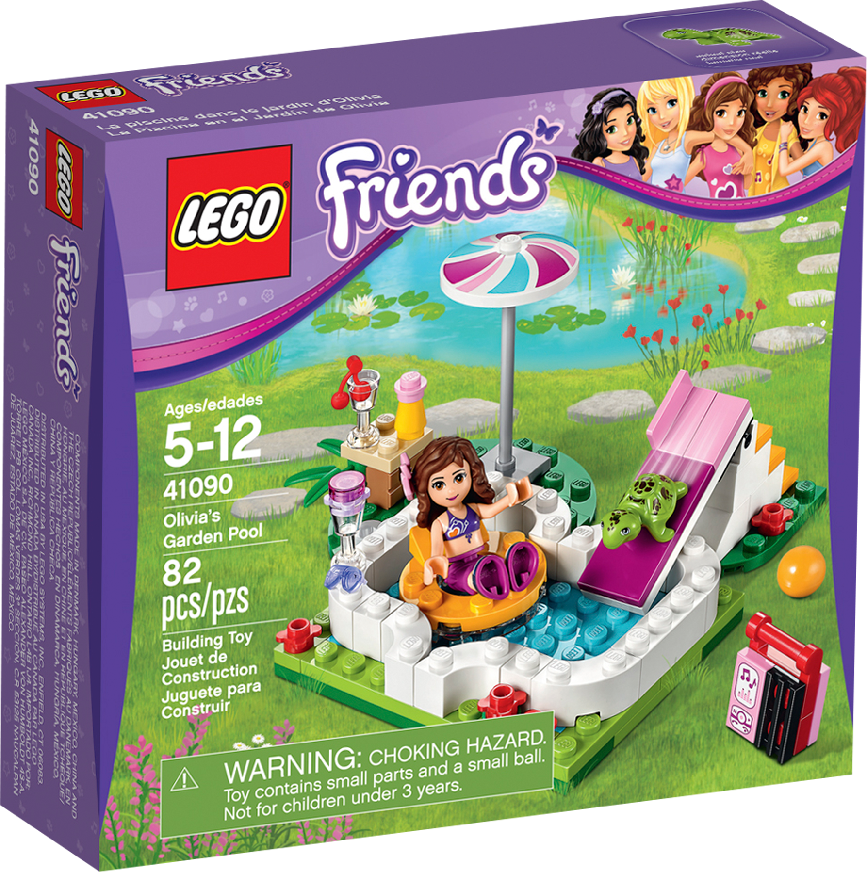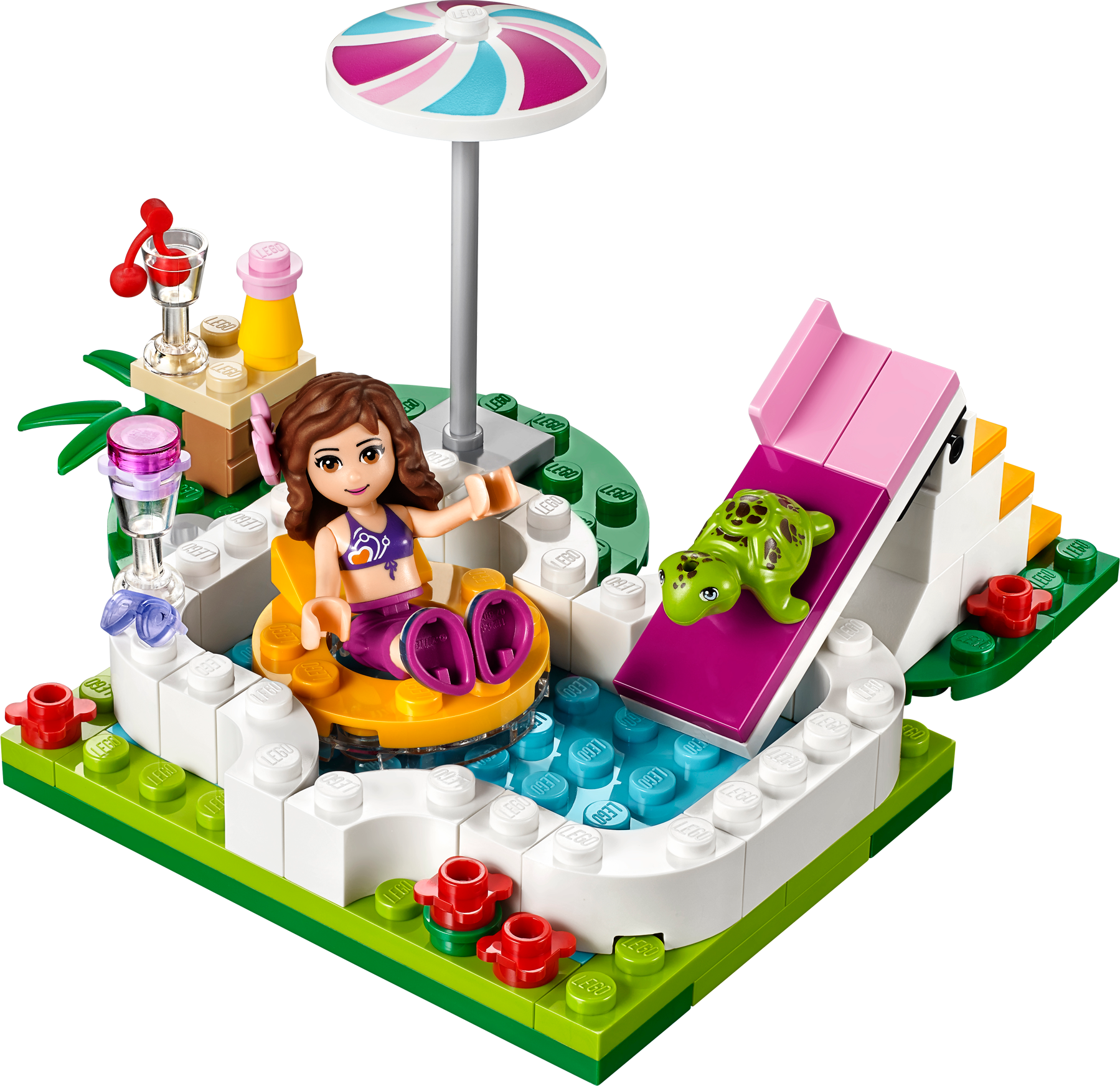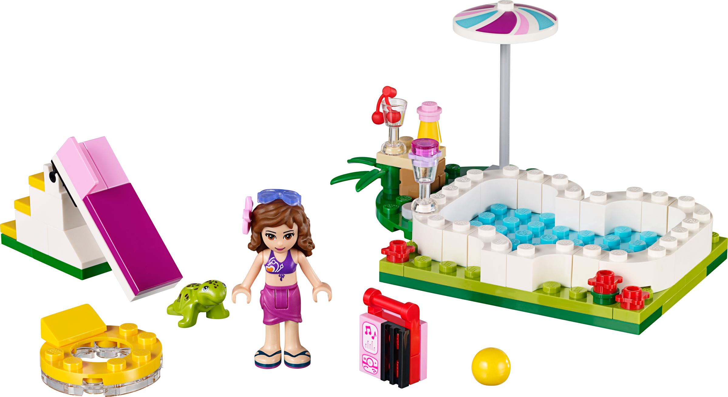 Chill out by Olivia’s Garden Pool and play with the friendly turtle! It’s a hot summer’s day in Heartlake City, so take a dip in Olivia’s Garden Pool! Remember to help Olivia put on her sunscreen before she dives in. Relax on the floating ring and take a drink, then play on the slide with the turtle that comes to visit. Sit her in the shade under the parasol to eat some cherries and listen to music on the MP3 player. Combine with 41095 Emma’s House to create the perfect garden. Includes an Olivia mini-doll figure and a turtle. Includes an Olivia mini-doll figure and a turtle Features a heart-shaped pool, adjustable slide with stairs, MP3 player, parasol, table and a floating ring. Accessories include a pair of sunglasses, 2 glasses, ball, cherries, sunscreen and a hair flower Put on some sunscreen and relax by the pool in the sunshine Go for a dip to cool down and have fun on the slide with the turtle Find the shades, grab a drink and set Olivia up with her favorite tunes on the MP3 player Olivia’sGarden Pool measures over 3” (10cm) wide, 3” (9cm) deep and under 1” (1cm) high Slide measures over 1” (4cm) high, 2” (6cm) wide and under 1” (2cm) deep Combine with 41095 Emma’s House to create the perfect garden