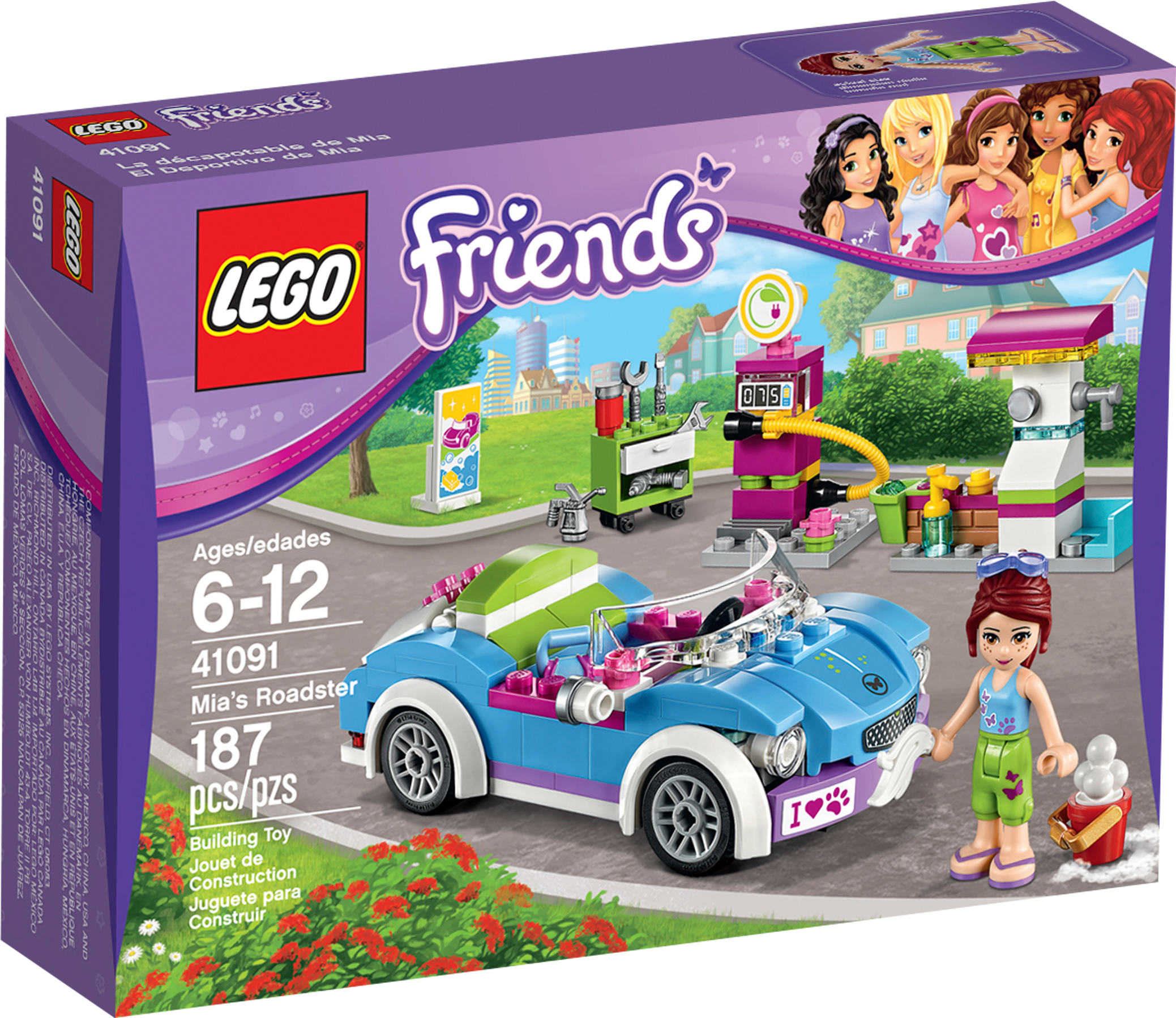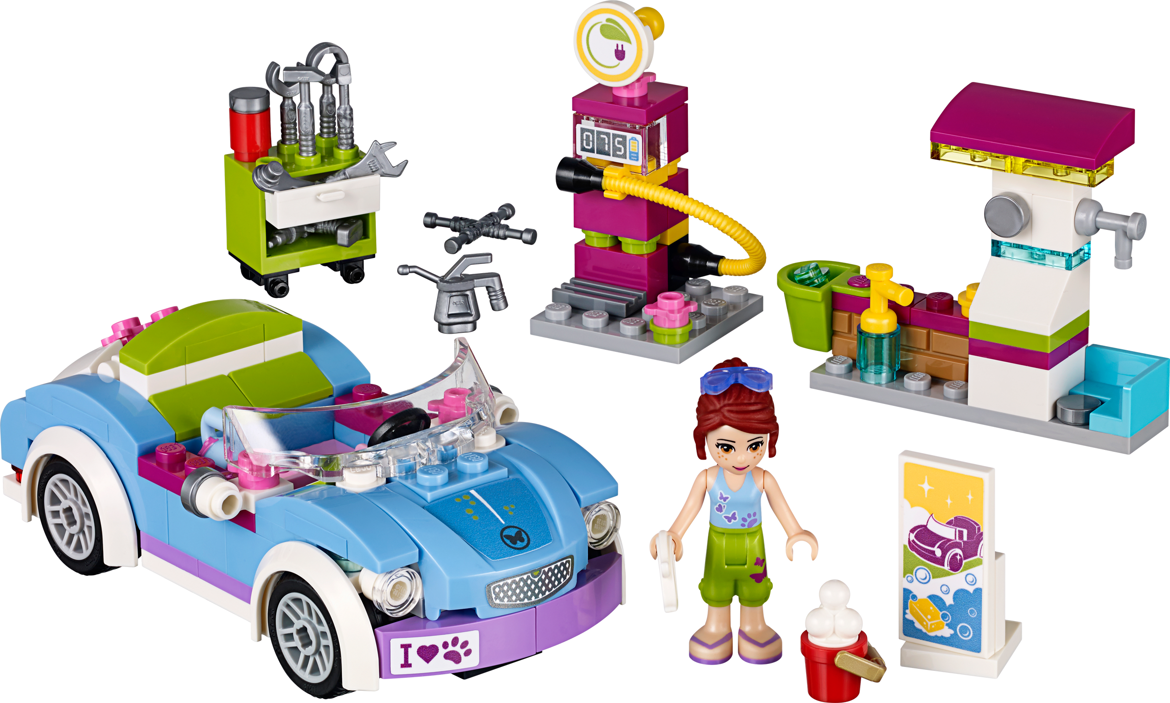 Cruise around Heartlake City in Mia’s Roadster to meet her friends! Get out and about with Mia in her funky blue Roadster. It’s a beautiful day in Heartlake City, so Mia puts on her shades and heads off to meet her friends. But first, head to the gas station to fill up with special eco-fuel. Top up the oil and check the car over with the tools at the repair stand, then help Mia wash her car to make it super shiny. Put her handbag in the trunk and she’s ready to hit the road again! Includes a Mia mini-doll figure. Includes a Mia mini-doll figure Features Mia’s Roadster with opening trunk, gas pump with flexible pipe, washing station and a repair stand with opening drawer Accessories include a pair of sunglasses, handbag, gas station sign, 2 water buckets, soap bottle, foam, cloth and various car tools Drive around Heartlake City and meet up with the friends wherever they are! Put the handbag in the opening trunk and help Mia wash her car Head to the gas station to fill up with eco-fuel and check the car over at the repair stand Mia’s Roadster measures over 1” (3cm) high, 4” (11cm) long and 1” (5cm) wide Gas pump measures over 1” (5cm) high, 1” (3cm) wide and 1” (3cm) deep Washing station measures over 1” (5cm) high, 2” (6cm) wide and under 1” (1cm) deep