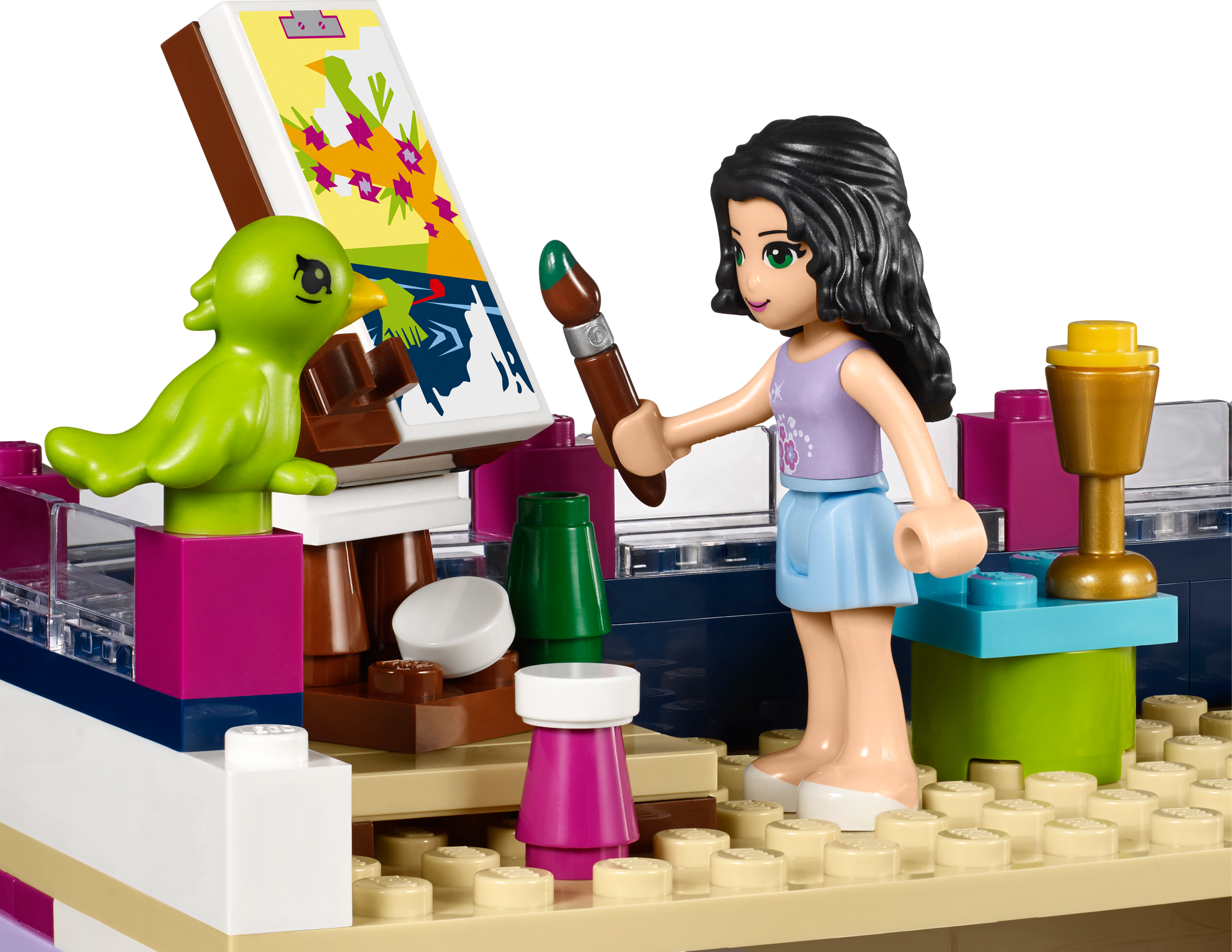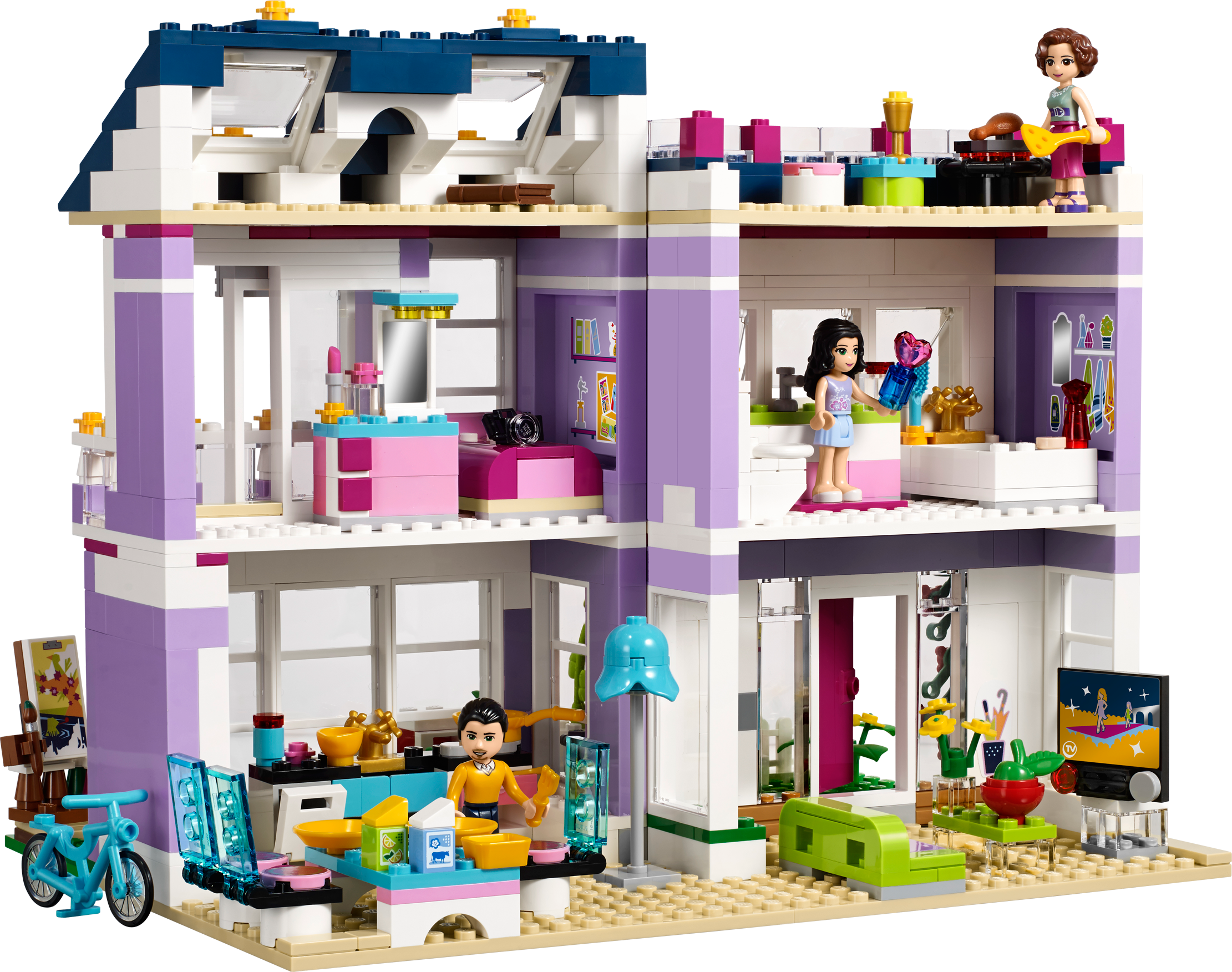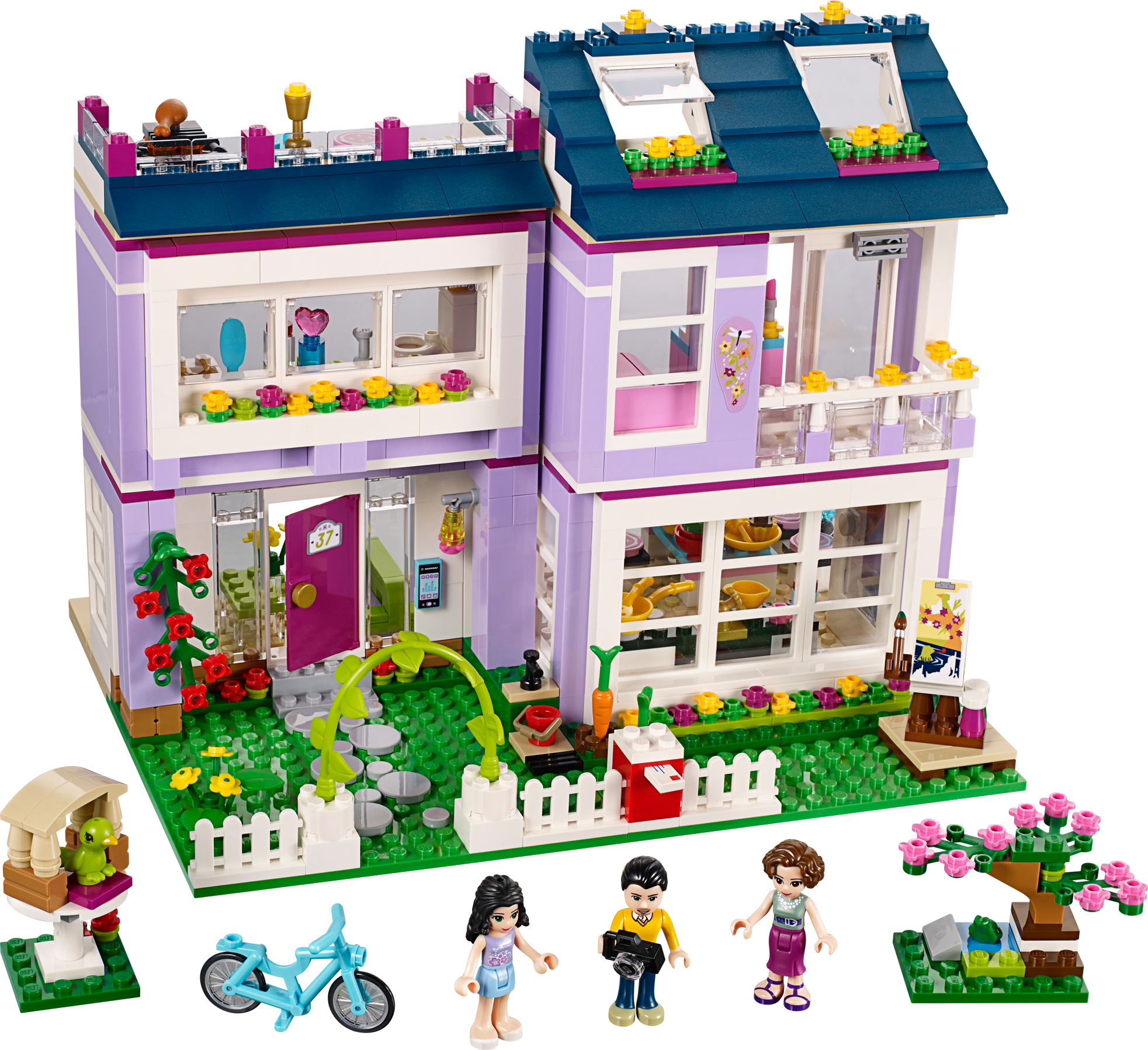 Personalize Emma’s amazing designer home and hang out with all her friends! Build and customize your dream family home with a modern edge! LEGO® Friends Emma’s House shows off all the creative skills of Emma’s family. Prepare a tasty meal in their state-of-the-art kitchen, using vegetables grown in their own garden and fresh ingredients from the opening fridge. Then sit the family down in the living room to watch a movie together on the flat-screen TV. Emma loves having her friends over to hang out in her bedroom, which she designed herself, and admire the view from herbalcony. Help her practice with her make-up in front of the big vanity mirror after a nice long bubble bath in the bathroom. Do some painting in the beautiful zen garden, which has a birdhouse for her pet bird, or host a barbecue with friends on the relaxing roof terrace. Combine with 41090 Olivia’s Garden Pool for even more fun in the garden. Includes 3 mini-doll figures: Emma, mom Charlotte and dad Luis, plus her pet bird. Includes 3 mini-doll figures: Emma, mom Charlotte and dad Luis, plus her pet bird Features a modular house with a kitchen, living room, bathroom, bedroom, attic room, roof terrace, balcony, garden and a bicycle Kitchen features an opening fridge, opening dishwasher, sink, drawer, hob, table with 3 chairs and a lamp Living room features a sofa, coffee table and a flat-screen TV Bedroom features a bed, vanity table with mirror and a sliding balcony door Bathroom features a bath, toiletand a sink Roof terrace features a barbecue, table and a stool Garden features a vegetable patch, zen garden, functioning mailbox and a turning birdhouse Accessories include a frog, canvas, paintbrush, perfume bottle and beauty products, camera, cooking utensil, plates, fruit cups, drink, chicken leg, book, bucket and an intercom Open the fridge and make a meal for the family in the kitchen Sit on the balcony or climb up to the attic room to quietly read a book Chill in the garden with Emma’s pet bird, to take some photos or paint a landscape Throw a barbecue party on the roof terrace for the LEGO® Friends Take the bike for a ride around the neighborhood Get in the shower to freshen up before a big pampering session at the vanity table Emma’s House measures over 8” (21cm) high, 9” (25cm) wide and 7” (19cm) deep Bicycle measures over 1” (3cm) high, 1” (5cm) long and under 1” (1cm) wide Combine with 41090 Olivia’s Garden Pool for the ultimate garden party!