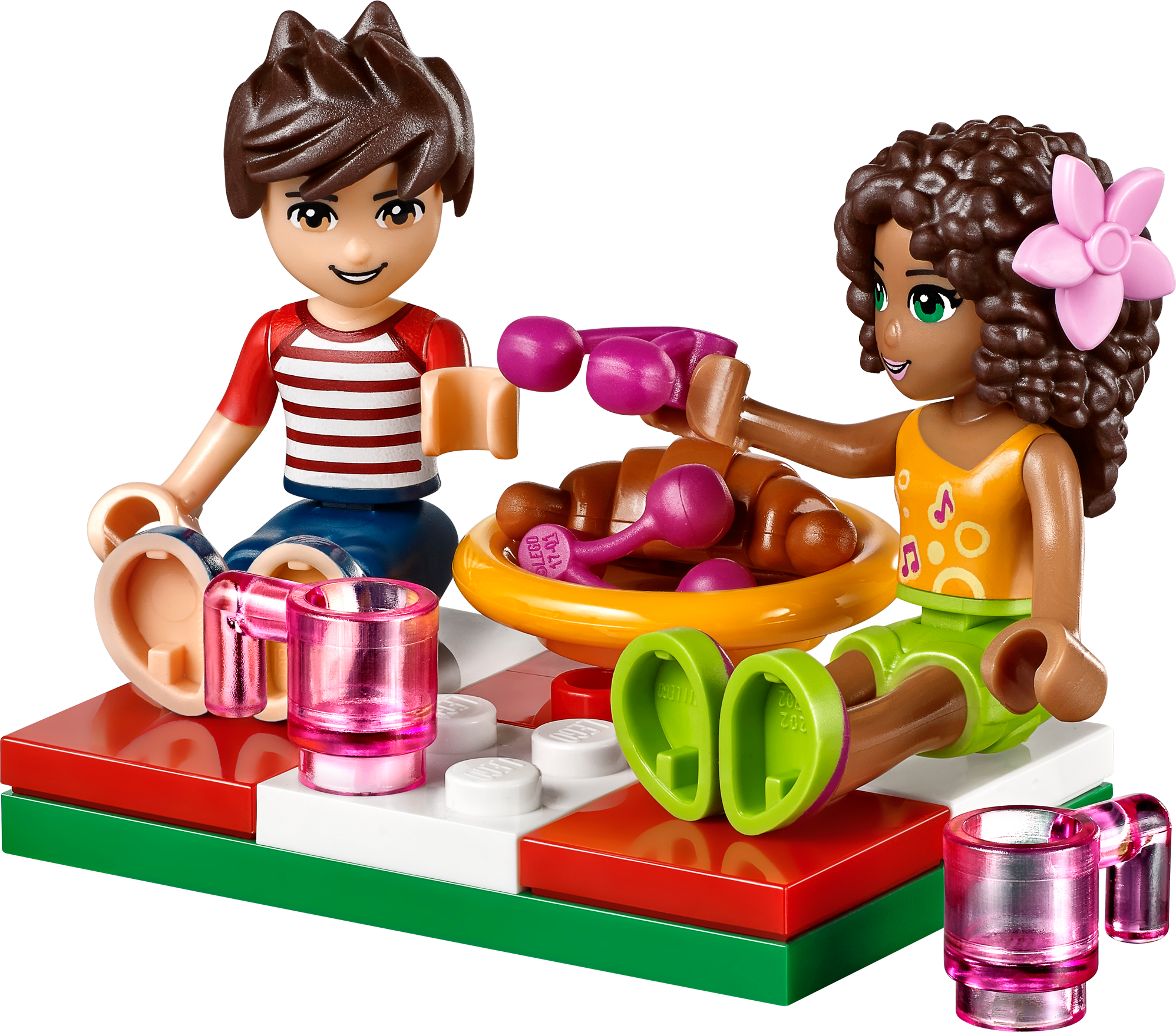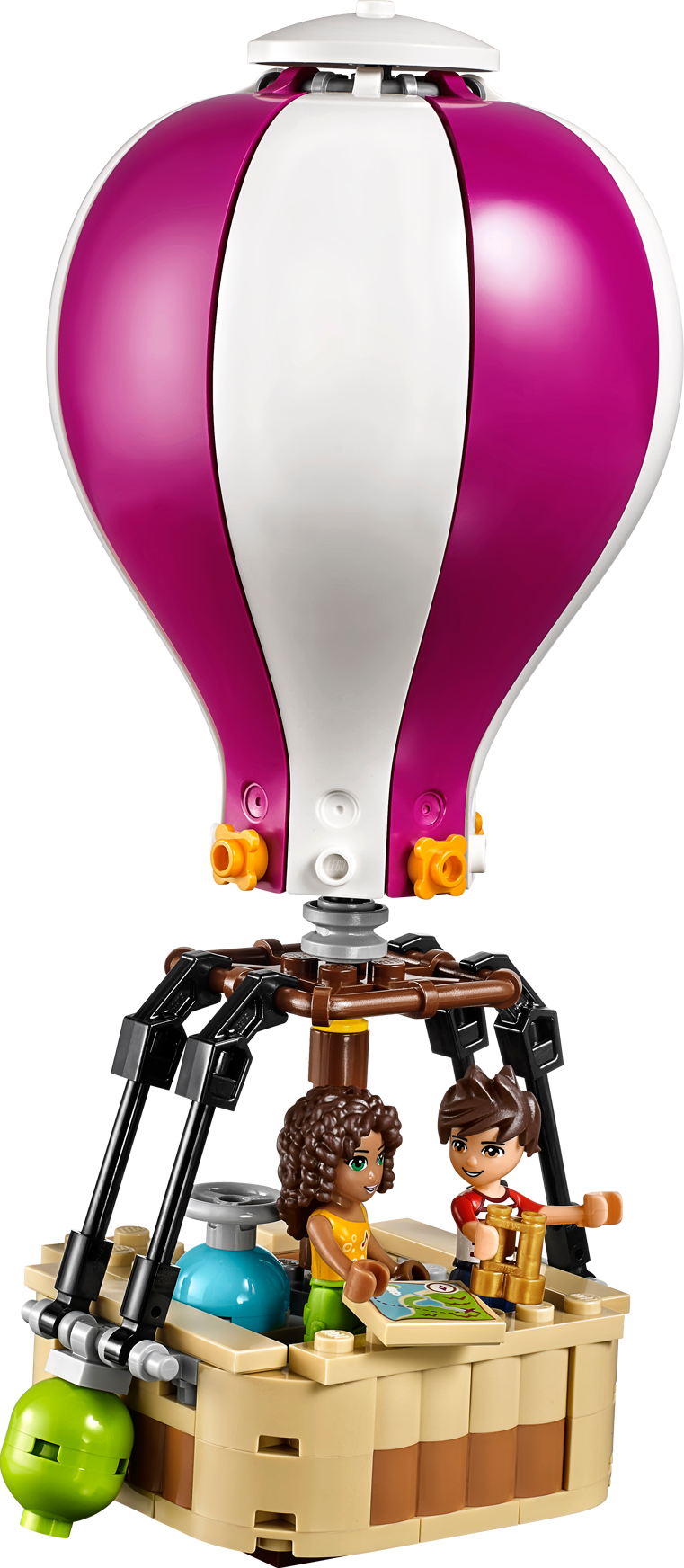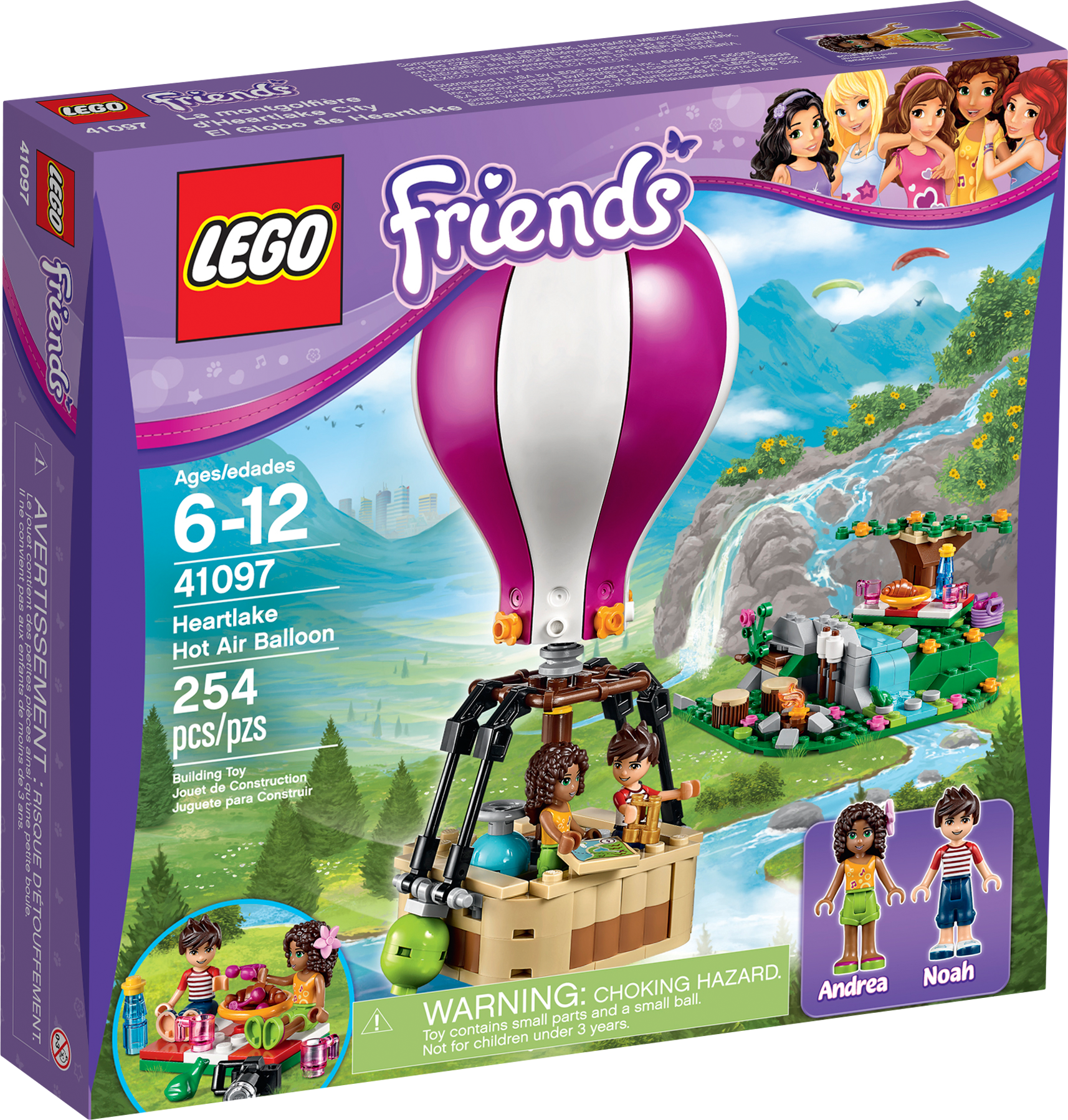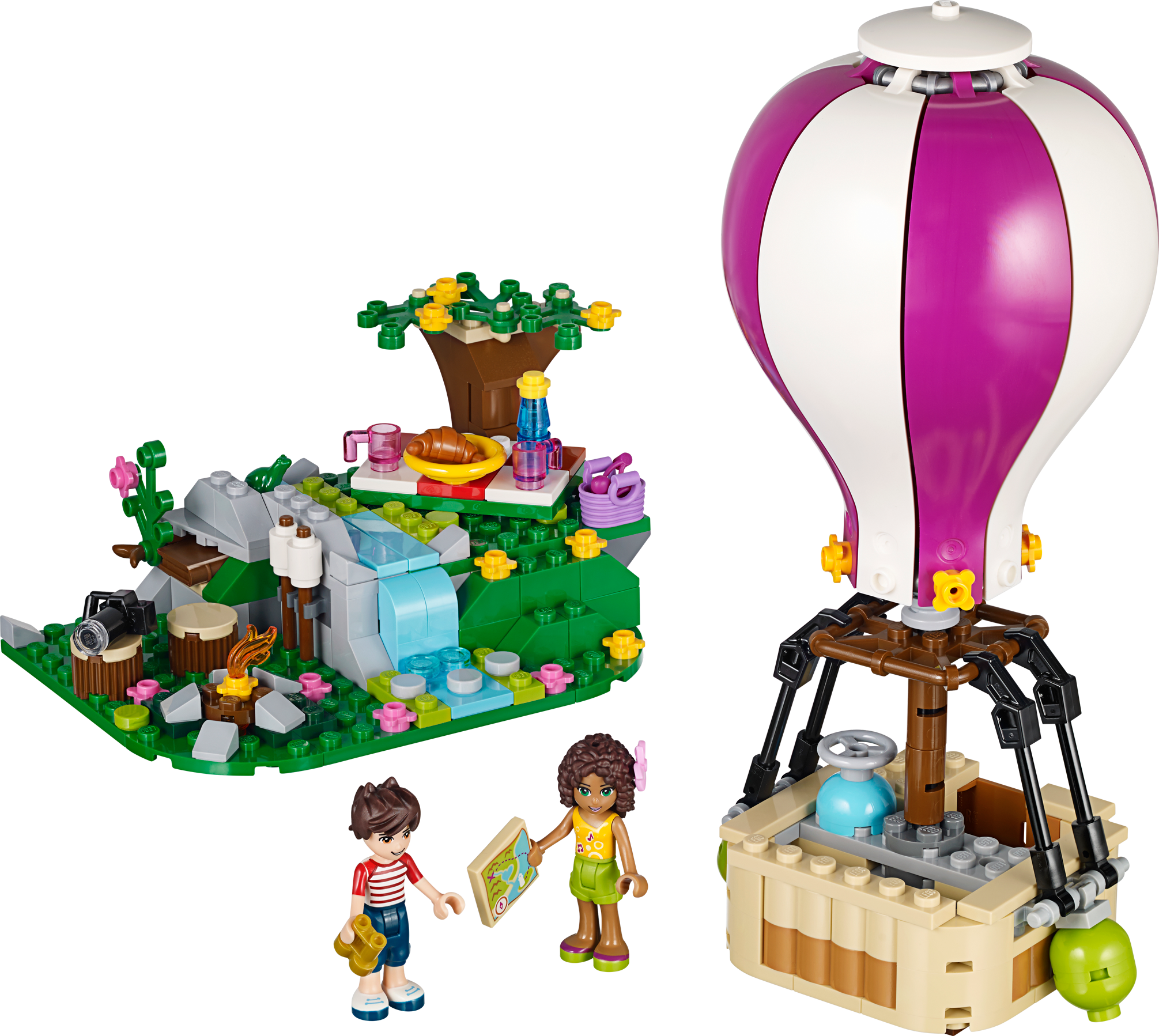 Take a trip in the Heartlake Hot Air Balloon to find the perfect picnic spot! Go up, up and away in the Heartlake Hot Air Balloon for an amazing view of Heartlake City. Fly up to the clouds with Andrea and Noah as they try to find a quiet spot for a picnic. Use the map and binoculars to find the perfect place, then carefully land the Hot Air Balloon beside the waterfall. Now set up a picnic blanket and enjoy a croissant and cherries in the sunshine or toast marshmallows by the campfire. Then it’s time for some exploring – who know what treasures you’ll find! Combine withthe 41094 Heartlake Lighthouse for more sightseeing fun in Heartlake City. Includes 2 mini-doll figures: Andrea and Noah. Includes 2 mini-doll figures: Andrea and Noah Features a Hot Air Balloon with basket and a picnic spot with a waterfall and tree Accessories include a gas bottle, sandbags, picnic blanket, plate, croissant, cherries, water bottle, campfire, marshmallows, hair flower, frog, treasure map, binoculars, camera, bag, book and a medallion Soar above Heartlake City on a beautiful Hot Air Balloon ride Set up a delicious picnic and toast marshmallows on the campfire Explore the waterfalland discover the secret treasure Hot Air Balloon measures over 7” (19cm) high, 2” (6cm) long and 2” (6cm) wide Picnic spot measures over 2” (6cm) high, 4” (12cm) wide and 3” (9cm) deep Combine with the 41094 Heartlake Lighthouse for more sightseeing fun with the LEGO® Friends
