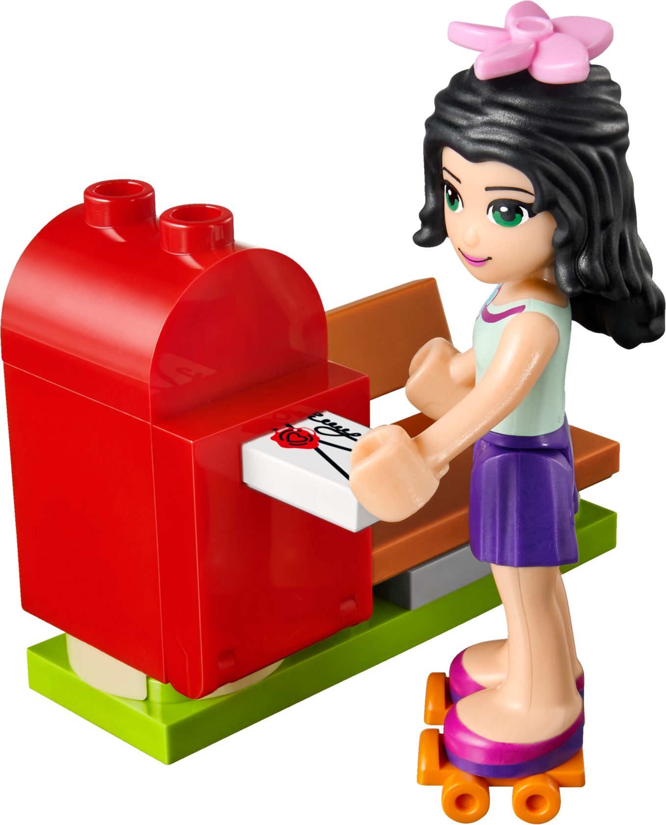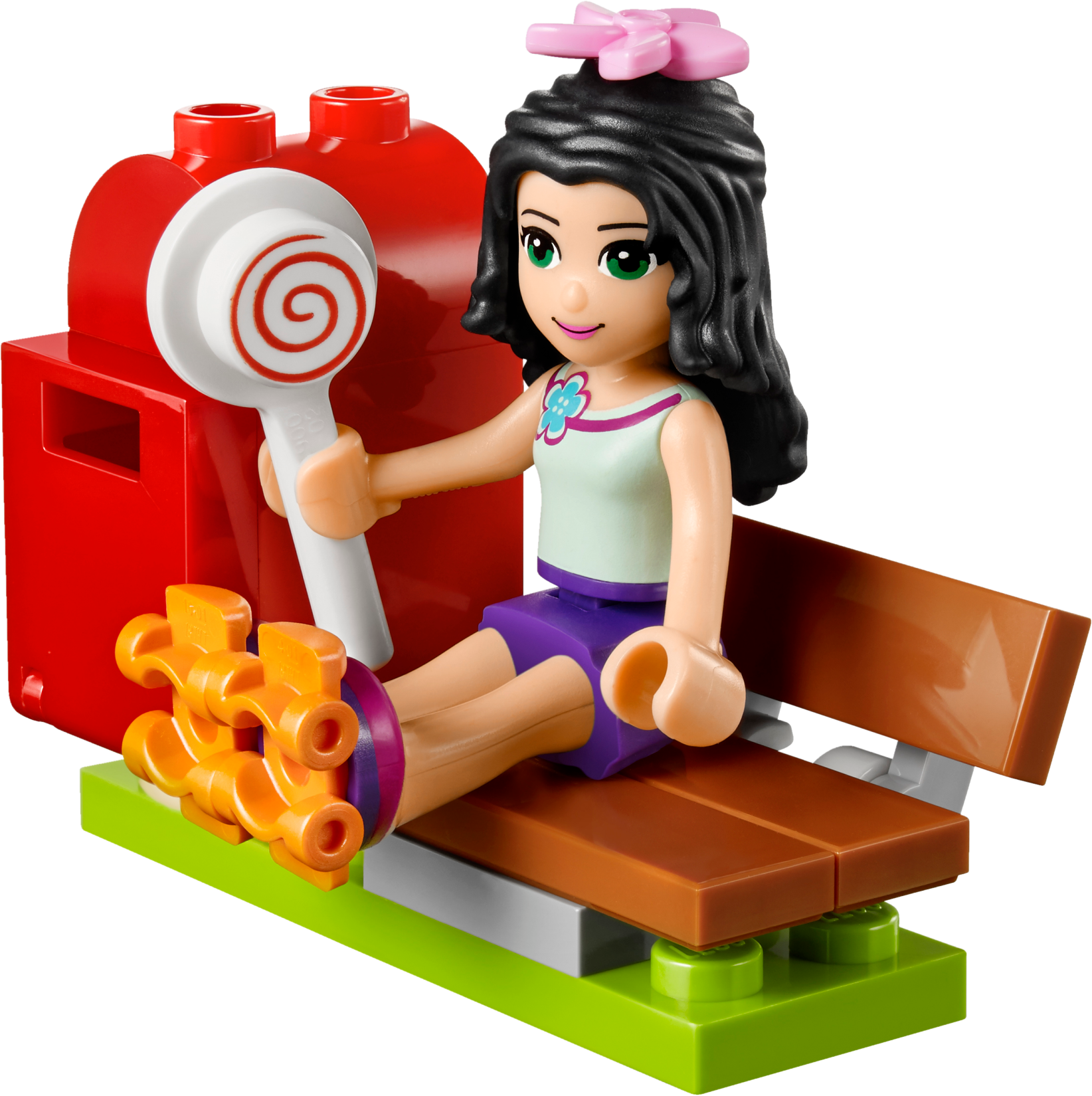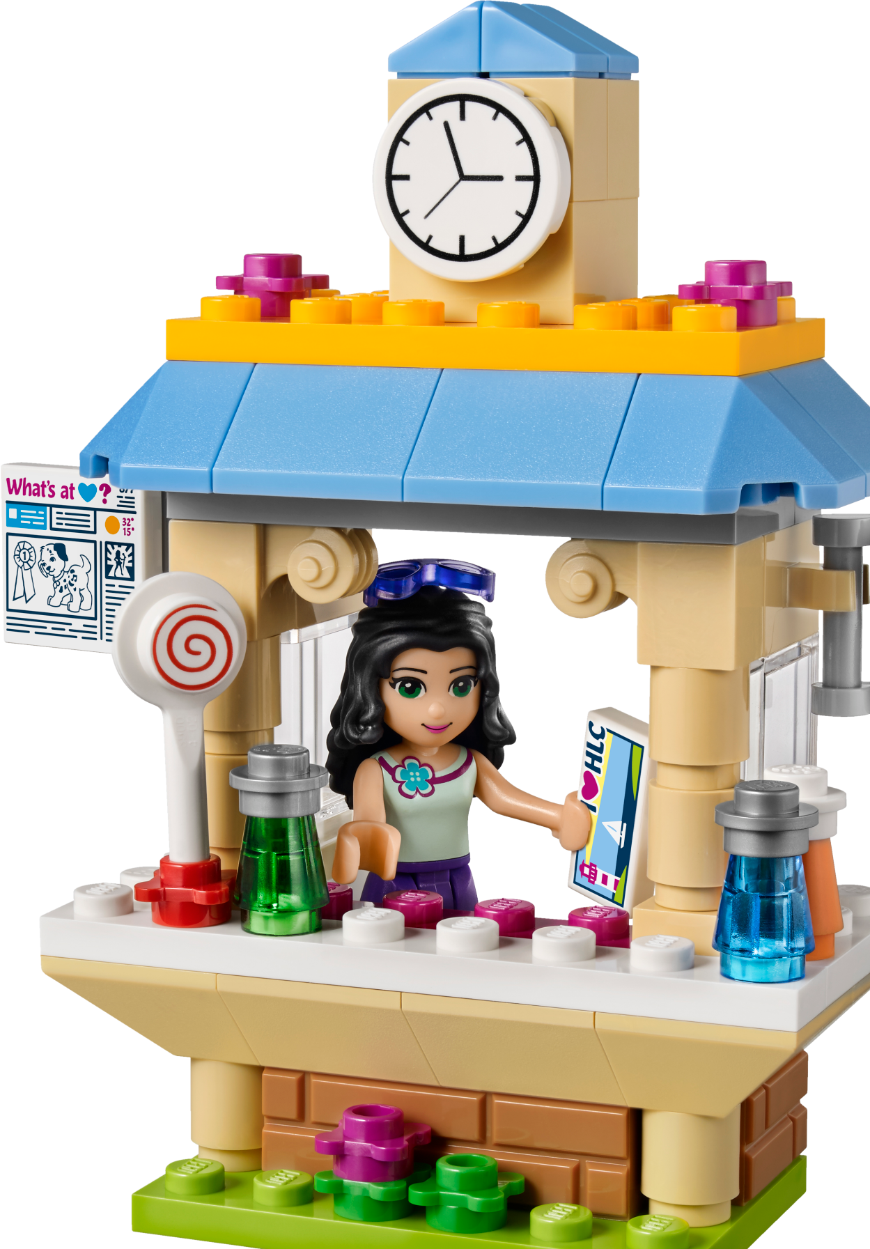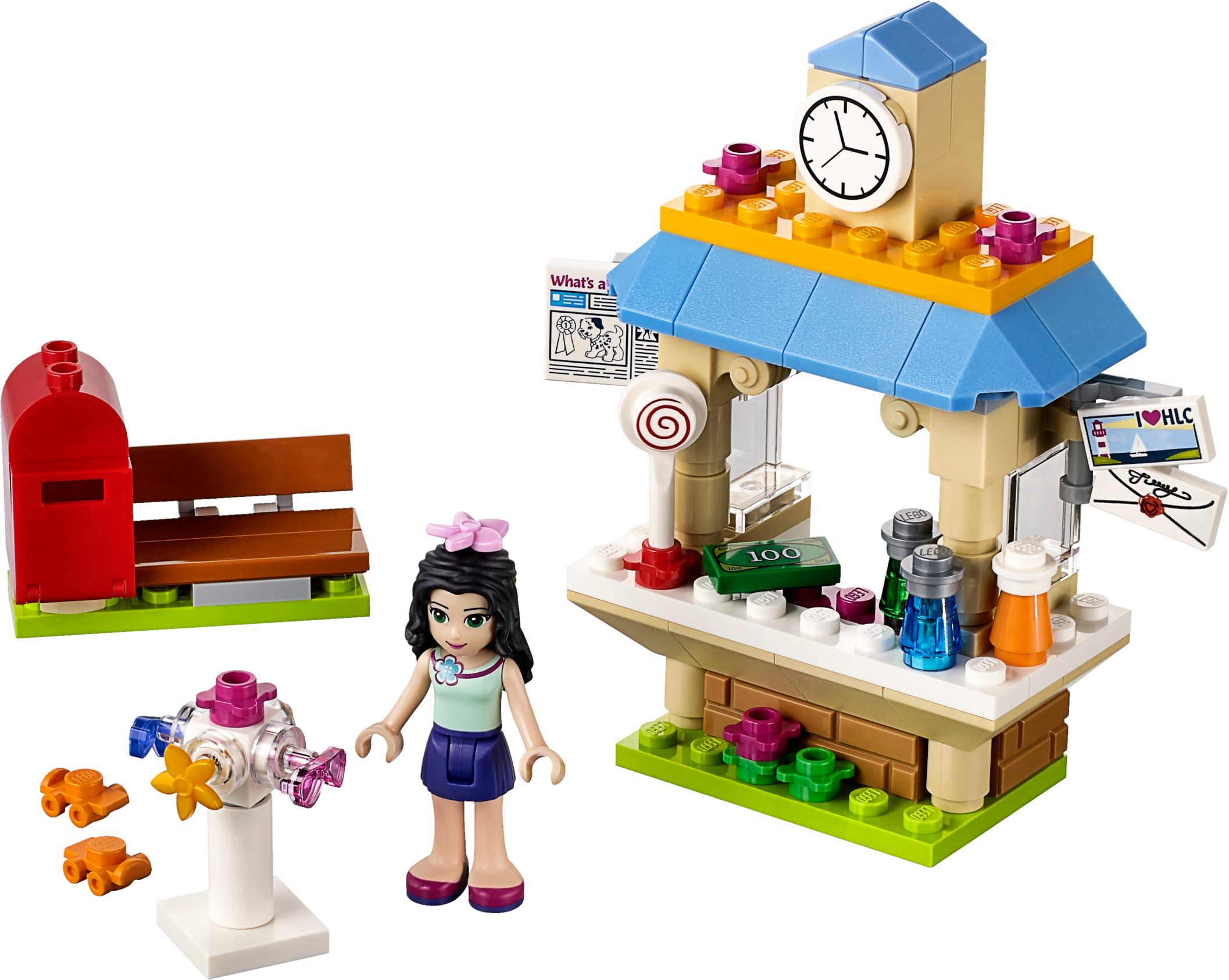 Sell vacation essentials to the tourists in Heartlake City! Run the busy Tourist Kiosk with Emma! Sell sunscreen, sweets, drinks and postcards to visitors. They can mail their letters right in the kiosk’s mailbox. Help them choose the coolest glasses for their holidays as they turn the accessories stand. Then skate off with Emma on her rollerblades at the end of her shift. Includes an Emma mini-doll figure. Includes an Emma mini-doll figure Features a Tourist Kiosk with a turning display, mailbox and a bench Accessory elements include rollerblades, 2 pairs of sunglasses, 2 hair accessories, magazine, sunscreen, bottles, postcard, envelope and a lollipop Sell everything needed for the perfect vacation to the tourists of Heartlake City Browse the turning display to try on sunglasses and hair accessories Choose a postcard element and post it in the kiosk mailbox Tourist Kiosk measures over 3” (9cm) high, 2” (6cm) wide and under 1” (2cm) deep Bench measures over 1” (3cm) high, 1” (4cm) wide and under 1” (2cm) deep