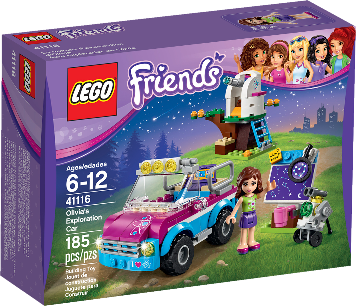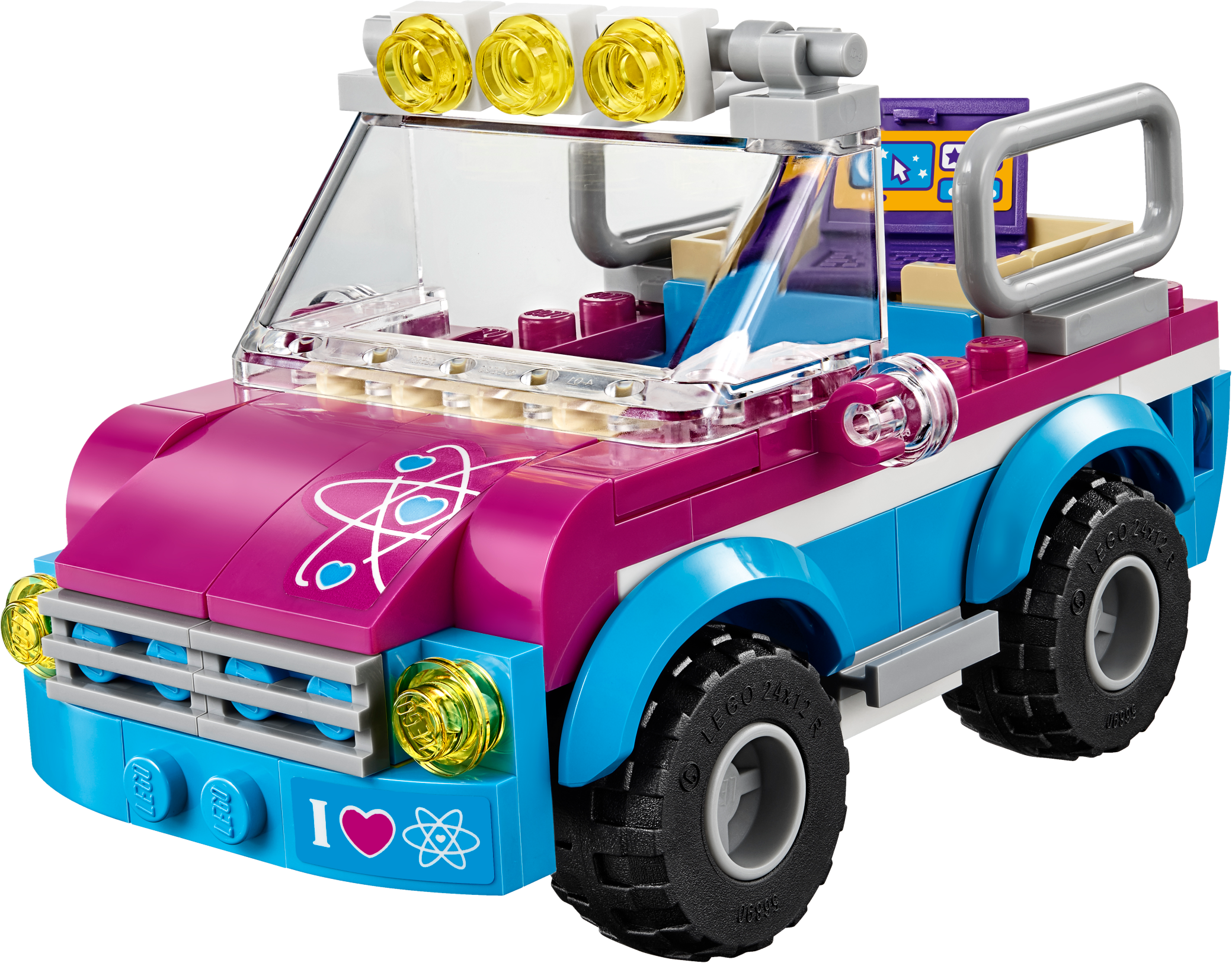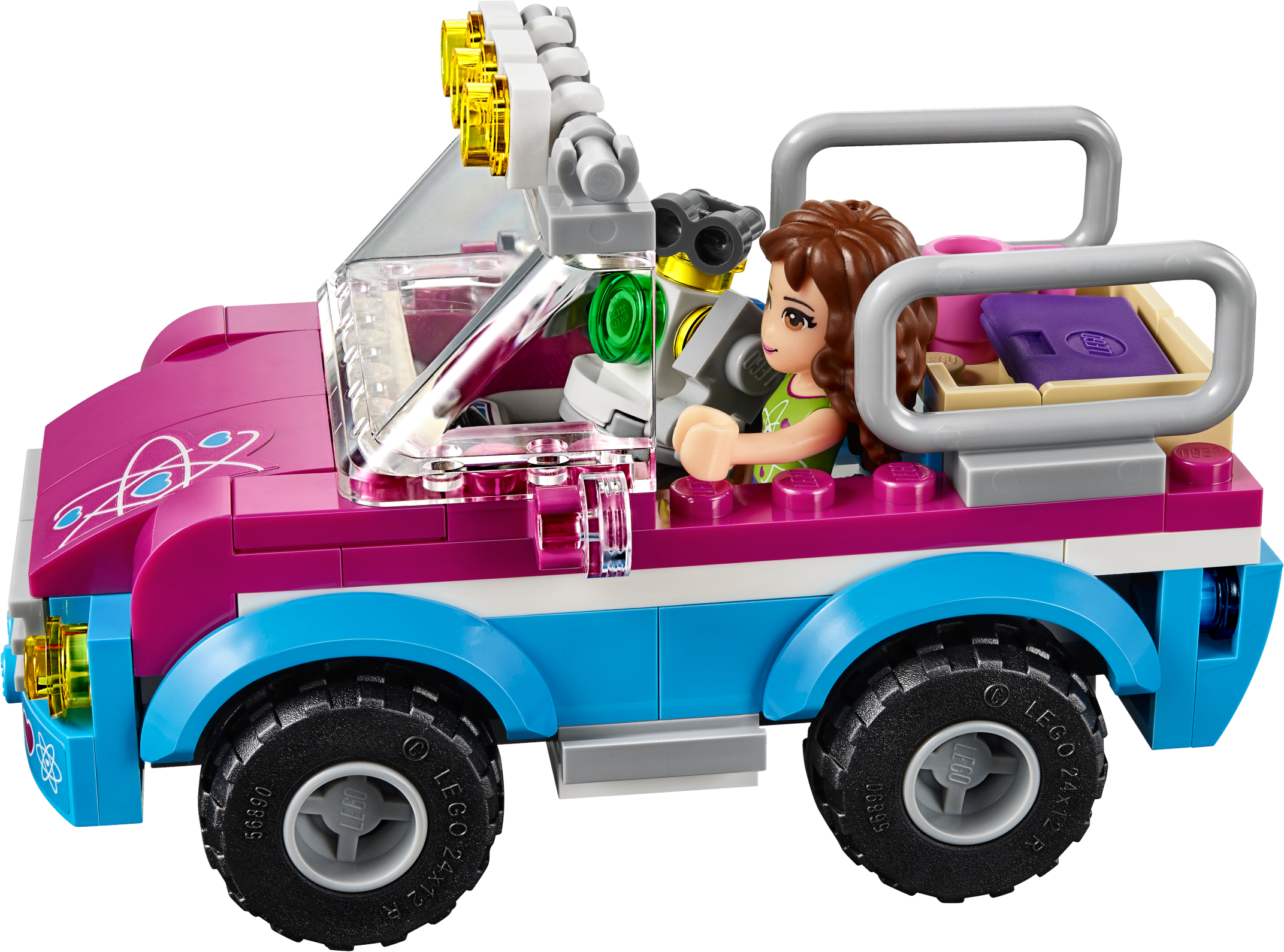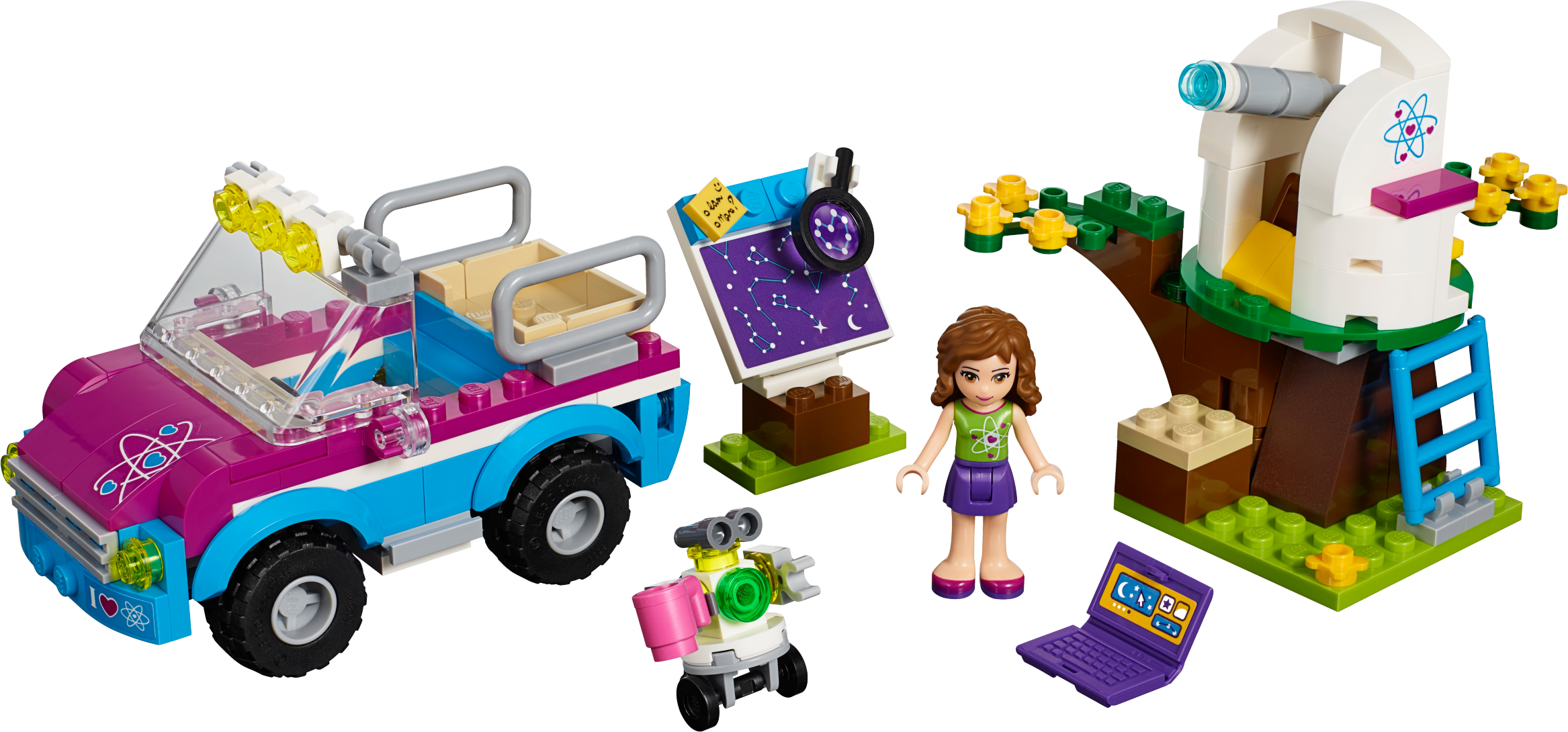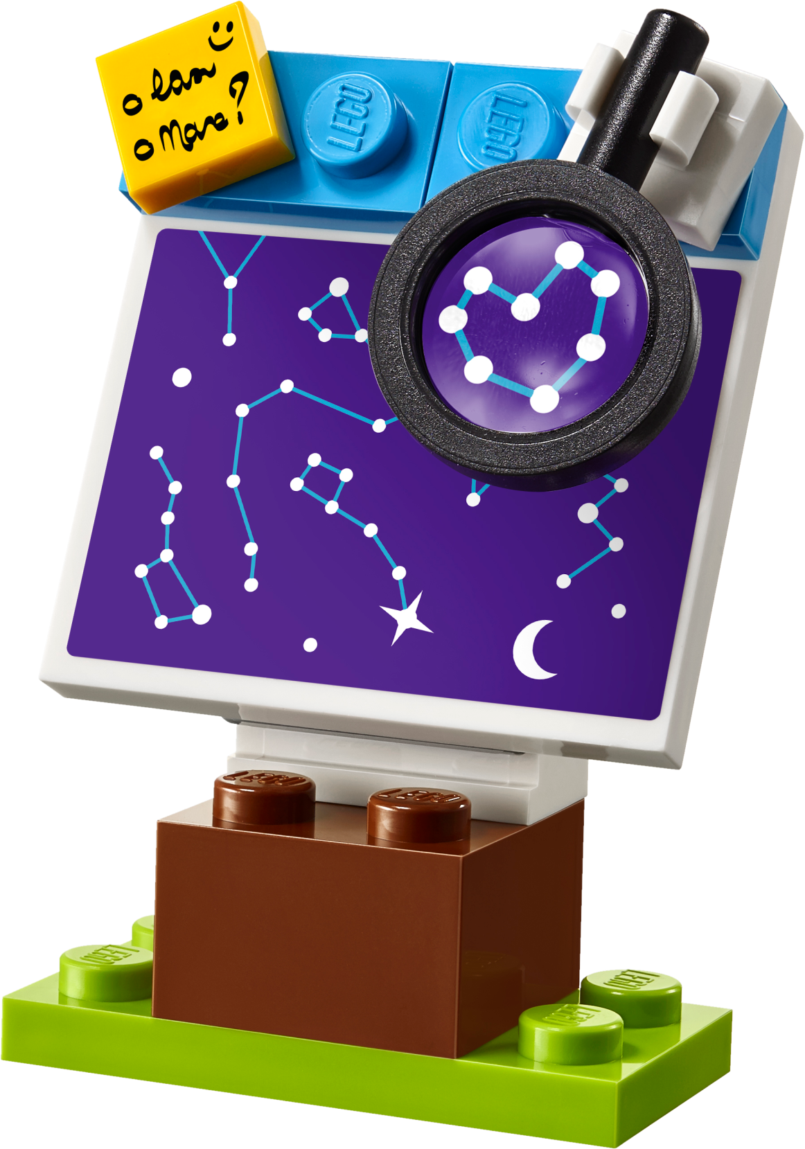 Drive Olivia’s car to see the stars at the observatory! Olivia’s pink SUV car is all packed up with her computer and robot friend Zobo—she thinks she has discovered a new constellation! Rush with her to the observatory on top of Heartlake City Hill. Study the sky map then climb up to the observation tower to look through the telescope. Can you see it? It’s heart-shaped! Now have a hot chocolate while Olivia writes a new science-blog post! Includes an Olivia mini-doll figure plus Zobo the robot. Features a blue and pink SUV-style car that seats 2 mini-dolls. Includes an observatory tower with a ladder up to the telescope and turning platform, and a stand-up board with a sky map. Accessory elements include a computer, magnifying glass, sticky notes and a cup for hot chocolate. Sit Olivia and Zobo the robot in the car and pack it with everything you need for a night of stargazing. Climb up the observatory tower andturn the telescope. Use the magnifying glass to study the sky map in detail. This set offers an age-appropriate building experience for ages 6 -12. This set includes 185 bricks. SUV-style car measures over 2” (6cm) high, 3” (9cm) long and 1” (5cm) wide. Observation tower measures over 3” (8cm) high, 2” (6cm) wide and 2” (6cm) deep.