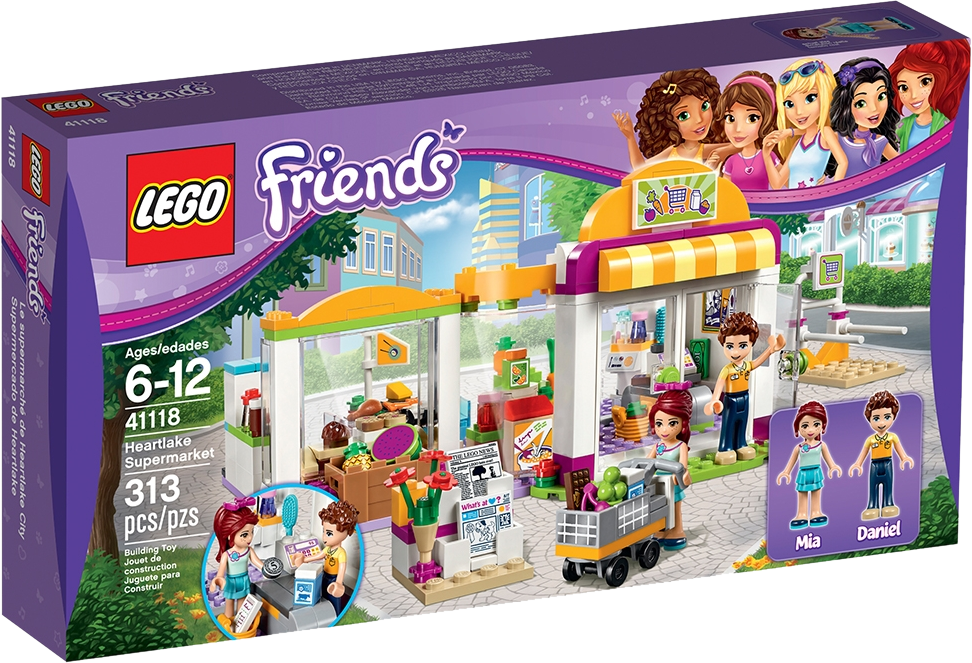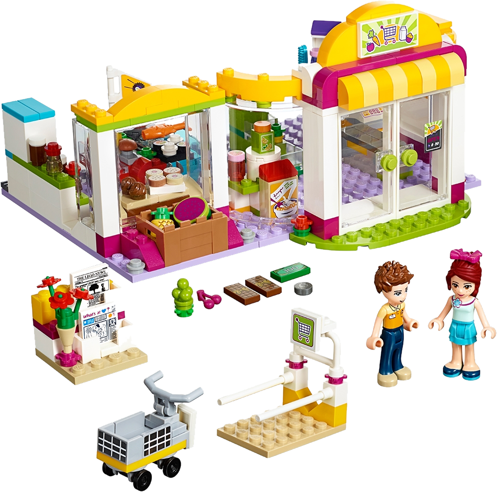 Shop for groceries and treats to fill your trolley! It’s time for Mia’s weekly shop, so join her at Heartlake Supermarket and grab a trolley from the trolley park. Explore the aisles together—what will you buy today? Pick up some fresh fruit and vegetables, breakfast cereals and sushi before you head to the bakery corner where Daniel is offering fresh cookies for tasting. Don’t forget to stop at the beauty stand before you go to the checkout! Includes Mia and shop worker Daniel mini-doll figures. Features a 1-story supermarket building with opening doors and swivel function to open up the model for easy play inside. The Supermarket features a fruit display, breakfast aisle, fish display, meat and cheese counter, fridge, bakery counter, turning beauty stand and a checkout with candy display. Outside the Supermarket is a stand selling newspapers and flowers, a fruit crate and a trolley park with rolling trolley. Food accessory elements include a watermelon, pineapple, cherries, grapes, lemon, orange, breakfast cereal, orange juice, marmalade, chocolate, chicken leg, cheese, fish, sushi, apple pies, cookies, cupcakes, milk, bottles and cans. Shopping accessory elements include a coin, bill, aisle flag, shopping list, scales, tongs, bag, newspaper and flowers. Beauty accessory elements include a brush, lipstick, a bow and 2 perfume bottles. Take a trolley from the trolley park and roll it through the supermarkets aisles. Use the tongs to display the cakes and cookies at the bakery counter. Turn the beauty stand to pick out a gift for a friend. This set offers an age-appropriate building experience for ages 6 -12. This set includes 313 bricks. Heartlake Supermarket measures over 3” (10cm) high, 7” (19cm) wide and 6” (16cm) deep when closed, and over 3” (10cm) high, 11” (28cm) wide and 4” (12cm) deep when opened out.
