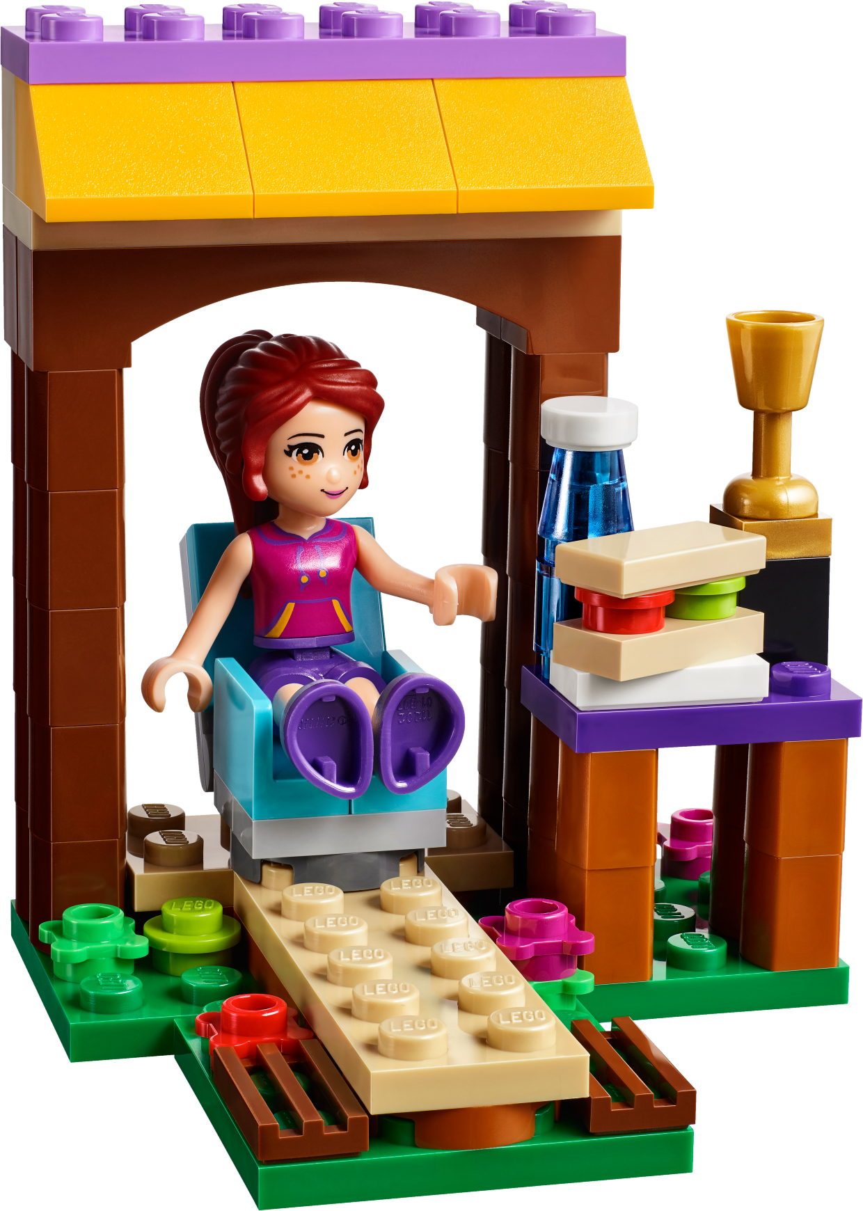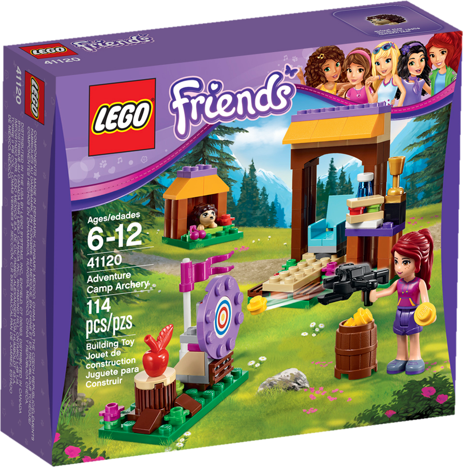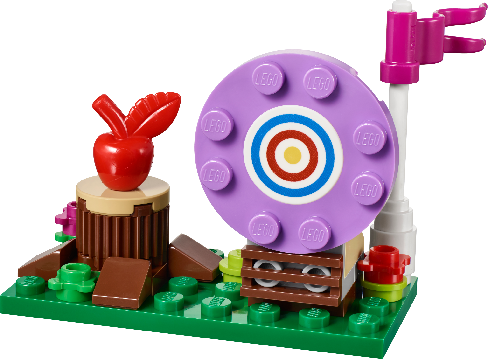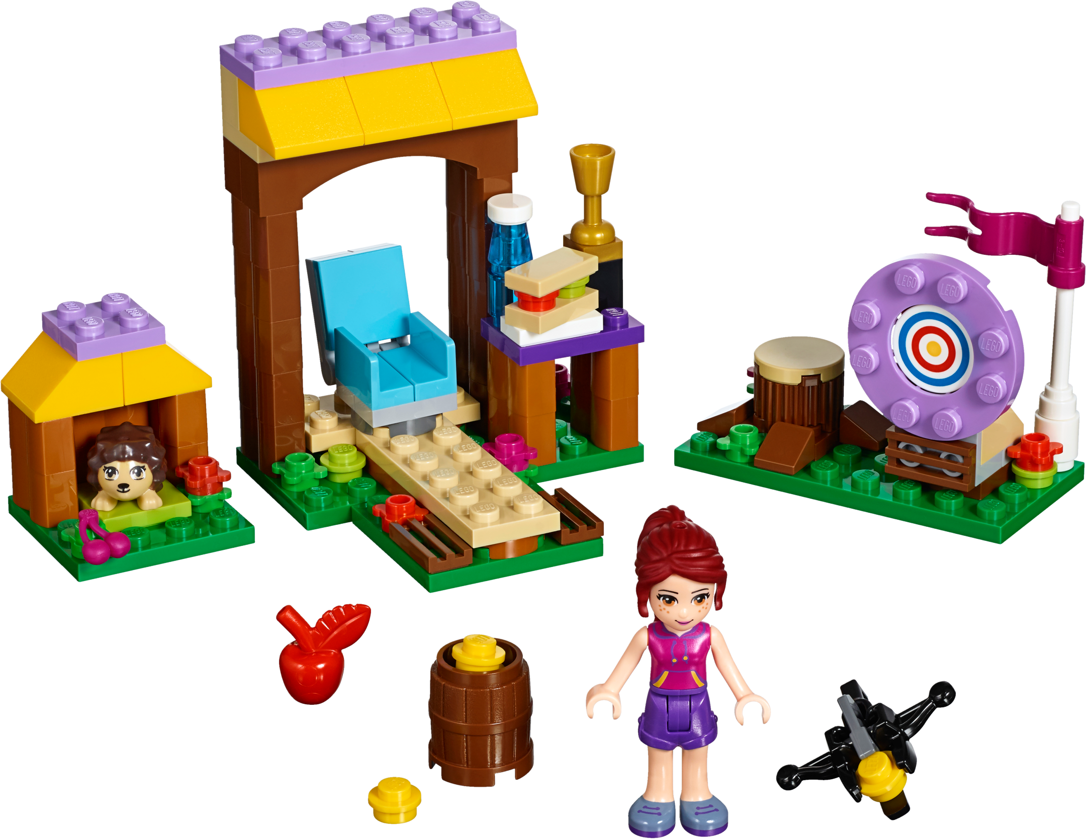 Hit the target to help Mia win the archery trophy! Mia has her eye on the archery trophy so head down to the range to help polish her skills. Keep practicing until she hits the target every time! Have a sandwich under the shelter for lunch and look out for forest wildlife—a little hedgehog has come to say hello! Then draw the bow again and aim for the apple—are you ready to win the trophy? Includes a Mia mini-doll figure in sportswear plus a hedgehog. Features an archery range with a knock-over target, a bow with shooting function, a shelter with a chair to rest on and a den for the hedgehog. Accessory elements include a trophy, flag, apple, sandwich, bottle of water, cherries and a barrel with projectiles. Fire the bow to hit the target and knock it over. Sit on the chair in the shade to enjoy a lunchtime sandwich. This set offers an age-appropriate building experience for ages 6-12. This set includes over 100 bricks. Archery range measures over 1” (4cm) high, 2” (6cm) wide and 1” (3cm) deep. Picnic shelter measures over 2” (7cm) high, 2” (6cm) wide and 2” (6cm) deep. Hedgehog den measures over 1” (3cm) high, 1” (3cm) wide and 1” (3cm) deep. Combine with 41121 Adventure Camp Rafting and the 41122 Adventure Camp Tree House for more Adventure Camp challenges!