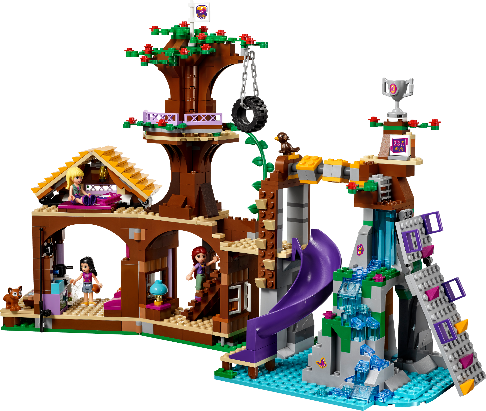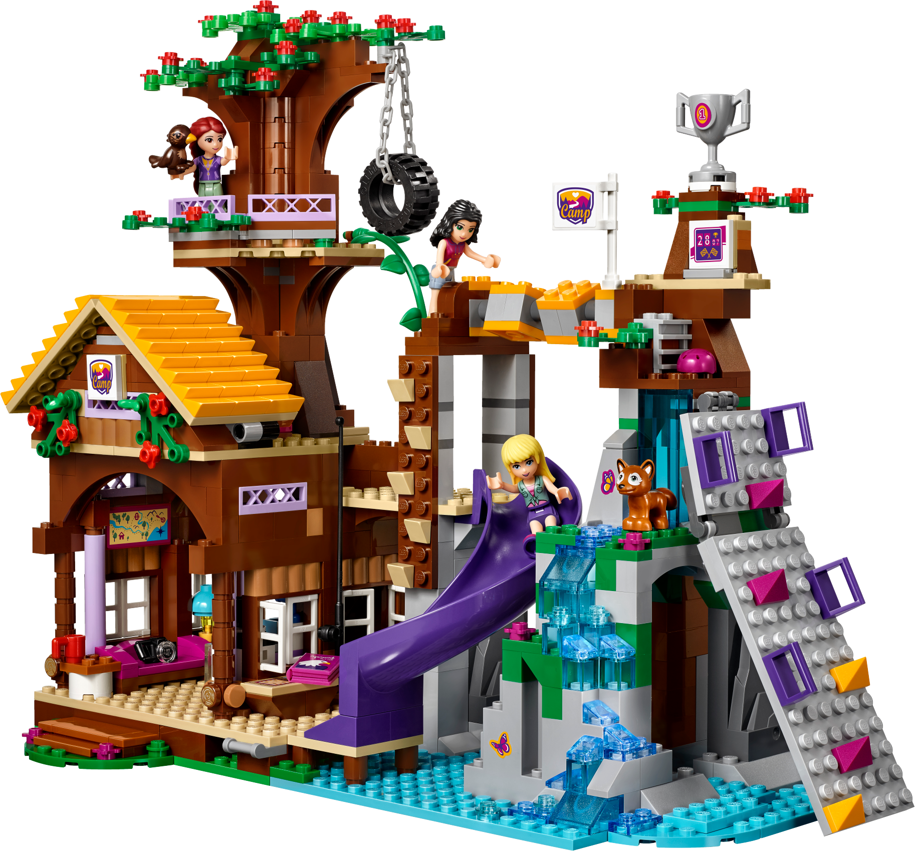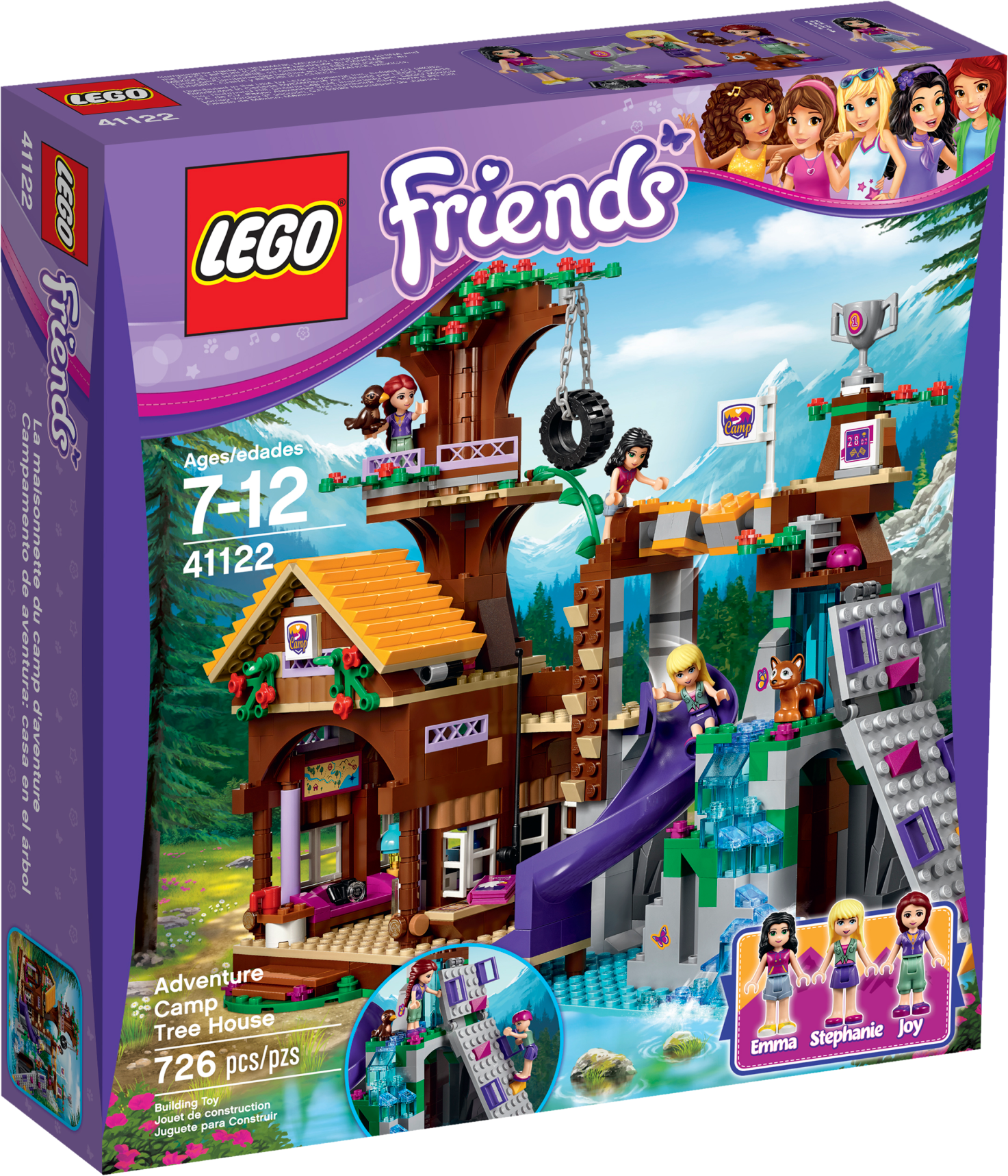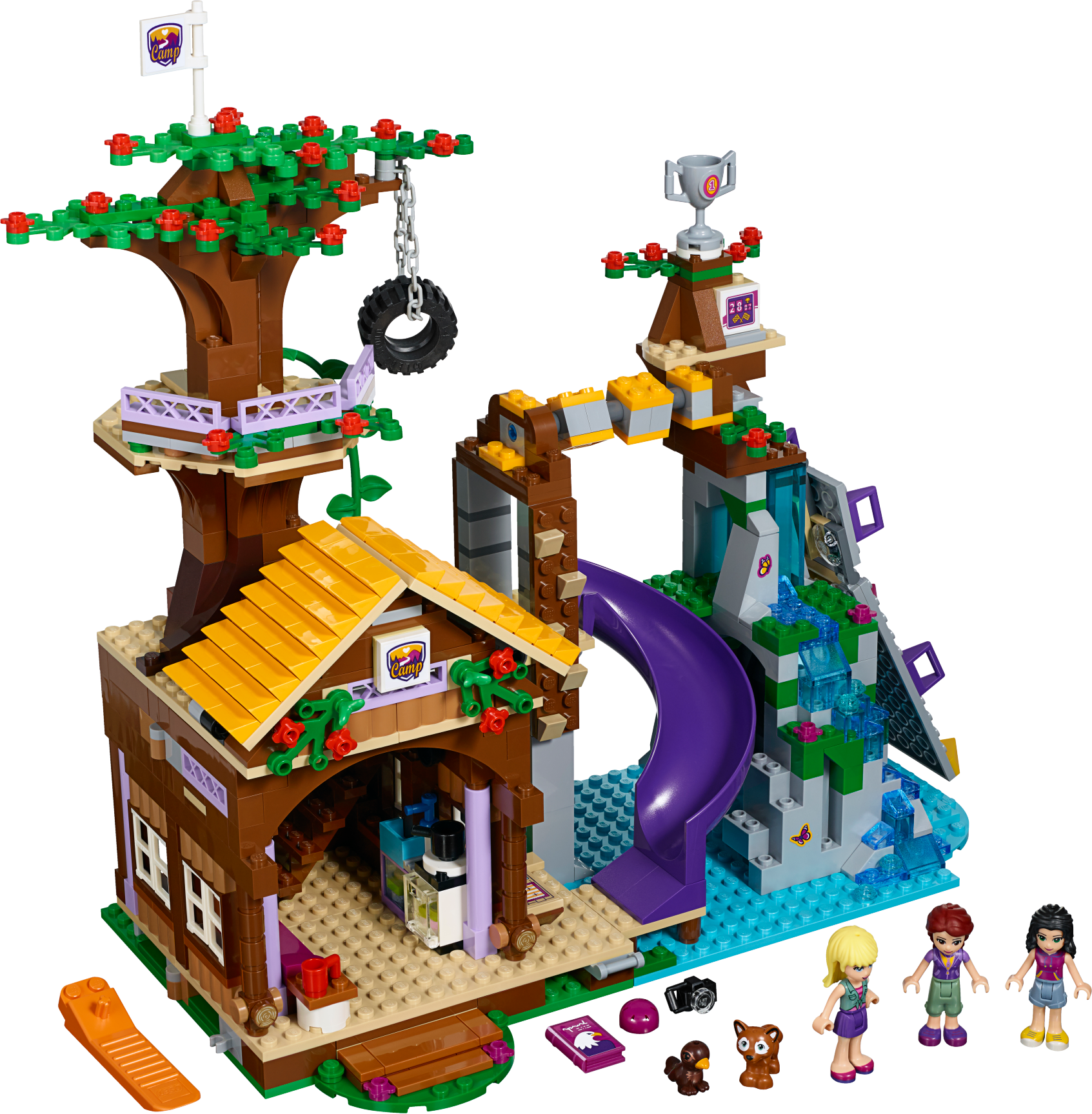 Challenge and adventure await at the Camp Tree House! Join Emma and Stephanie at the Camp Tree House for a crazy climbing challenge! The camp leader, Joy, with her tamed eagle Elvis, will guide you as you scale the climbing wall over the waterfall. Then use your balance to master the turning bridge and reach the treetops. You did it! Now whizz down the slide to catch a fish and cook it in the kitchen for supper with your friends, then tuck up in bed before another adventure tomorrow. Includes Stephanie, Emma and Joy the camp leader mini-doll figures in sportswear, plus an eagle and a fox. Features a Camp Tree House on 3 levels with living space, waterfall, turning bridge obstacle, tire swing, vine, slide and a climbing wall. The living space opens up and features opening windows, a kitchen with opening cupboard, sofa and stairs to an opening roof space for sleeping. Outdoor accessory elements include a helmet, trophy, flags, fishing rod and a camera. House accessory elements include a book, saucepan, cup, chicken leg, marmalade and a lamp. Swing the Tree House open and open the roof for easy play inside. Put on your helmet and use the grips on the climbing wall to make it to the trophy. Balance on the turning bridge and jump on the tire swing to reach the treetop platform. Use the camera to take a picture of the fox hidden in its natural habitat. Take hold of the fishing rod while Joy and her tame eagle Elvis teach you how to fish. Open the cupboards to find food and cook a meal in the kitchen. Climb the stairs to rest in the beds under the opening roof. This set offers an age-appropriate building experience for ages 7-12. This set includes over 700 bricks. Adventure Camp Tree House measures over 10” (26cm) high, 11” (29cm) wide and 4” (12cm) deep. Combine with 41120 Adventure Camp Archery and 41121 Adventure Camp Rafting for more Adventure Camp fun!