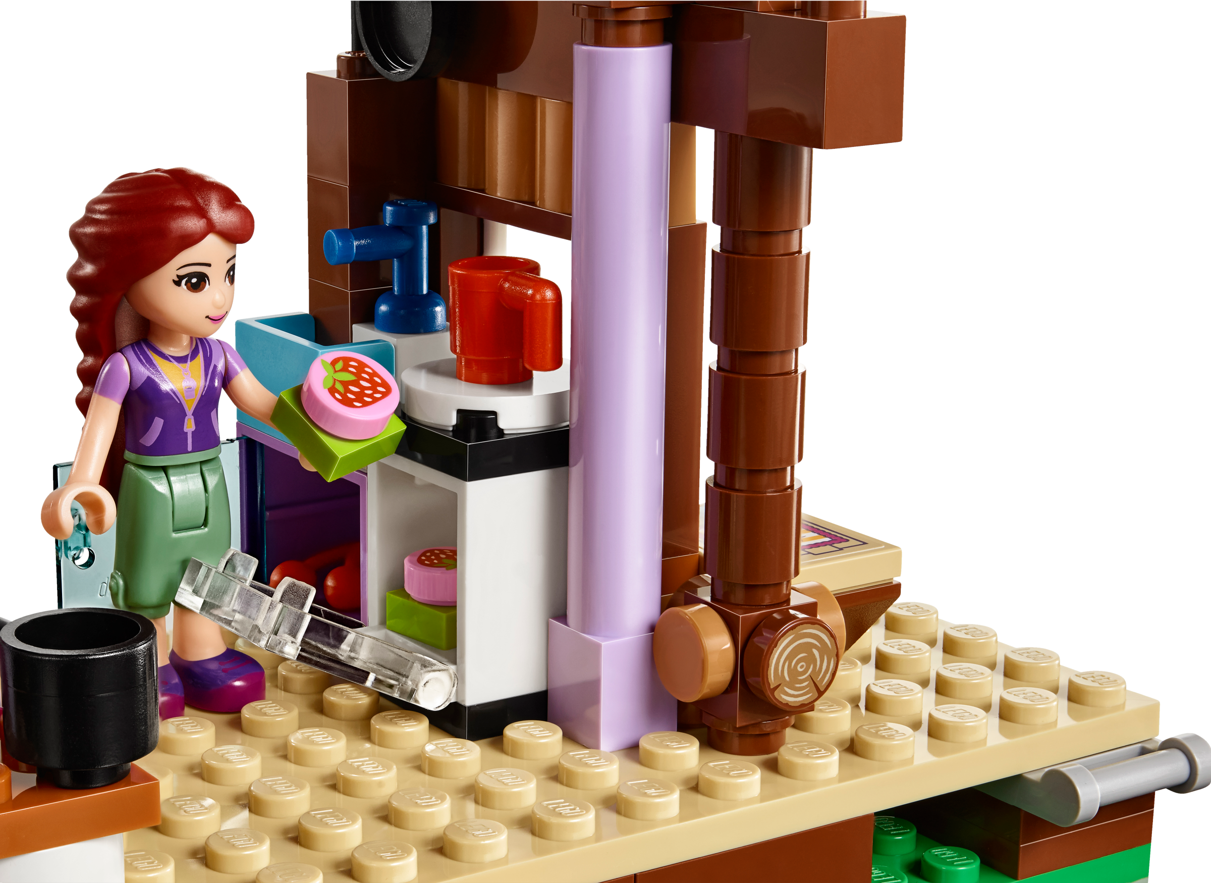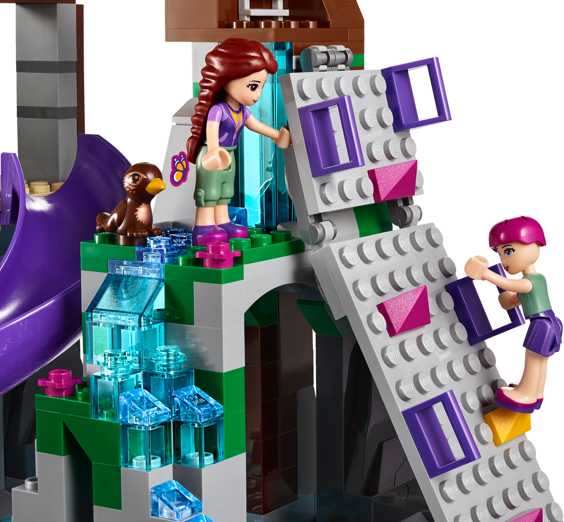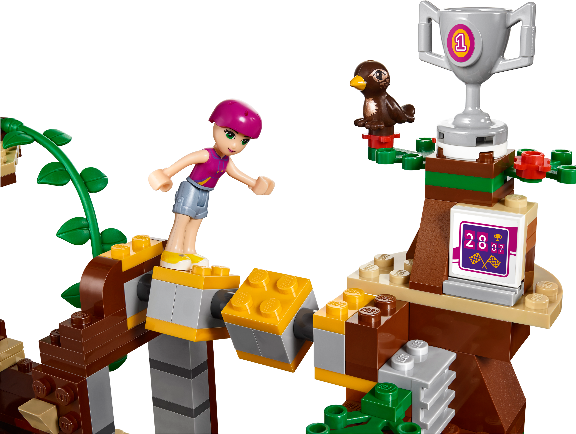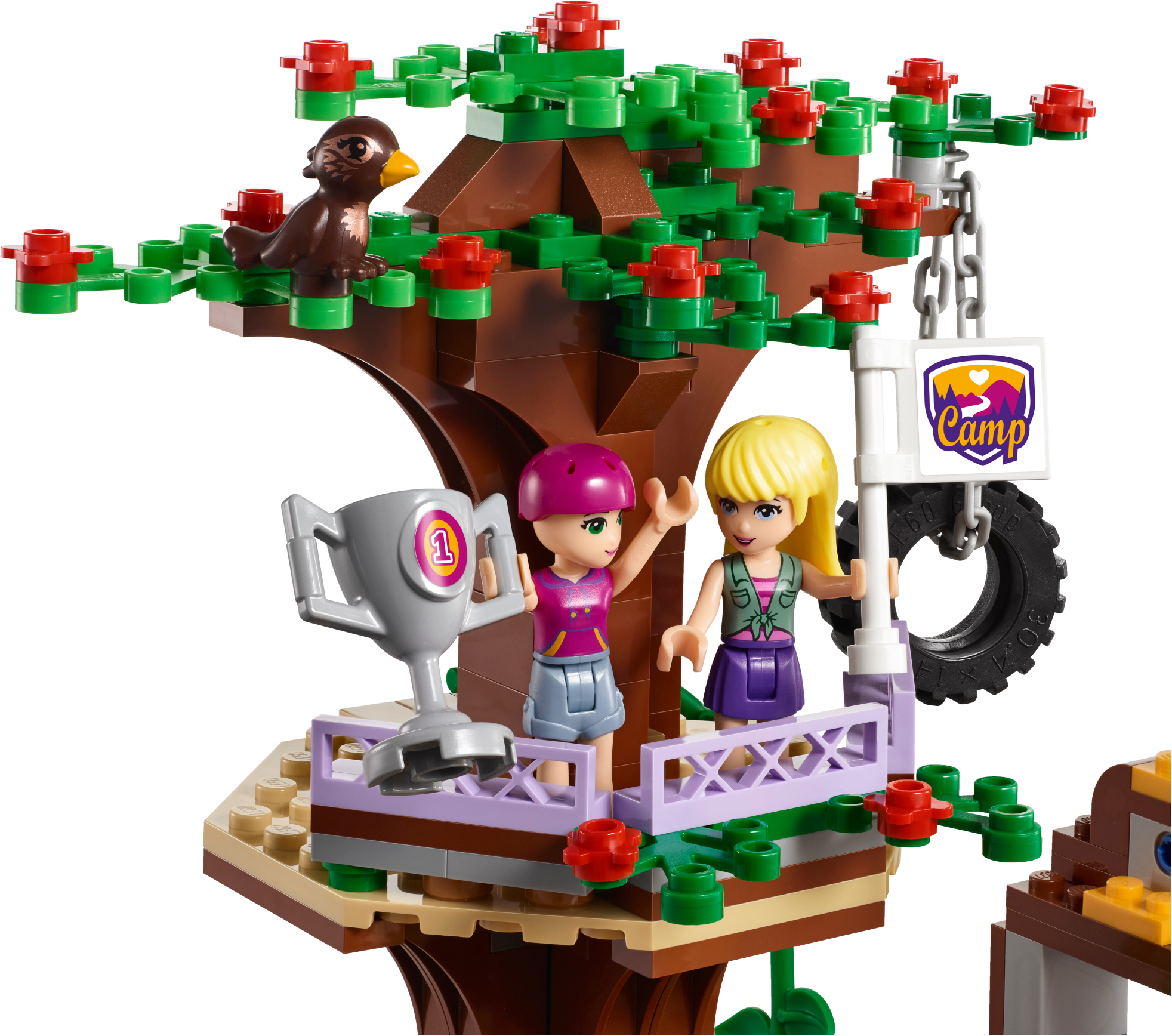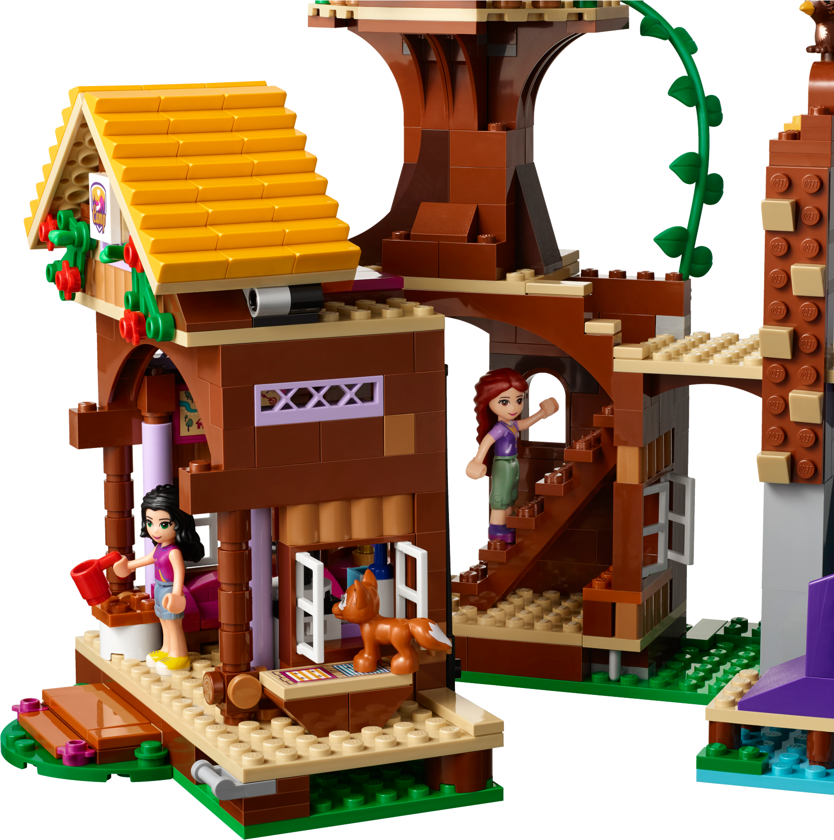 Challenge and adventure await at the Camp Tree House! Join Emma and Stephanie at the Camp Tree House for a crazy climbing challenge! The camp leader, Joy, with her tamed eagle Elvis, will guide you as you scale the climbing wall over the waterfall. Then use your balance to master the turning bridge and reach the treetops. You did it! Now whizz down the slide to catch a fish and cook it in the kitchen for supper with your friends, then tuck up in bed before another adventure tomorrow. Includes Stephanie, Emma and Joy the camp leader mini-doll figures in sportswear, plus an eagle and a fox. Features a Camp Tree House on 3 levels with living space, waterfall, turning bridge obstacle, tire swing, vine, slide and a climbing wall. The living space opens up and features opening windows, a kitchen with opening cupboard, sofa and stairs to an opening roof space for sleeping. Outdoor accessory elements include a helmet, trophy, flags, fishing rod and a camera. House accessory elements include a book, saucepan, cup, chicken leg, marmalade and a lamp. Swing the Tree House open and open the roof for easy play inside. Put on your helmet and use the grips on the climbing wall to make it to the trophy. Balance on the turning bridge and jump on the tire swing to reach the treetop platform. Use the camera to take a picture of the fox hidden in its natural habitat. Take hold of the fishing rod while Joy and her tame eagle Elvis teach you how to fish. Open the cupboards to find food and cook a meal in the kitchen. Climb the stairs to rest in the beds under the opening roof. This set offers an age-appropriate building experience for ages 7-12. This set includes over 700 bricks. Adventure Camp Tree House measures over 10” (26cm) high, 11” (29cm) wide and 4” (12cm) deep. Combine with 41120 Adventure Camp Archery and 41121 Adventure Camp Rafting for more Adventure Camp fun!