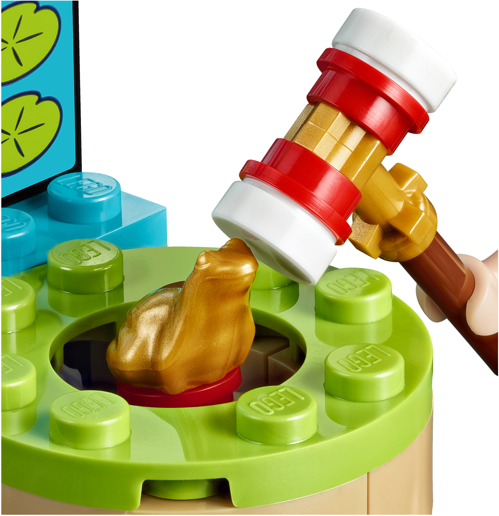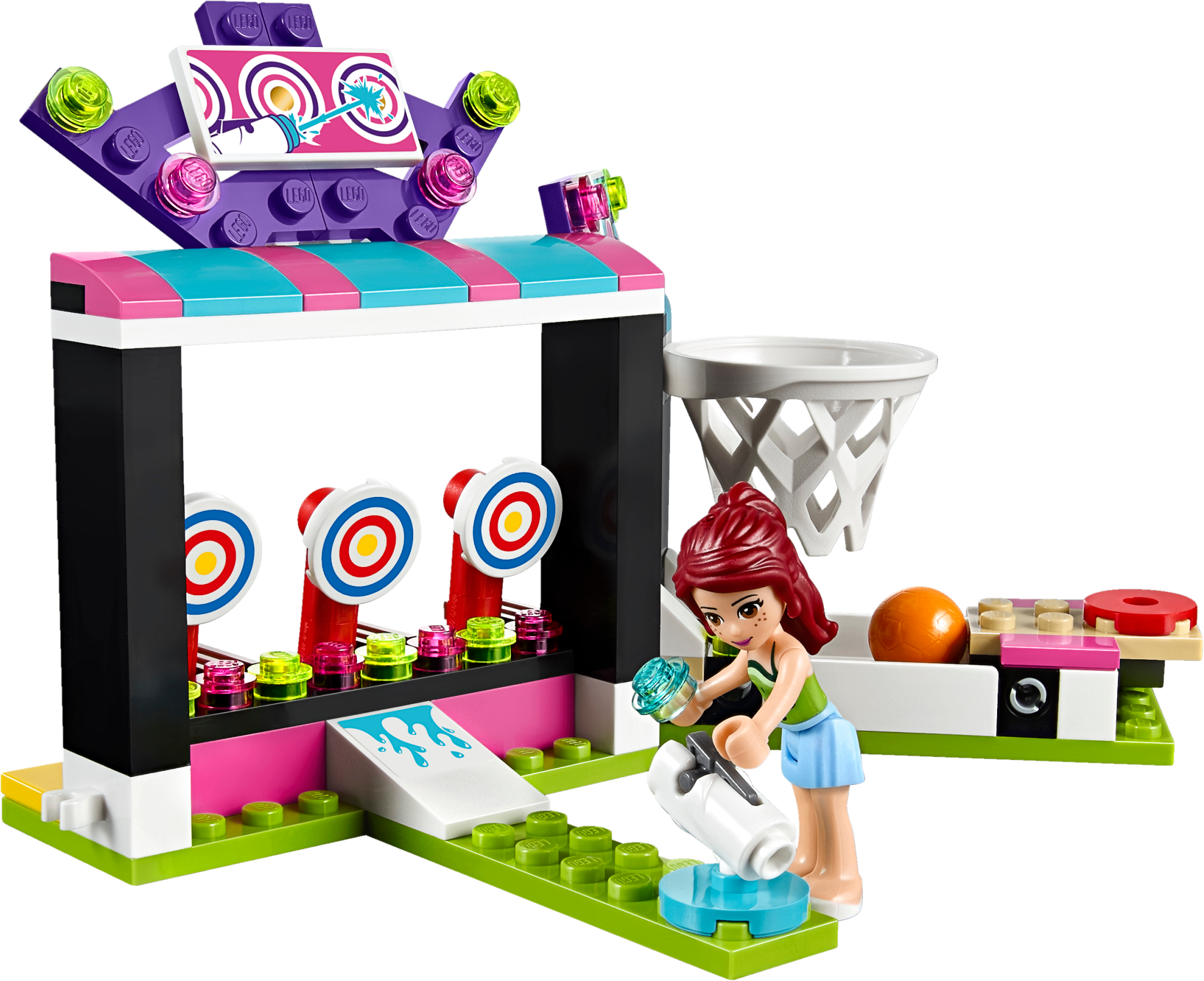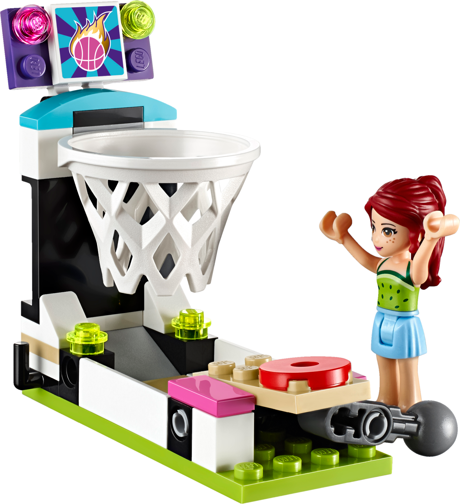 Launch, shoot, bash… and win at the Amusement Park Arcade! Mia is having fun playing the games in the Arcade—and she's getting better all the time! Help her catapult a basketball into the hoop, and when she's mastered that, turn to the water guns and see if you can knock down the targets. Finally, use the mallet to whack a frog as fast as possible. Mia's having so much fun she'll be here all day. Includes a Mia mini-doll figure in a summer outfit. Features 3 classic funfair arcade games with special functions: a basketball hoop with lever launch, 3 targets that can be knocked over using the water projectile gun with trigger function, and a whackable frog that pops down and back up when hit with a mallet. Accessory elements include an Amusement Park ticket, basketball and a mallet. Push the lever to shoot the basketball into the net. Take aim and push the trigger to launch the water gun projectiles and knock over the targets. Use the mallet to whack the frog down as fast as it appears. This set offers an age-appropriate building experience for ages 6-12. Amusement Park Arcade measures over 3” (9cm) high, 5” (15cm) wide and 3” (9cm) deep. Combine with the 41128 Amusement Park Space Ride, 41129 Amusement Park Hot Dog Van and 41130 Amusement Park Roller Coaster to create the Heartlake Amusement Park.
