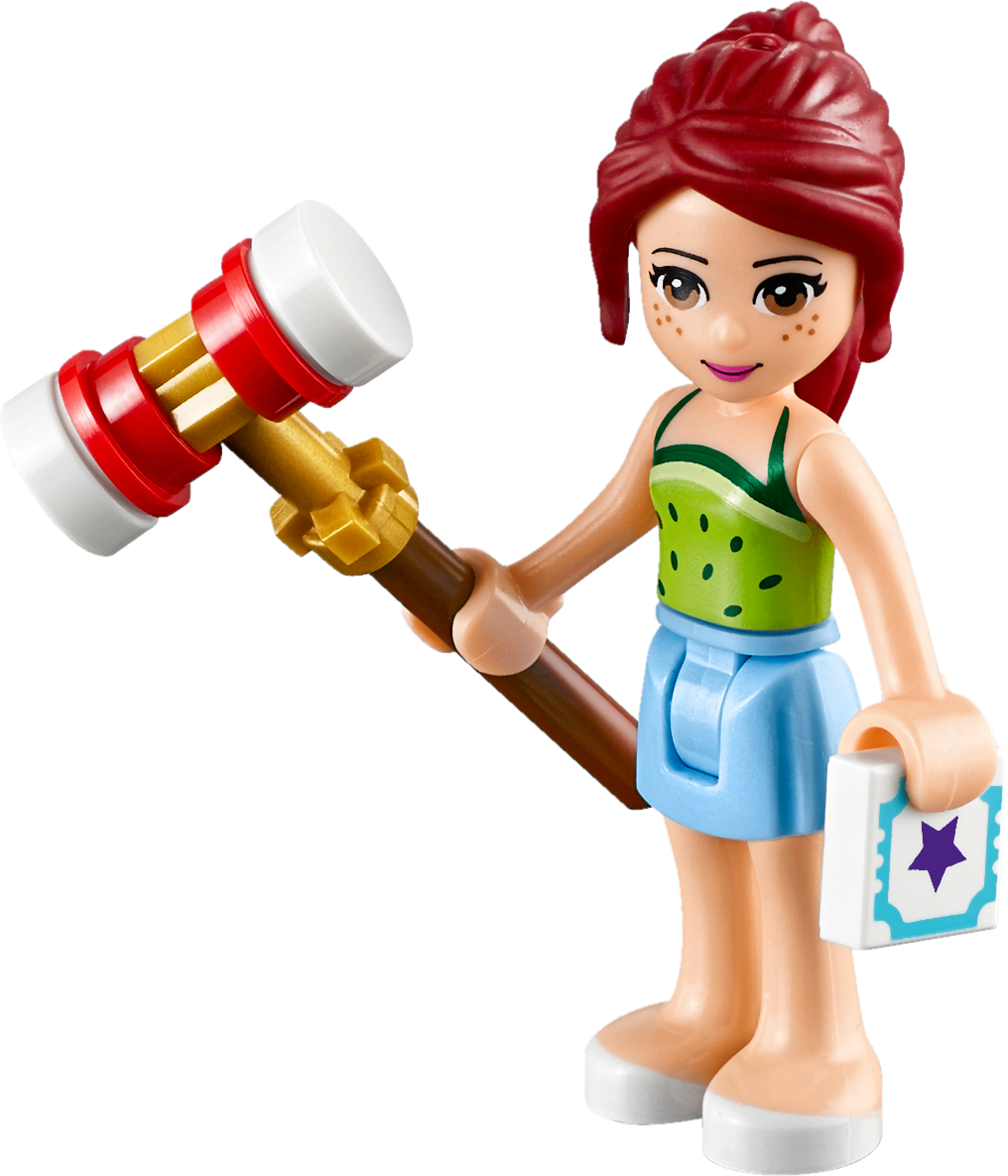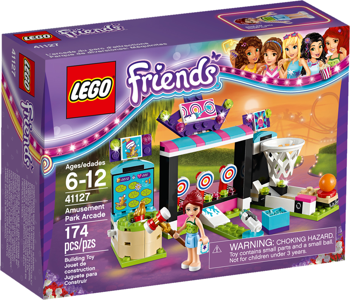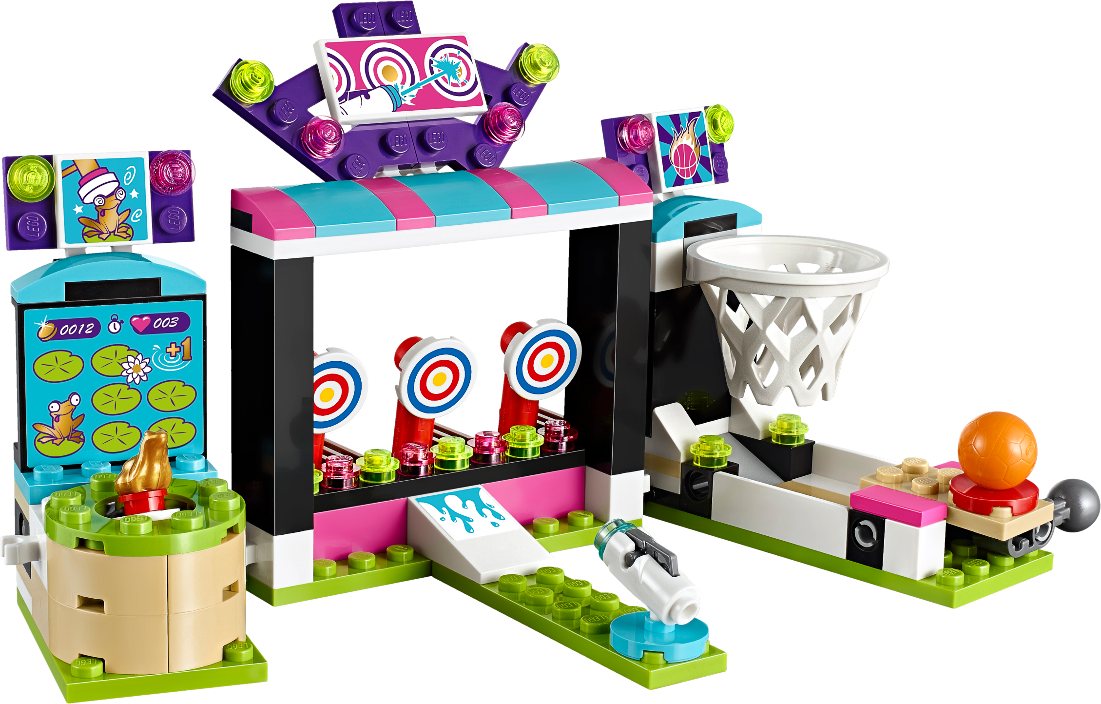 Launch, shoot, bash… and win at the Amusement Park Arcade! Mia is having fun playing the games in the Arcade—and she's getting better all the time! Help her catapult a basketball into the hoop, and when she's mastered that, turn to the water guns and see if you can knock down the targets. Finally, use the mallet to whack a frog as fast as possible. Mia's having so much fun she'll be here all day. Includes a Mia mini-doll figure in a summer outfit. Features 3 classic funfair arcade games with special functions: a basketball hoop with lever launch, 3 targets that can be knocked over using the water projectile gun with trigger function, and a whackable frog that pops down and back up when hit with a mallet. Accessory elements include an Amusement Park ticket, basketball and a mallet. Push the lever to shoot the basketball into the net. Take aim and push the trigger to launch the water gun projectiles and knock over the targets. Use the mallet to whack the frog down as fast as it appears. This set offers an age-appropriate building experience for ages 6-12. Amusement Park Arcade measures over 3” (9cm) high, 5” (15cm) wide and 3” (9cm) deep. Combine with the 41128 Amusement Park Space Ride, 41129 Amusement Park Hot Dog Van and 41130 Amusement Park Roller Coaster to create the Heartlake Amusement Park.