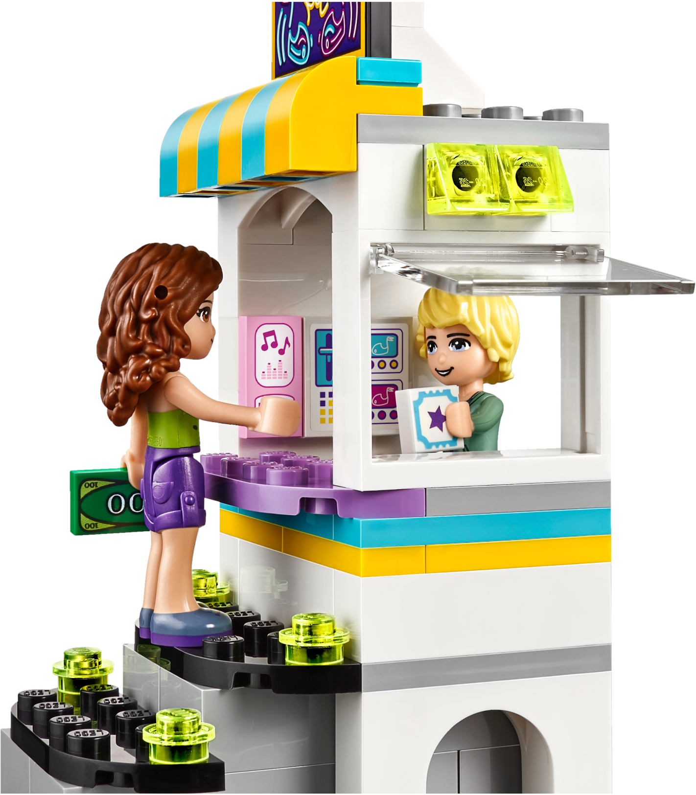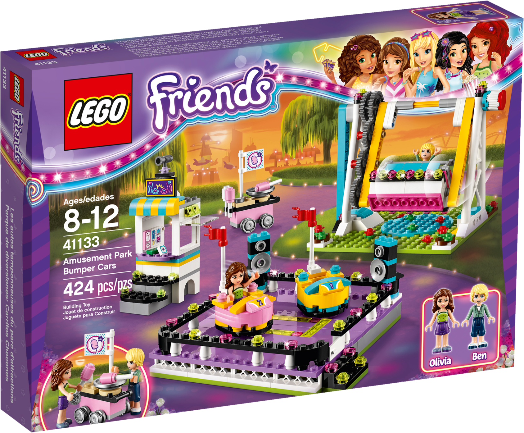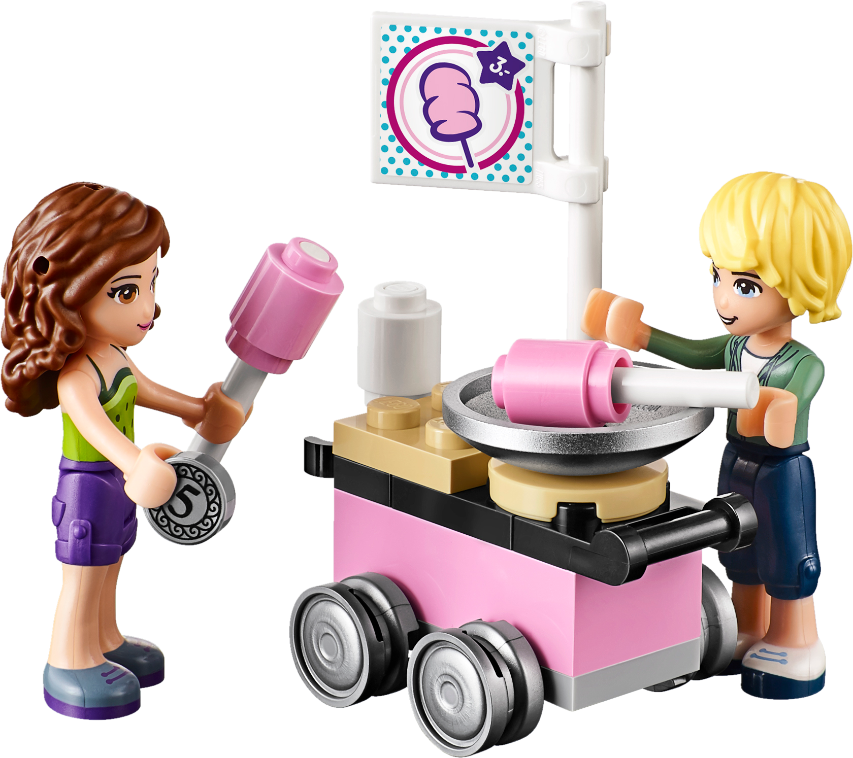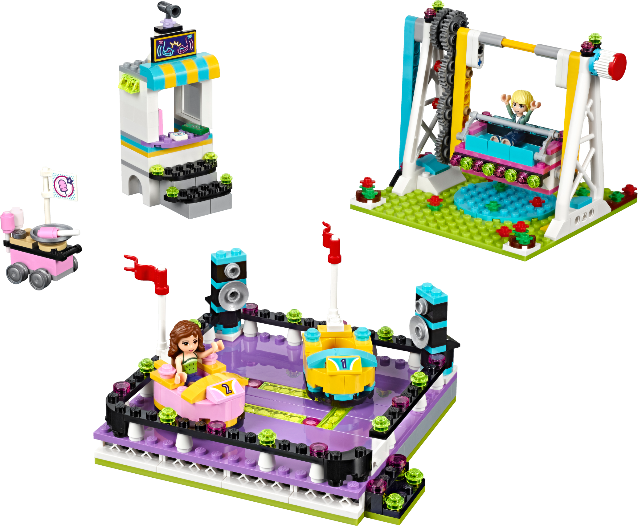 Bump on the bumper cars and swing on the shaker! Jump into the iconic shaker ride with Olivia, pull down the safety bar and hold on tight as it starts to rock then swing higher and higher… until it swings upside down and right over the top! Then head over to meet Ben on the bumper cars, buy a ticket and enjoy the ride. Afterwards, enjoy some delicious cotton candy from the cart nearby. Includes Olivia and Ben mini-doll figures in summer outfits. Features an iconic bumper car arena with 2 bumper cars with flags, steps, opening door and rotating speakers; shaker ride with 3 seats, opening safety bar and swinging and rocking function; ticket booth with steps and an opening window; and a cotton candy cart with turning wheels. Accessory elements include a ticket, bill, coin, mp3 player, cotton candy pan and 3 cotton candy sticks. Steer the bumper cars with their tall flags to bump them into each other. Rotate the toggle to make the shaker ride rock and swing higher and higher. Buy some delicious cotton candy from the rolling cart. This set offers an age-appropriate building experience for ages 8-12. Bumper car arena measures over 3” (10cm) high, 5” (14cm) wide and 4” (12cm) deep. Shaker ride measures over 3” (10cm) high, 4” (12cm) wide and 5” (13cm) deep. Ticket booth measures over 4” (11cm) high, 2” (6cm) wide and 1” (4cm) deep. Cotton candy cartmeasures over 1” (4cm) long, 1” (3cm) wide and under 1” (2cm) high. Combine with the 41127 Amusement Park Arcade, 41128 Amusement Park Ride, 41129 Amusement Park Hot Dog Van and 41130 Amusement Park Roller Coaster to create the Heartlake Amusement Park.