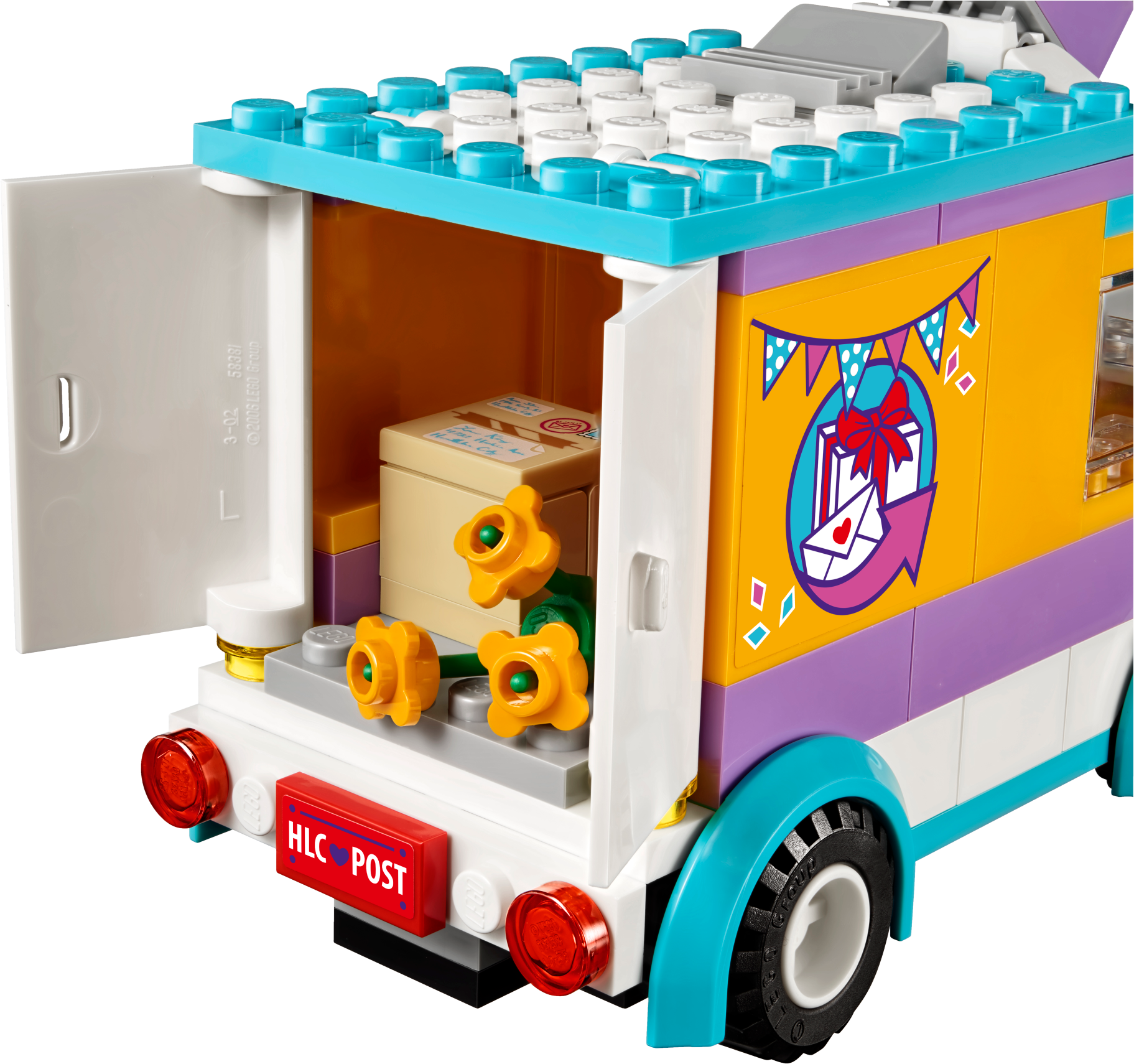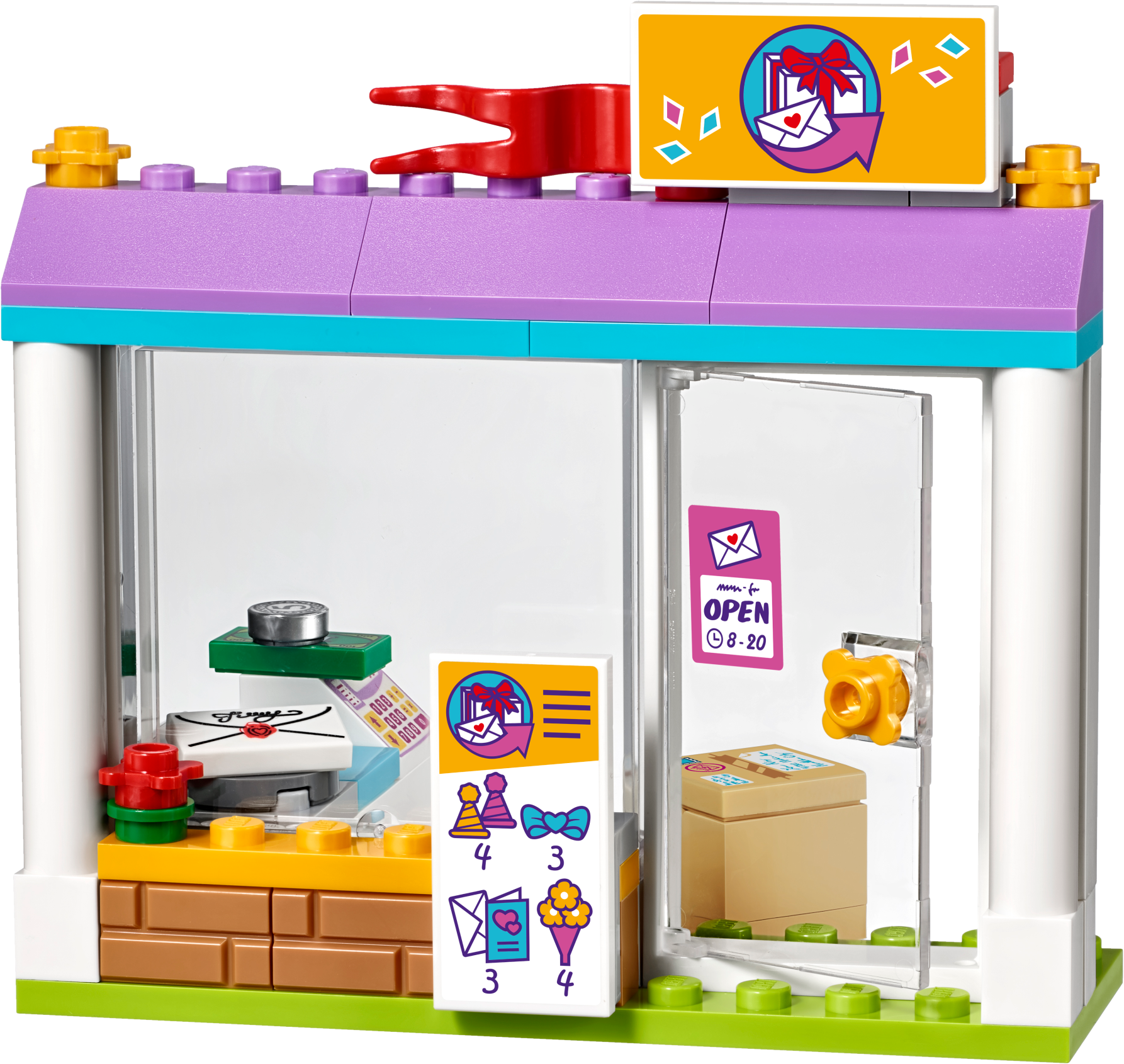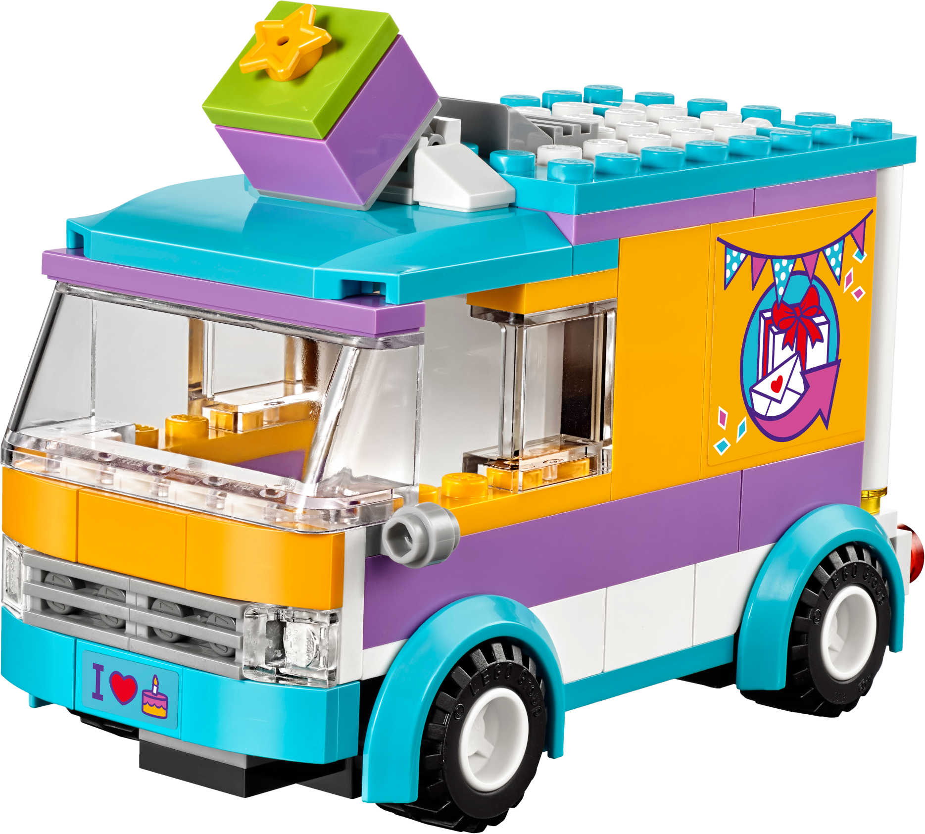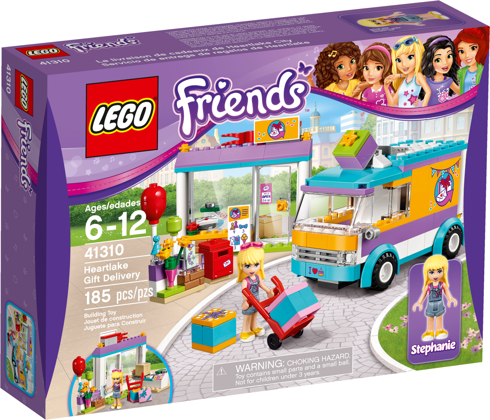 Help Stephanie make a LEGO® Friends Heartlake Gift Delivery, featuring a van and shop facade with a gift stand, mailbox and a cash register. Select a present from the stand, pack it into a gift box and then use the sack truck to help load it into the van for deliveries all around Heartlake City. Includes a mini-doll figure. Includes a Stephanie mini-doll figure. Features a gift delivery van, a shop facade with opening door, mailbox, cash register and a gift stand. Accessory elements include a sack truck, two gift boxes, two balloons, two party hats, two invitations, flowers, bill and a coin. Take orders from customers in the shop and then pack up their gift. Load up the van and enjoy delivering gifts and flowers across Heartlake City. This set offers an age-appropriate build and play experience forages 5 -12. Van measures over 3” (9cm) high, 4” (11cm) long and 1” (5cm) wide. Shop facade measures over 3” (9cm) high, 3” (9cm) wide and 1” (3cm) deep.
