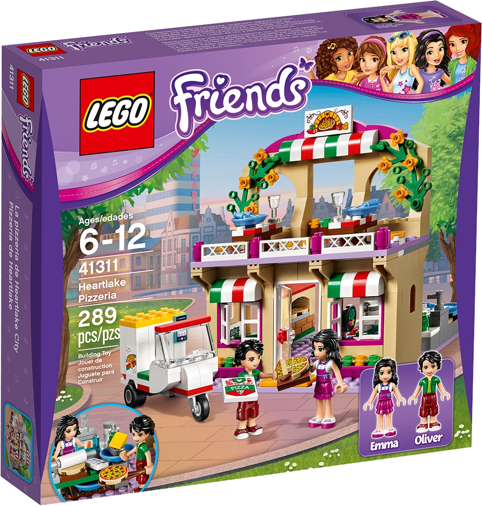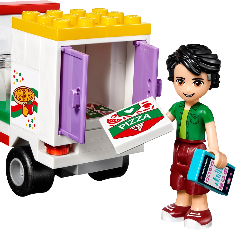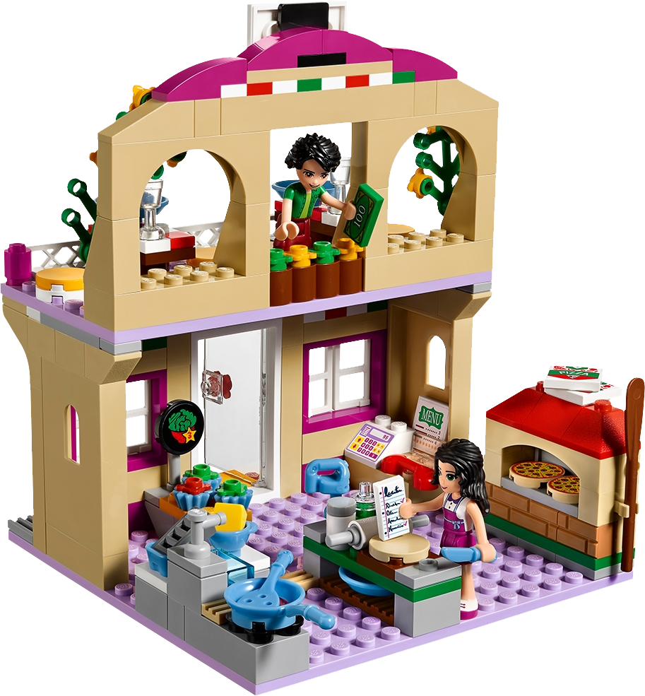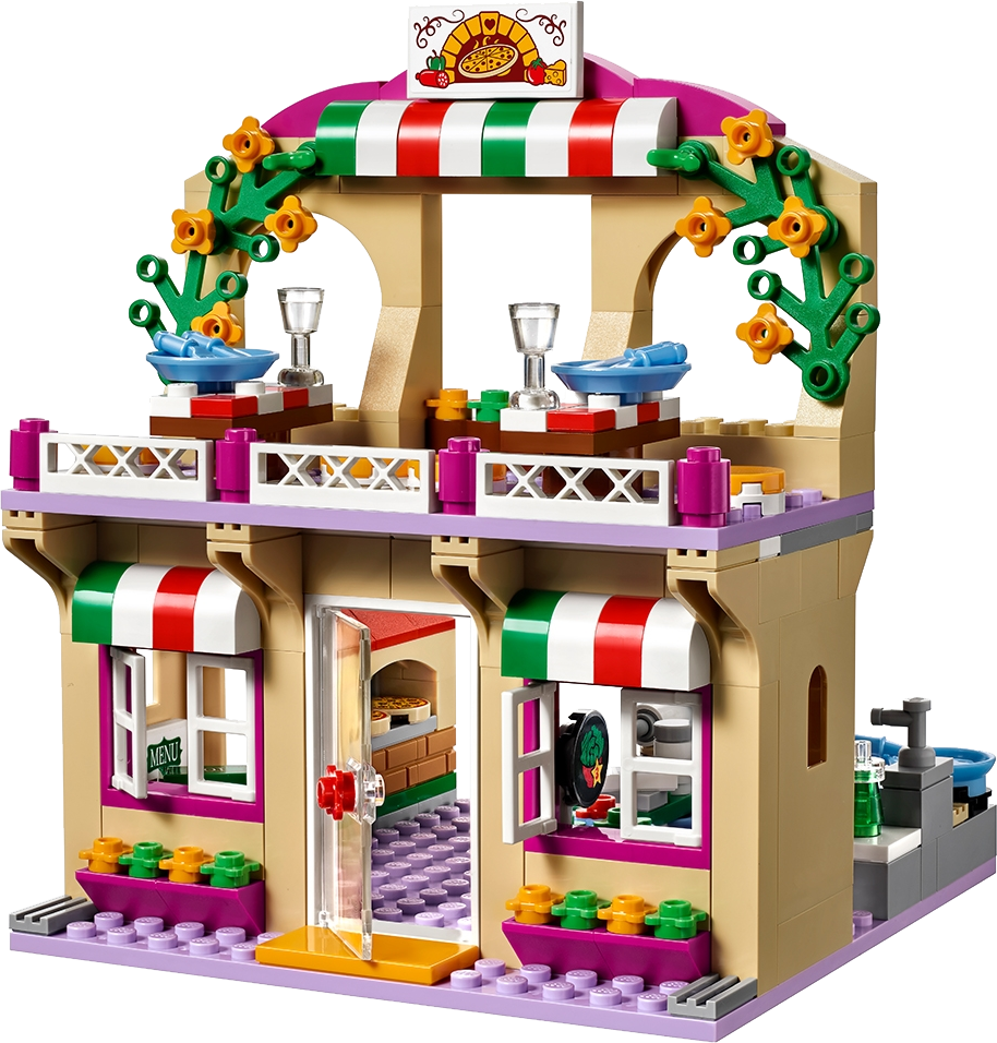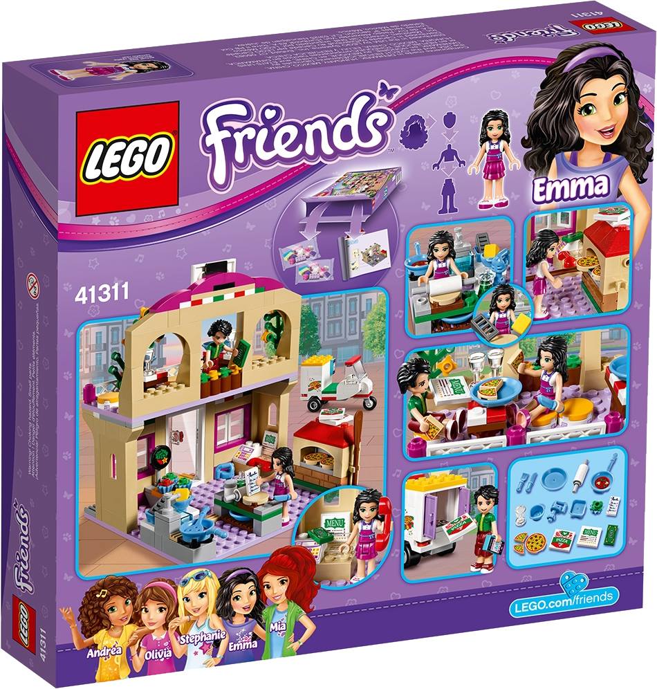 The LEGO® Friends Heartlake Pizzeria has all the equipment needed to play at making and baking fresh pizza in the kitchen. Serve them out on the restaurant balcony, or use the phone to take orders then deliver them with Oliver on the scooter. There’s even a stand selling basil and tomato plants to happy customers. Includes two mini-doll figures. Includes Emma and Oliver mini-doll figures. Features a two-story Pizzeria building and a delivery scooter. The Pizzeria building features a downstairs kitchen with opening door and windows, a pizza oven, worktop, sink, hob, cash register and plant stand, plus an upstairs restaurant balcony with tables and stools. Kitchen accessory elements include a pizza base, three pizzas with different toppings, pizza slice, pizza paddle, frying pan, cheese grater, bowl, hand whisk, rolling pin, food container, sauce bottle, and tomato and basil plants. Restaurant accessory elements include plates, glasses, mobile phone, cash register and a bill. Prepare pizzas in the restaurant kitchen and use the paddle to place them in the pizza oven. Take orders for delivery over the phone, then jump on the scooter to deliver them. Help Emma serve fresh pizza to customers on the restaurant balcony. This set offers an age-appropriate build and play experience for ages 5-12. Pizzeria building measures over 5” (15cm) high, 4” (12cm) wide and 4” (12cm) deep. Delivery scooter measures over 1” (5cm) high, 2” (7cm) long and 1” (3cm) wide.