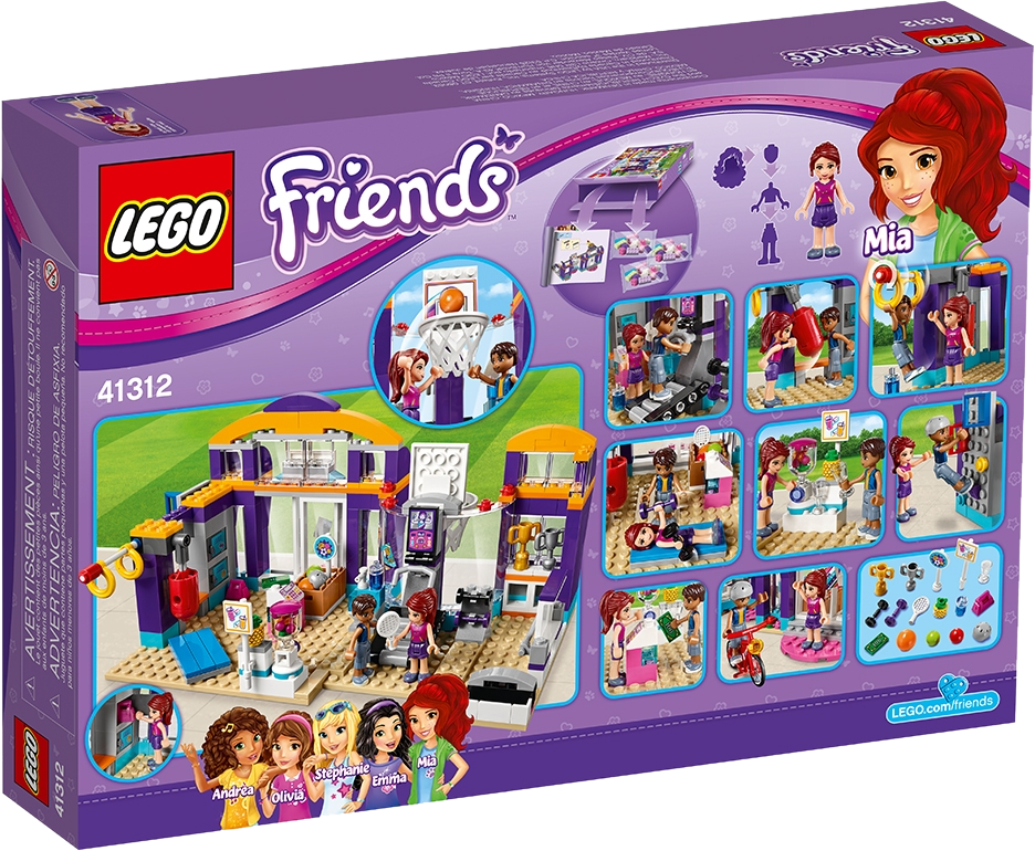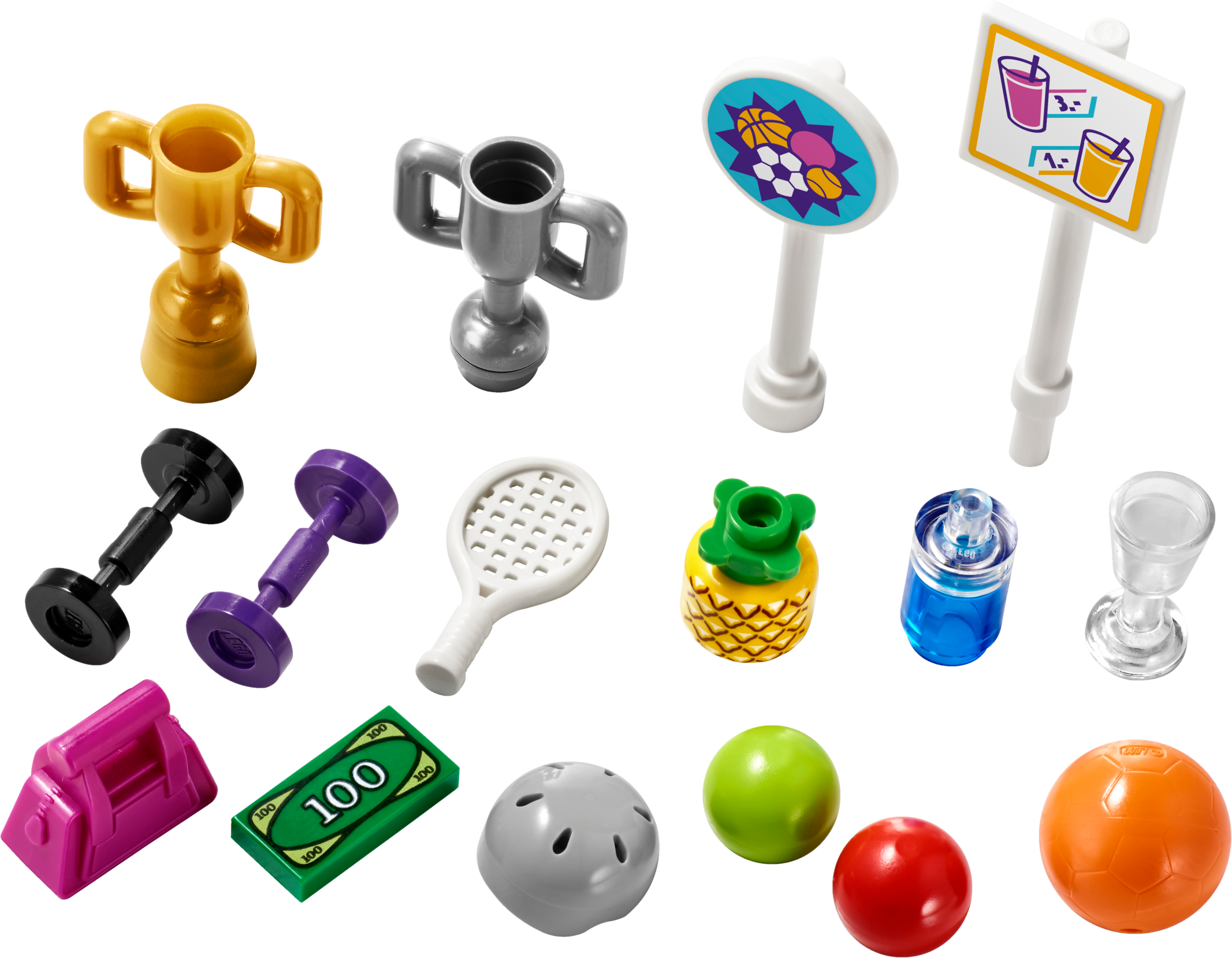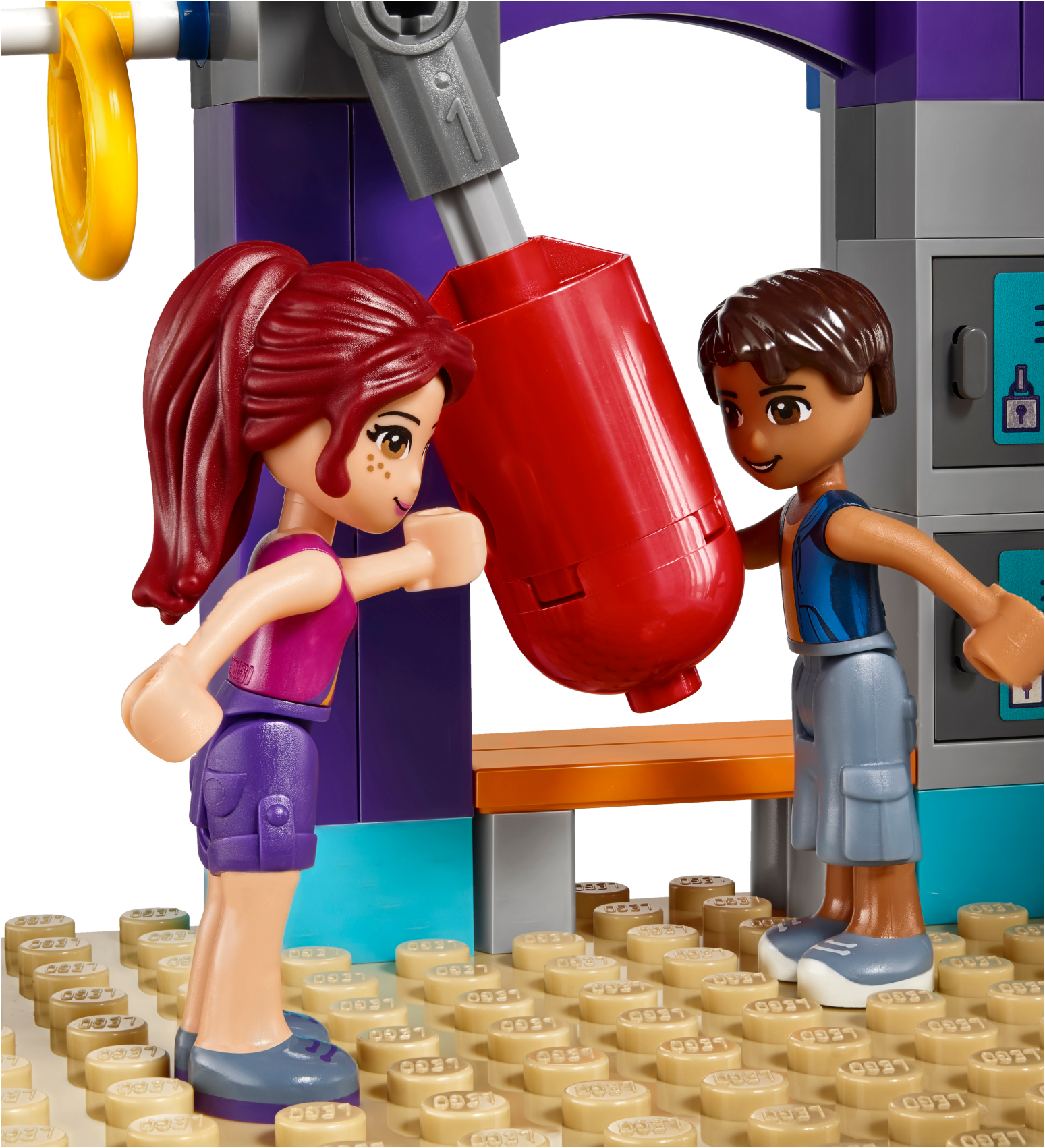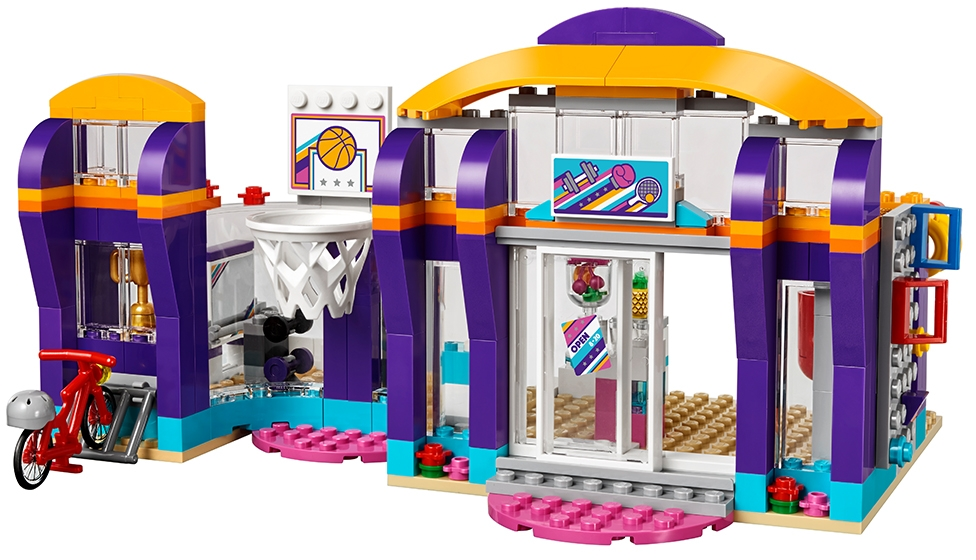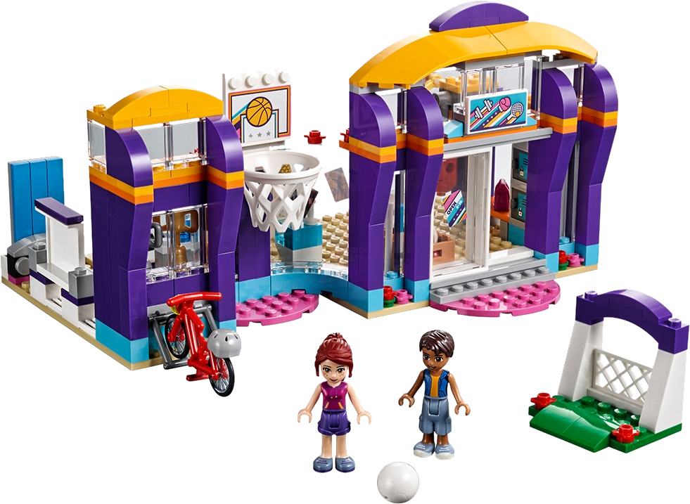 Get active at the LEGO® Friends Heartlake Sports Center. Inside the sliding entrance door there are lockers, a gym with a punch bag and gymnastic rings, juice bar, rolling treadmill and a yoga studio with an exercise bar, weights and a yoga mat. Outside there’s a bike rack, soccer goal and basketball game with shooting function. Includes two mini-doll figures. Includes Mia and Robert mini-doll figures. Features a sliding door, two opening lockers, gym with punch bag and gymnastic rings, juice bar with blender, rolling treadmill, studio with exercise bar and mirror, basketball game with shooting function, soccer goal, bike rack and a bicycle. Accessory elements include balls, bill, pineapple, water bottle, weights and a yoga mat. Help Mia train Robert in the gym as he gets to grips with the punch bag. Take out the yoga mat for a session in the studio. Test your skill with the shooting function at the basketball hoop. Go cycling around Heartlake City on the bicycle. This set offers an age-appropriate build and play experience for ages 5-12. Combine with the 41313 Heartlake Summer Pool to expand the leisure experience. Sports Center measures over 4” (12cm) high, 9” (23cm) wide and 5” (15cm) deep.