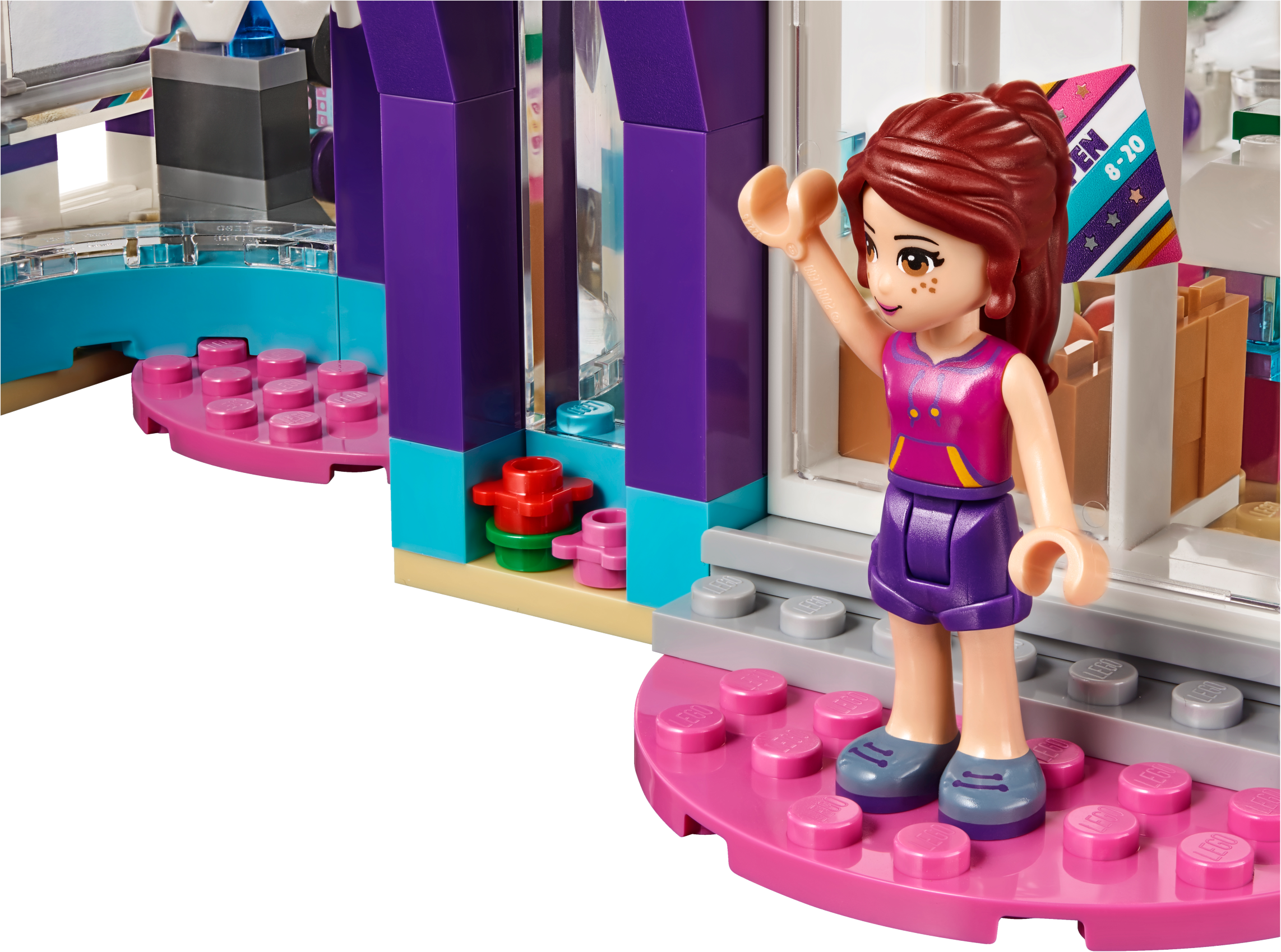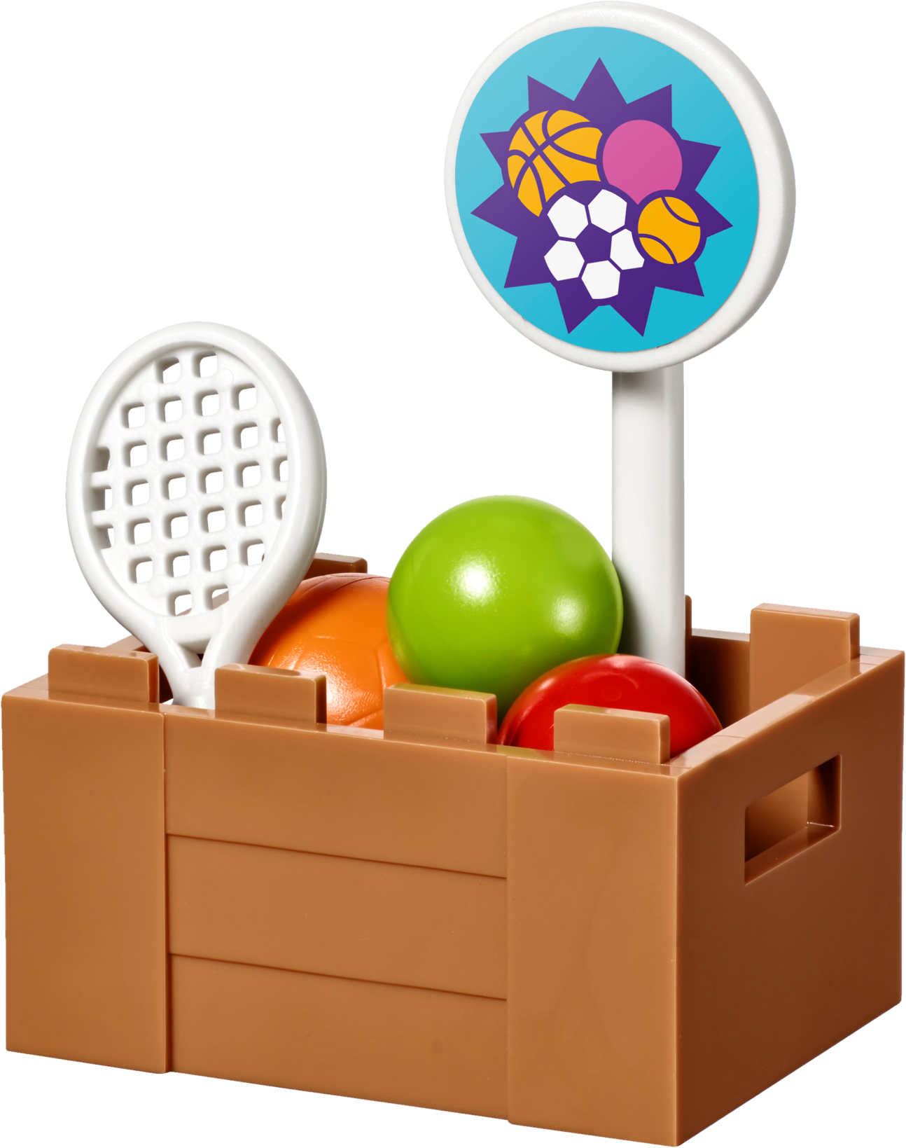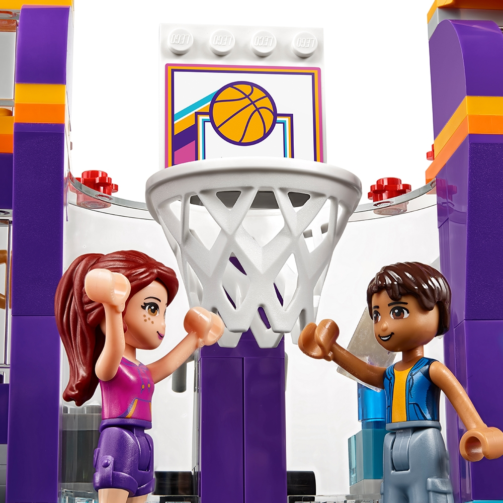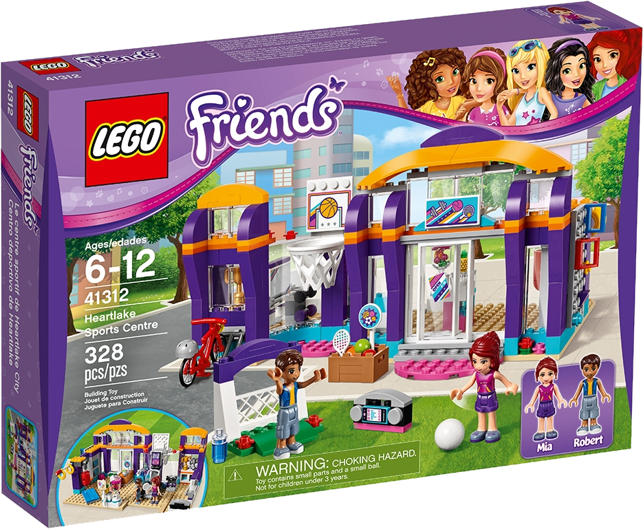 Get active at the LEGO® Friends Heartlake Sports Center. Inside the sliding entrance door there are lockers, a gym with a punch bag and gymnastic rings, juice bar, rolling treadmill and a yoga studio with an exercise bar, weights and a yoga mat. Outside there’s a bike rack, soccer goal and basketball game with shooting function. Includes two mini-doll figures. Includes Mia and Robert mini-doll figures. Features a sliding door, two opening lockers, gym with punch bag and gymnastic rings, juice bar with blender, rolling treadmill, studio with exercise bar and mirror, basketball game with shooting function, soccer goal, bike rack and a bicycle. Accessory elements include balls, bill, pineapple, water bottle, weights and a yoga mat. Help Mia train Robert in the gym as he gets to grips with the punch bag. Take out the yoga mat for a session in the studio. Test your skill with the shooting function at the basketball hoop. Go cycling around Heartlake City on the bicycle. This set offers an age-appropriate build and play experience for ages 5-12. Combine with the 41313 Heartlake Summer Pool to expand the leisure experience. Sports Center measures over 4” (12cm) high, 9” (23cm) wide and 5” (15cm) deep.