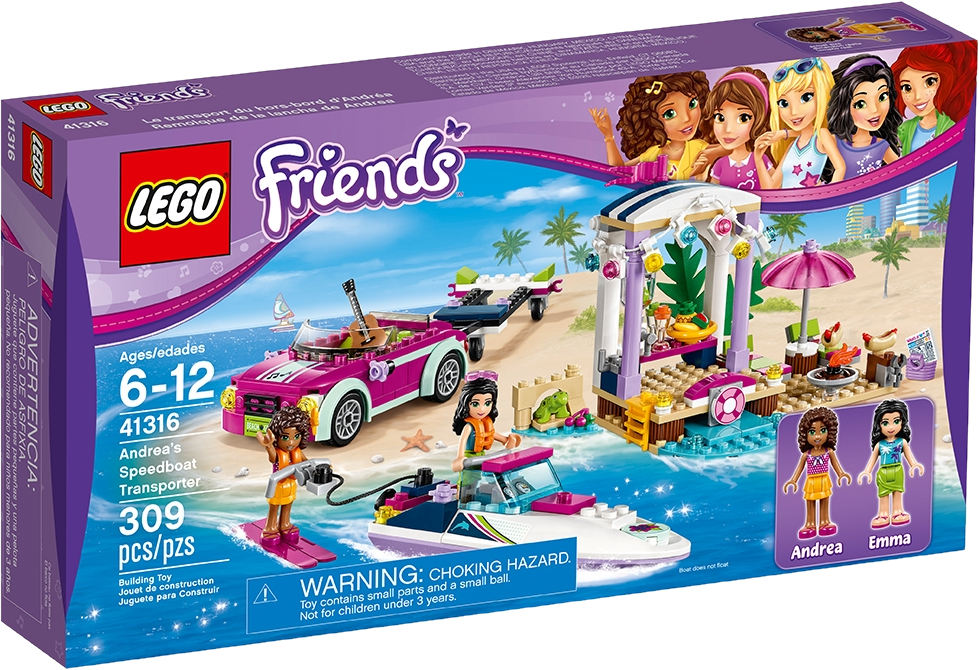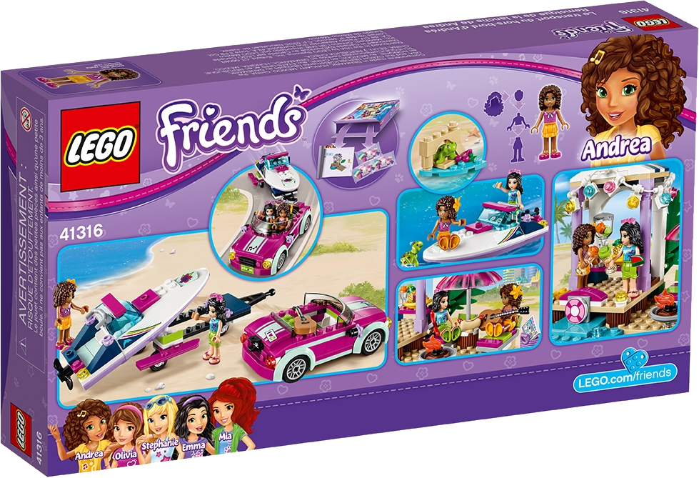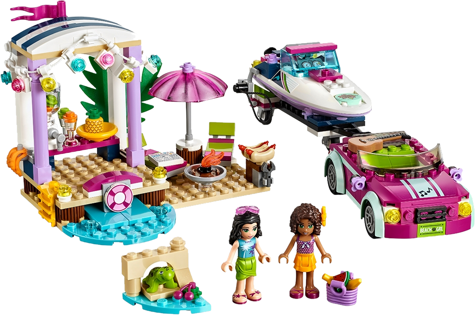 LEGO® Friends Andrea’s Speedboat Transporter is the coolest way to cruise the Heartlake coastline by land or sea. The sporty beach car has a trailer and rope for towing, and the speedboat has steering controls and a turning propeller. Enjoy the party scene with a juice bar, beach area, sun loungers and a barbecue. Includes 2 mini-doll figures and a turtle figure. Includes Andrea and Emma mini-doll figures, plus a Bubbles the turtle figure. Features a speedboat with steering controls and turning propeller, beach car with trailer, and a party scene with juice bar, blender, 2 sun loungers, parasol and a barbecue. Accessory elements include a guitar, juice glasses, pineapple, bananas, sausages, hot dog buns basket and a magazine tile. Drive the coastline in the cool, sporty beach car in search of the perfect launch. Discover Heartlake sea life in the speedboat and make friends with the turtle. Pull up to the beach party and enjoy hot dogs from the barbecue. Speedboat does not float on water. Speedboat measures over 1” (4cm) high, 4” (11cm) long and 2” (6cm) wide. Car measures over 1” (3cm) high, 3” (10cm) long and 1” (5cm) wide. Trailer measures over 4” (12cm) long and 2” (6cm) wide, and under 1” (2cm) high. Party scene measures over 3” (9cm) high, 4” (12cm) wide and 3” (9cm) deep. Combine with other LEGO® Friends beach sets as the perfect way to get from the 41315 Beach Shop to the 41317 Catamaran.