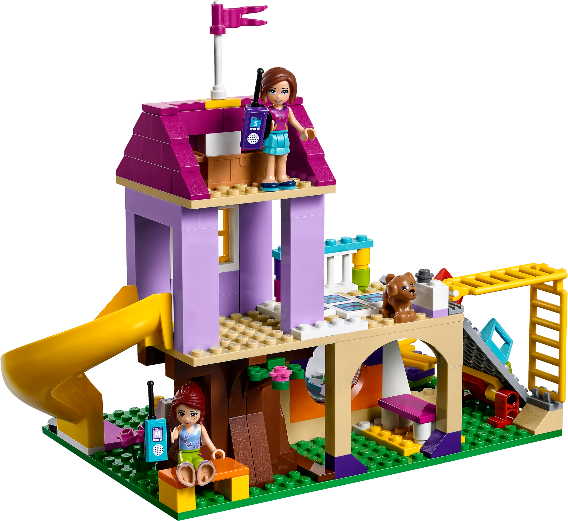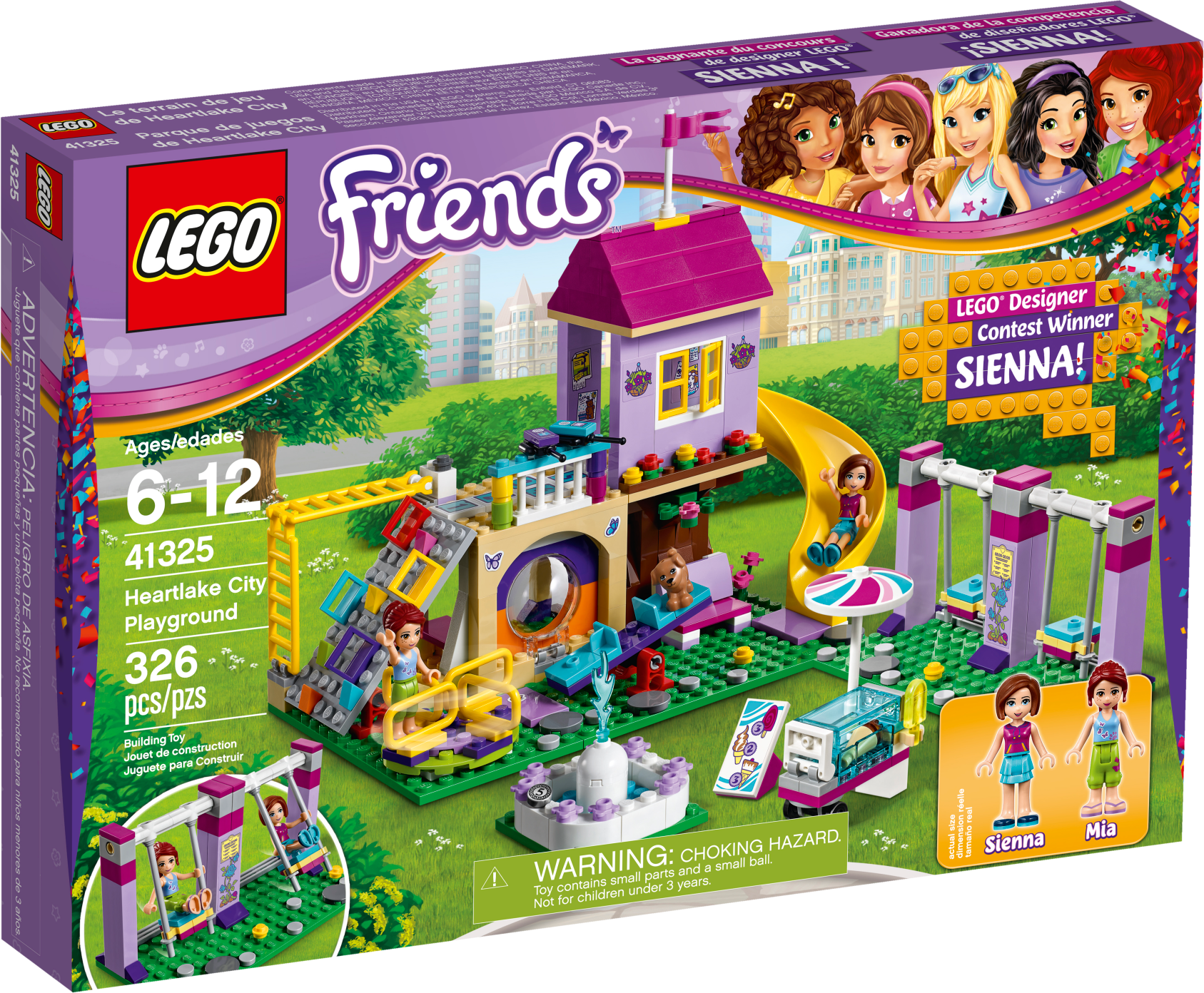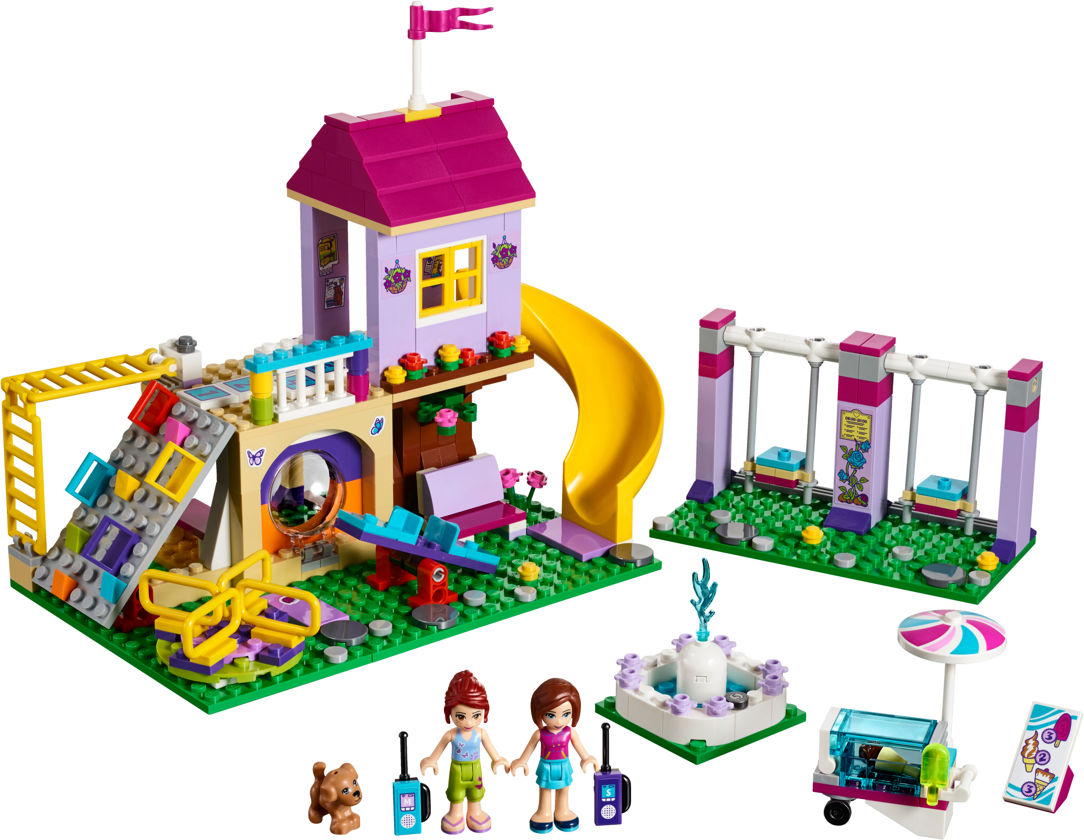 Designed by 9 year old Sienna – winner of the LEGO® Friends Designer contest. Learn more LEGO® Friends Heartlake City Playground is the perfect place to have a blast with your besties. Centered around a tree house, it includes a climbing wall with colored holds and a twister slide. Push the functioning swings to make them go back and forth, spin the merry-go-round and make the 2 mini-doll figures go up and down on the seesaw. Help them take a seat on the benches as they watch Pippa the dog stretch her legs, then use the walkie-talkies to invite more friends to come out and play! Includes Mia and Sienna mini-doll figures, plus a Pippa the dog figure. Features a tree house playground with slide, climbing wall, swings, merry-go-round, seesaw, hopscotch, monkey bars, benches, fountain and an ice cream cart. Accessory elements include 2 walkie-talkies, ice cream, popsicle and a coin. Meet up with friends at the playground and have fun pushing the swings, spinning the merry-go-round and working the seesaw! Climb up the climbing wall to the tree house and enjoy the view from up high. Buy an ice cream from the cart and enjoy it as you relax by the fountain. This set is suitable for ages 6-12. Playground measures over 7” (19cm) high, 9” (23cm) wide and 4” (12cm) deep.