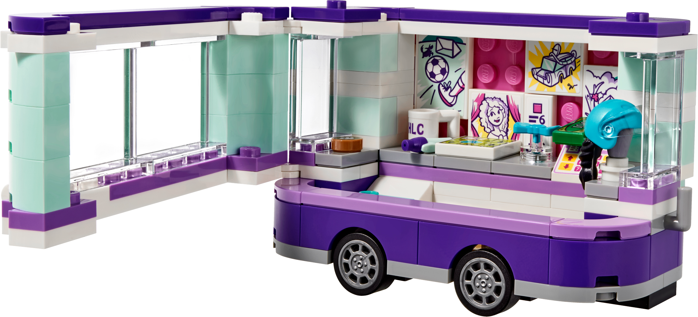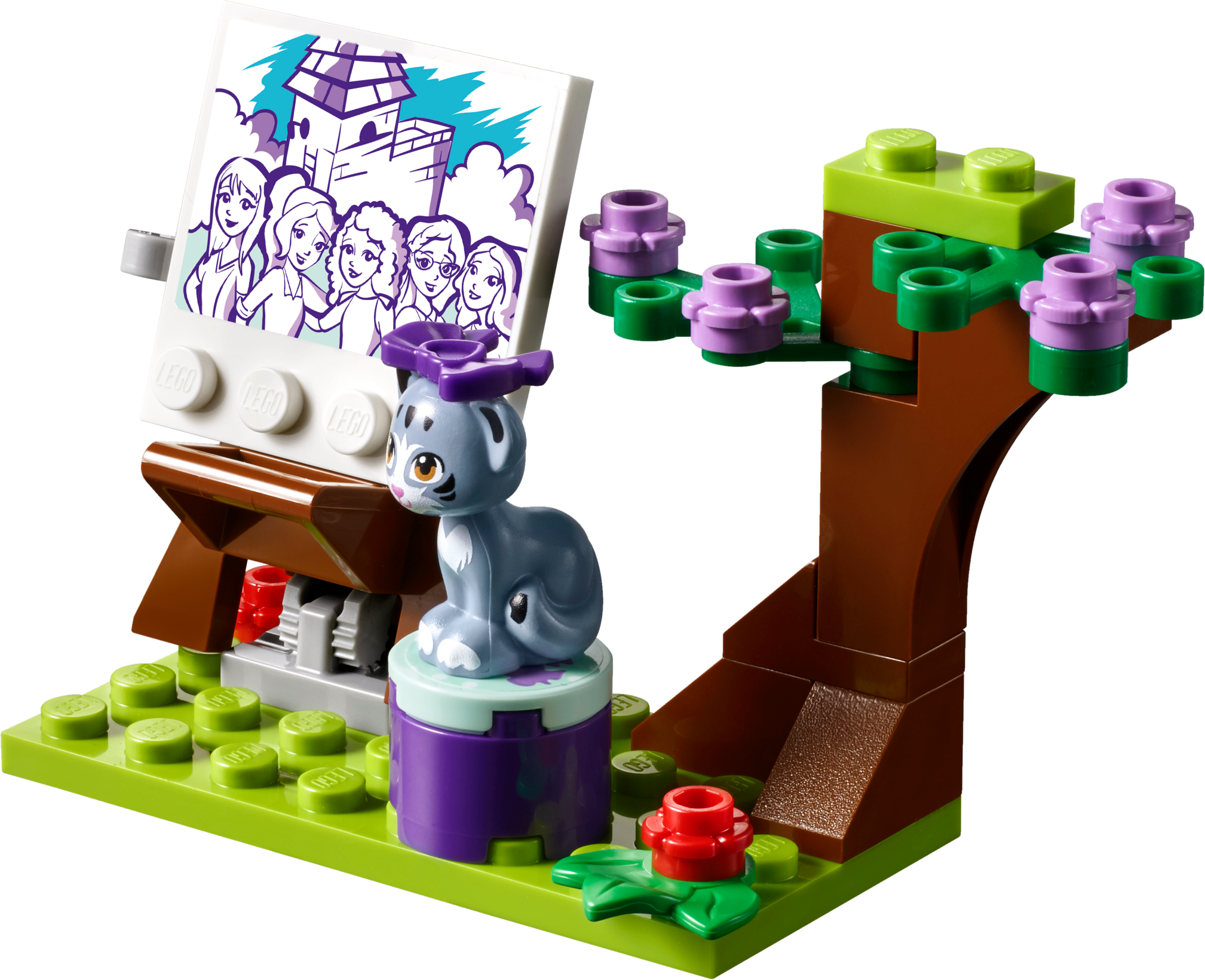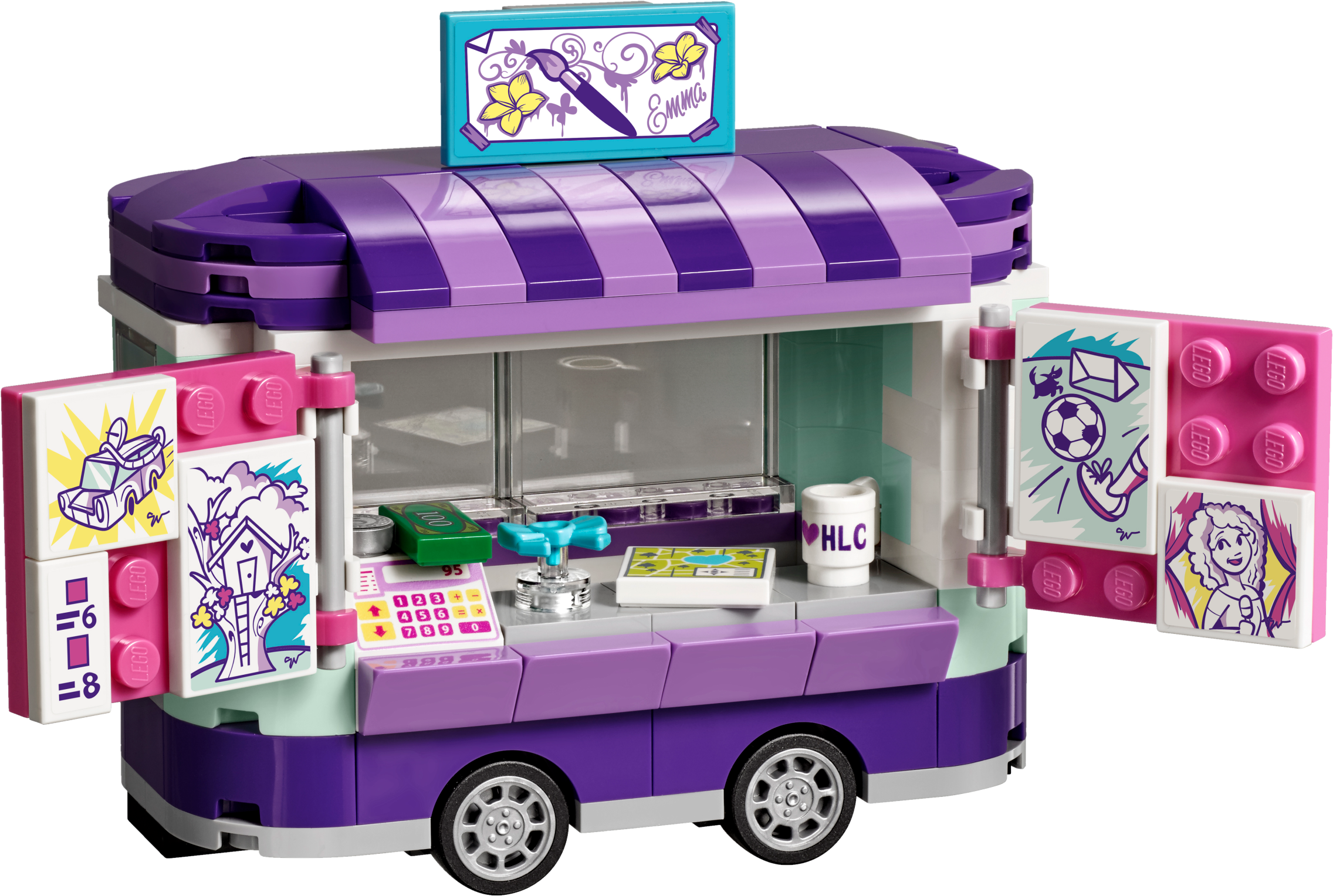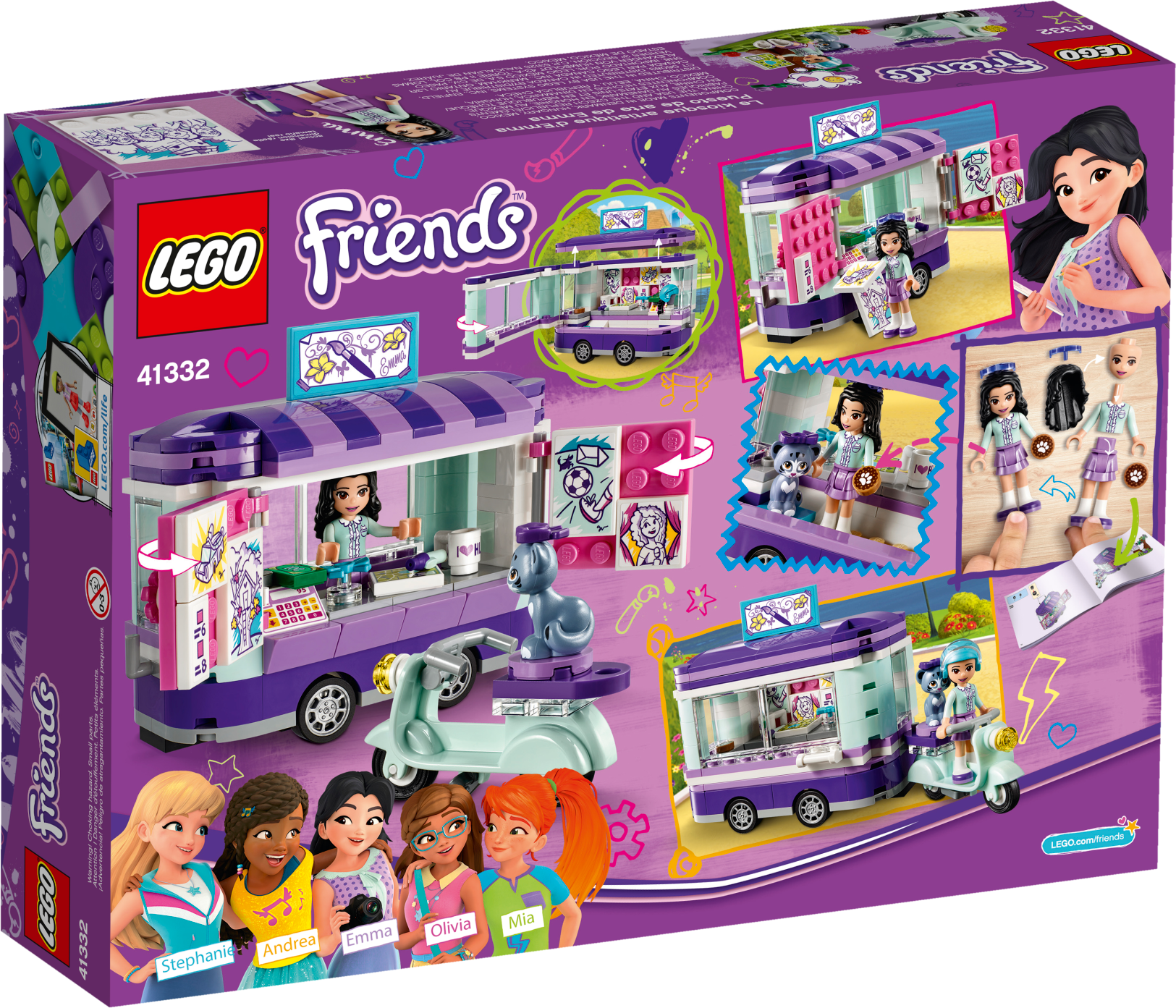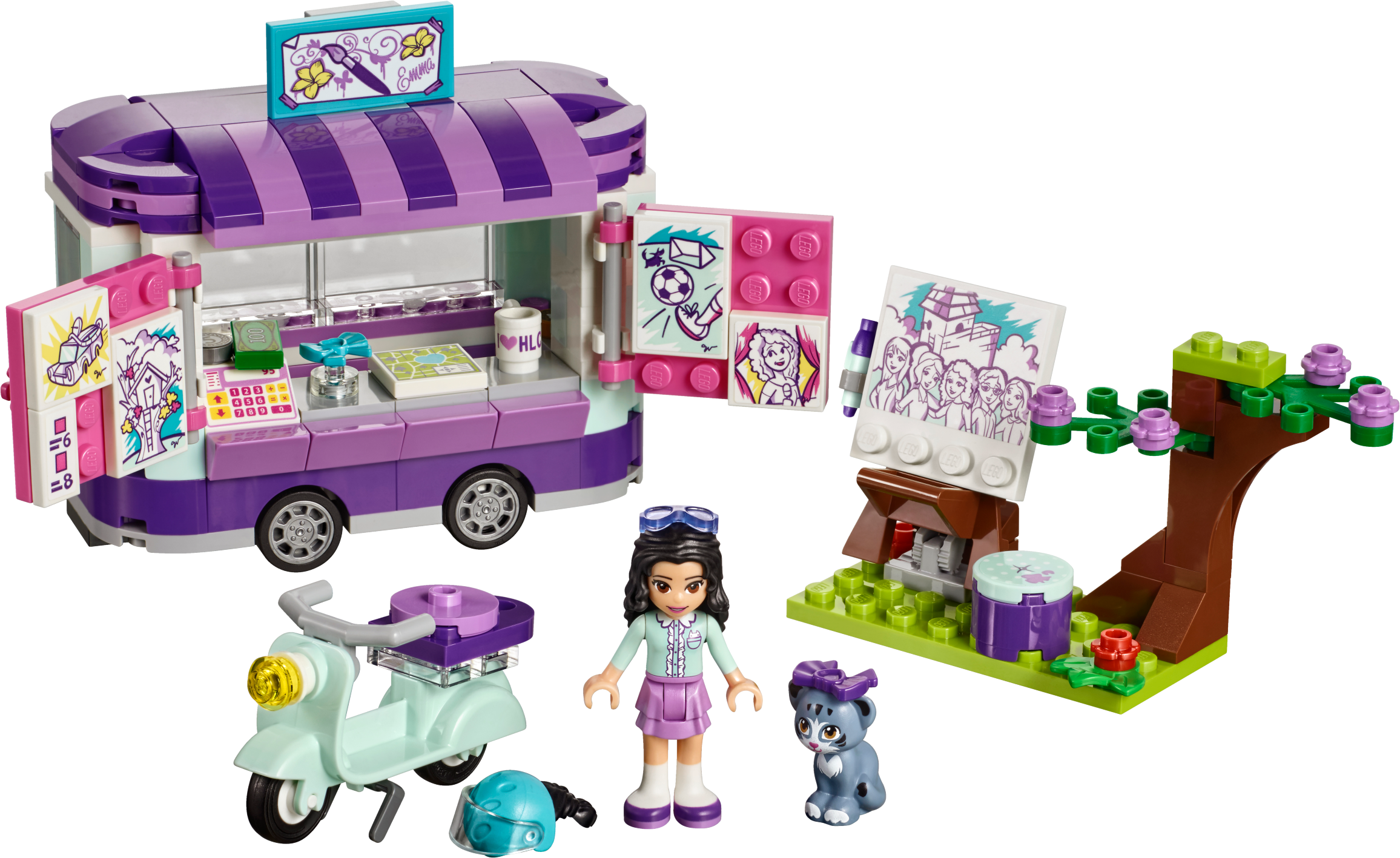 Emma is towing her art stand behind her cool little scooter to set up in Heartlake City Park—her favorite place to paint caricatures. Swing open the windows to show the paintings she has for sale today and help her operate the cash register. Settle her cat Chico down in his bed for a nap, while Emma sits at the easel to work on her latest masterpiece—her best friends are always her greatest inspiration! Includes an Emma mini-doll figure, plus a Chico the cat figure. Features an art stand trailer that opens up in 3 different ways, and a sales hatch, cash register and a cat bed, plus a scooter and separate painting area with an easel, stool and a tree. Accessory elements include a safety helmet, several artwork tiles, price list, Heartlake City Park map, ‘I love Heartlake City' mug, cookie and a bow. Help Emma paint pictures of all her best friends in their favorite locations around Heartlake City. Drive around on the scooter to visit friends or tow the art stand to Heartlake City Park. Look after Chico and put a cool blue bow on his head. Open up the art stand in 3 different ways for easy play inside this cool toy for kids. Suitable for ages 6-12. Emma's art stand measures over 3” (9cm) high, 5” (14cm) long and 2” (6cm) wide. Scooter measures over 1” (5cm) high, 1” (5cm) long and under 1” (1cm) wide. Combine with 41331 Stephanie's Soccer Practice, 41333 Olivia's Mission Vehicle, 41334 Andrea’s Park Performance and 41335 Mia’s Tree House for more fun in Heartlake City Park.