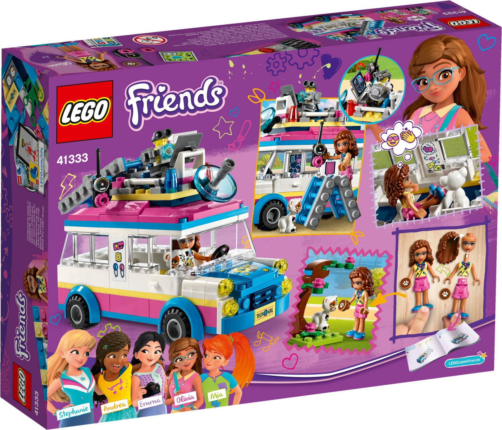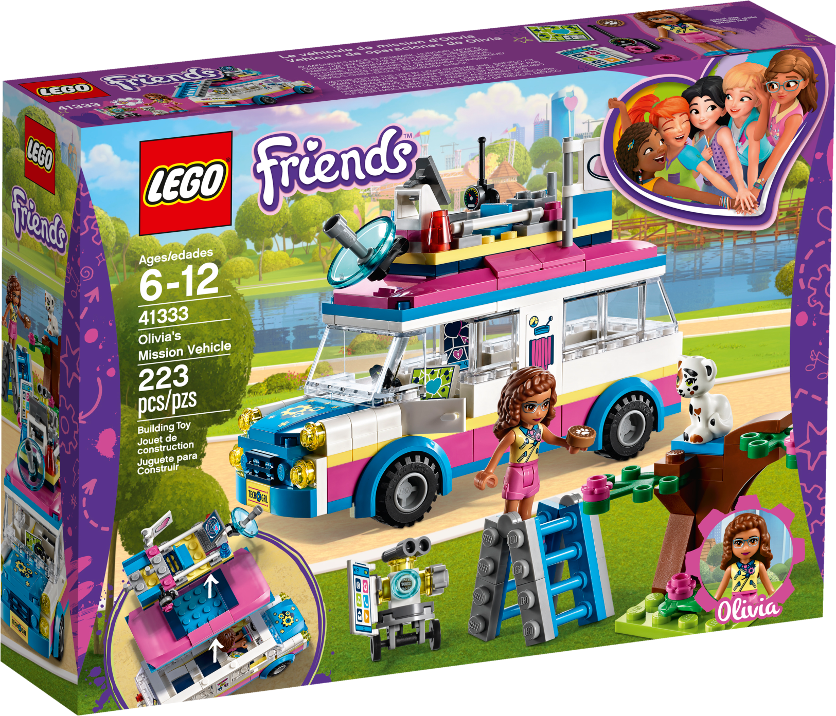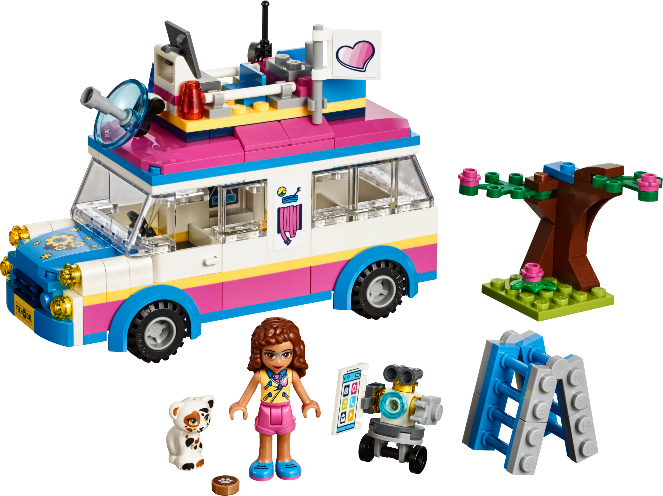 Head to Heartlake City Park in Olivia’s Mission Vehicle—there’s a cat who needs her help! Olivia and her robot Zobo have everything they need to make sure all is well in Heartlake City. Put Zobo in his rooftop control center to monitor the situation, while Olivia sets up the ladder to rescue the little cat from the tree. When he's safe and sound, drive off to find Olivia's friends—there's room for them all inside! Includes an Olivia mini-doll figure, plus a buildable Zobo figure and a Vega the cat figure. Features a truck-style vehicle with rooftop control center, computer, secret compartment and a removable roof with room inside for 5 mini-doll figures, plus a small park scene with a tree. Accessory elements include a Heartlake City Park map, ladder and a cookie. Jump into the mission vehicle with Olivia and Zobo, and rush to anyone who needs their help around Heartlake City. Use the ladder to rescue the little cat from the tree in Heartlake City Park. Help Zobo keep on top of any situation from his rooftop control center. Lift off the control center to discover the secret compartment under the roof of this popular kids’ toy! Suitable for ages 6-12. Olivia's mission vehicle measures over 3” (10cm) high, 5” (13cm) long and 1” (5cm) wide. Park scene measures over 1” (3cm) high, 1” (3cm) wide and 1” (4cm) deep. Combine with 41331 Stephanie's Soccer Practice, 41332 Emma's Art Stand, 41334 Andrea’s Park Performance and 41335 Mia’s Tree House for more fun in Heartlake City Park. Remove Zobo’s control center to park Olivia’s mission vehicle in the garage of the 41340 Friendship House.