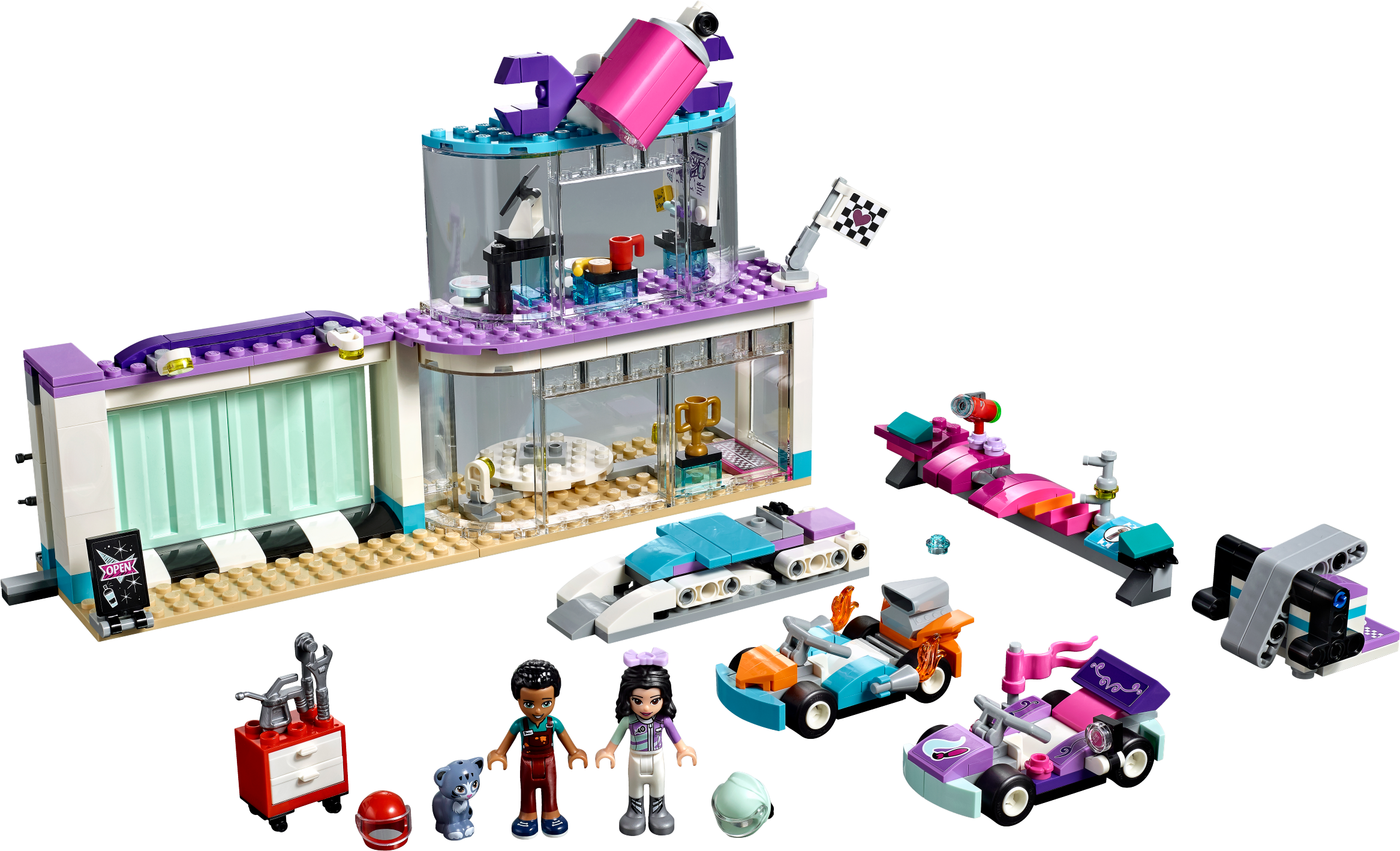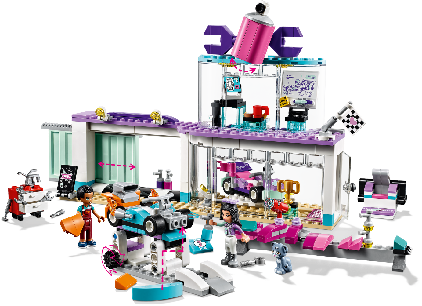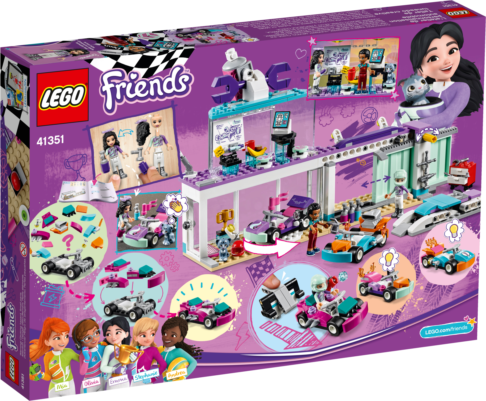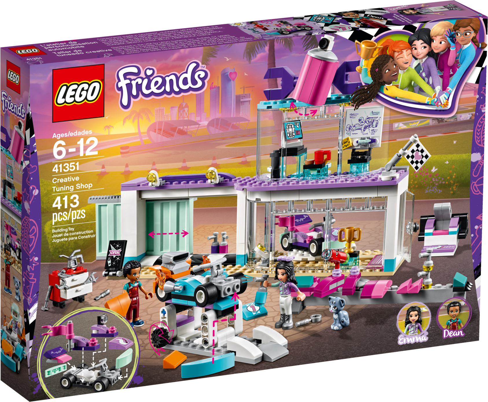 The LEGO® Friends 41351 Creative Tuning Shop features a showroom with sliding door function and revolving floor, lifting workshop platform, opening tool drawers and an upstairs office. This LEGO Friends set also comes with 2 go-karts plus lots of extra pieces to create and customize them in all sorts of ways. There's also a go-kart launcher to help the finished go-karts speed off to the big race, plus 2 mini-doll figures and a cat figure. Includes 2 mini-doll figures: Emma and Dean in racing outfits with crash helmets, plus a Chico the cat figure. Features a showroom with rotating floor and sliding door function, and upstairs office with desks and a computer, plus a lifting workshop platform, 2 go-karts with extra pieces for customization and a go-kart launcher. Accessory elements include car polish bottles, paint sprayer, trophy, mug and a cookie. Use all the pieces to build and customize amazing go-karts for Emma and Dean. Display your latest go-kart design on the showroom’s revolving floor. Raise the workshop platform to tune the go-karts ready for the big race. Use the launch function to help Emma speed off to meet her friends. Creative Tuning Shop measures over 6” (16cm) high, 9” (25cm) wide and 2” (6cm) deep. Each go-kart measures over 1” (3cm) high, 2” (7cm) long and 1” (3cm) wide. Combine with the 41348 Service & Care Truck, 41349 Drifting Diner and 41352 The Big Race Day for endless LEGO® Friends go-kart fun!
