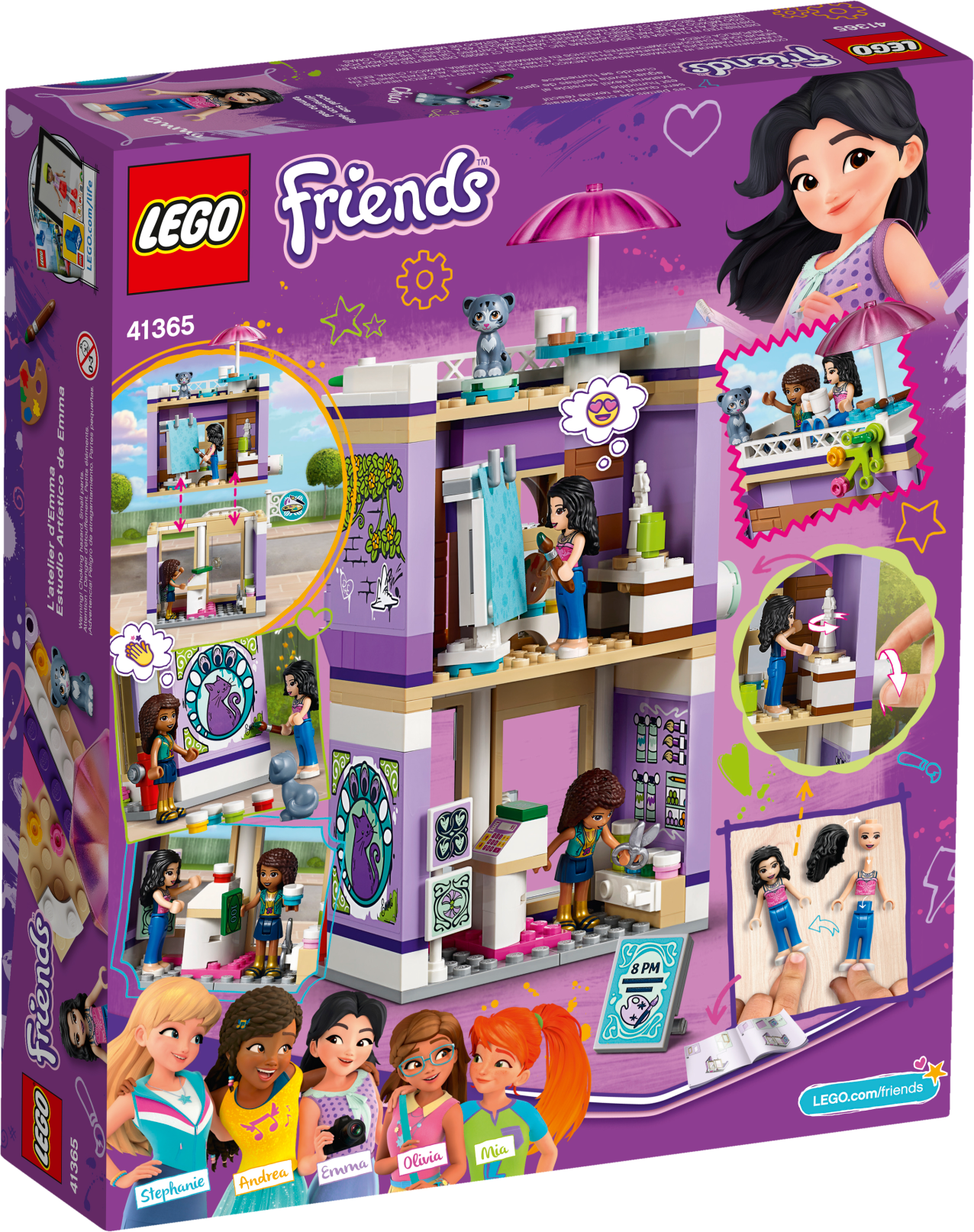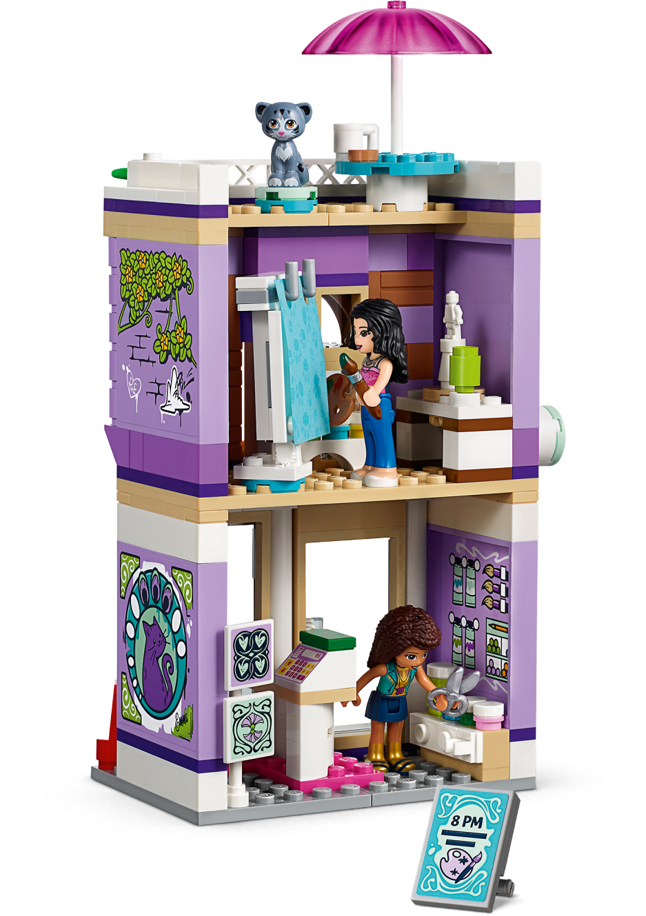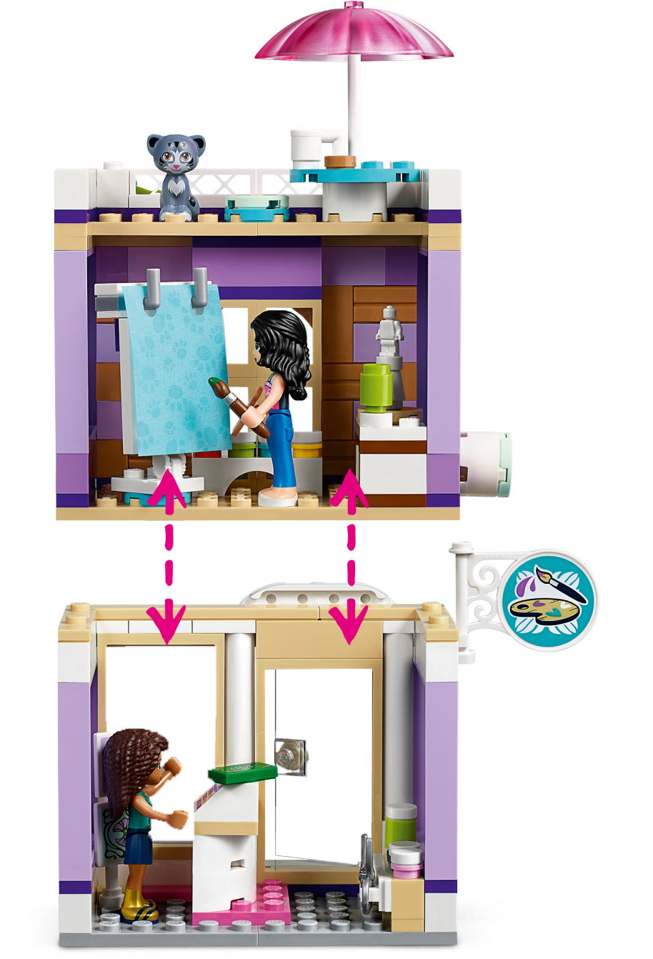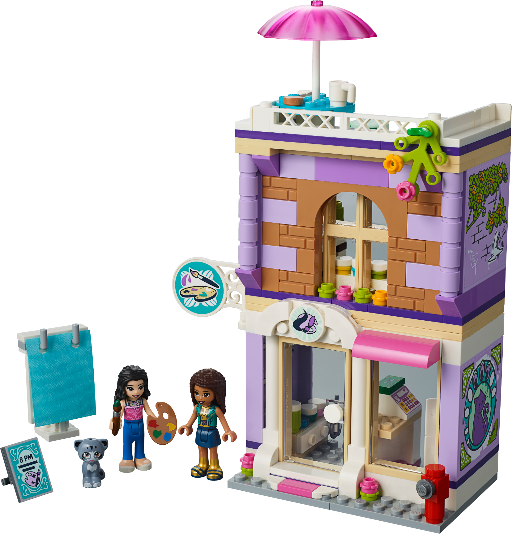 Join Andrea on a shopping trip to LEGO® 41365 Emma’s Art Studio. This toy art studio for kids features a downstairs shop with pieces of art and craft supplies to buy. Upstairs is a studio where, palette in hand, LEGO Friends Emma creates her latest works of art. Let your child's imagination run free as they ‘paint' the magic canvas textile—just add water and watch as an image is revealed! Turn the knob on the potter's wheel to make the sculpture rotate. Continue the creative play up on the roof, relaxing in the café with a coffee and a slice of cake while playing with Chico the cat. Includes 2 mini-dolls: Emma and Andrea, plus a cat figure. This set includes 2 mini-doll figures: Emma and Andrea, plus a Chico the cat figure. Features an art shop downstairs, with art pieces and creative supplies to buy,an upstairs studio with a mini easel stand, paint pots and turning sculptor’s wheel, and a roof terrace café with a table and umbrella. Accessory elements include canvas with water-reactive textile, color palette, paintbrush, scissors, paint bottle, artwork tiles, cash register, cash bill, display sign for outside the store, cookie and a cup. Use the rotating potter’s wheel function to hone your sculptures. ‘Paint’ the clever textile canvas with water to see images revealed! Browse the gallery for new art pieces, or head upstairs to the studio to create your own! LEGO® Friends sets encourage creative play, and make building imaginative and fun. Measures over 6” (16cm) high, 3” (9cm) wide and 2” (6cm) deep.