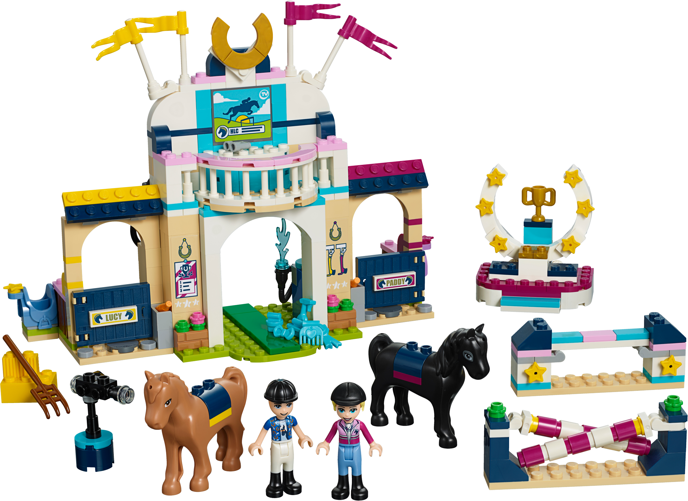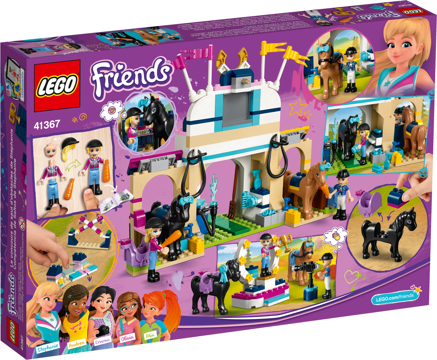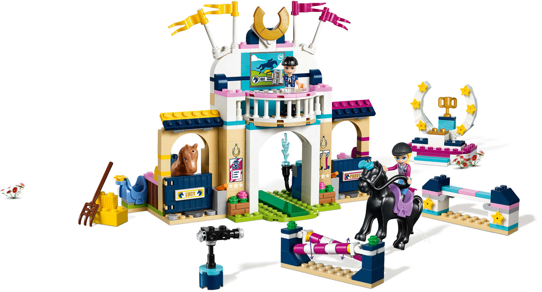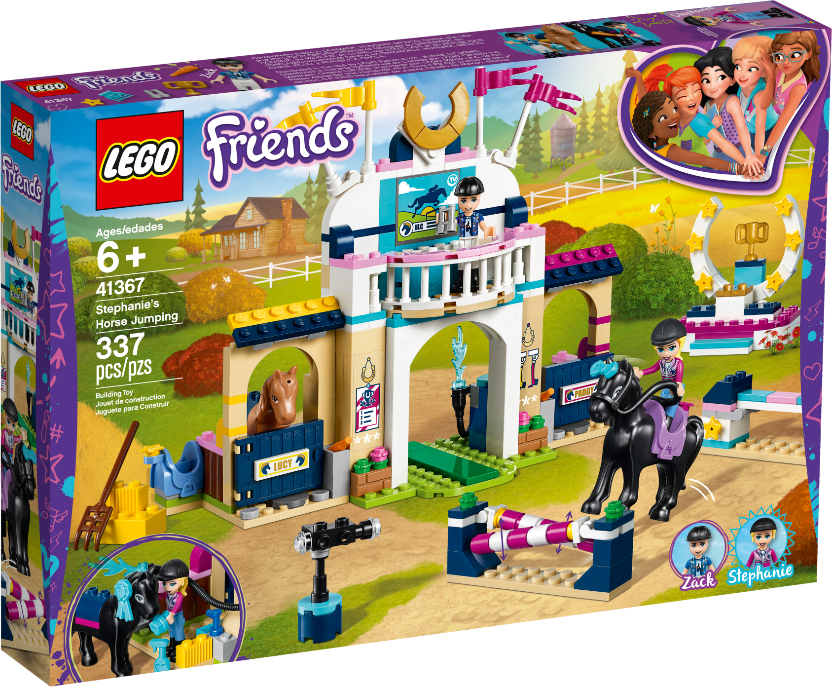 Play at being a showjumping champion with LEGO® Friends 41567 Stephanie’s Horse Jumping set. Before the contest lovingly wash and prepare the horses at the toy horse stable. Once the competition starts ride around the course, navigating the horse jump toys and taking care not to knock off the rails. Spectators can take in the event from the viewing balcony. The action is captured on a TV camera then beamed up to a screen on the balcony. Competitors then take their place on the podium for the trophy-giving. Includes 2 mini-dolls: Stephanie and Zack, plus 2 horse figures. Includes 2 mini-dolls: Stephanie and Zack, plus 2 horse figures. Features 2 stables, a grooming and washing area, viewing balcony, horseshoe podium and jumps. Accessory elements include a TV camera, binoculars, pitchfork, carrots, hay, 2 saddles and 2 bridles. Grooming accessory elements pack includes brushes, sponge, spray bottle, rosettes, bows and a comb. Use the grooming area to clean and care for the toy horses. Help LEGO® Friends Stephanie and Zack canter around the course on the horse toy figures for kids, tackling the jumps. Relax on the balcony while watching the equestrian action play out beneath. LEGO® Friends sets encourage creative play, and make building imaginative and fun. Stables measure over 6” (17cm) high, 9” (24cm) wide and 3” (10cm) deep.