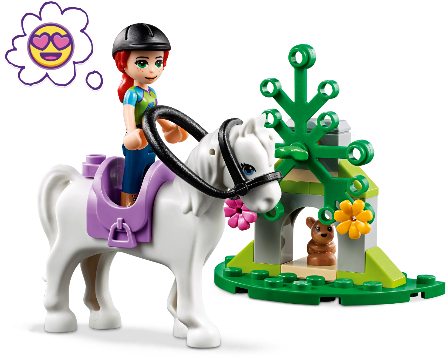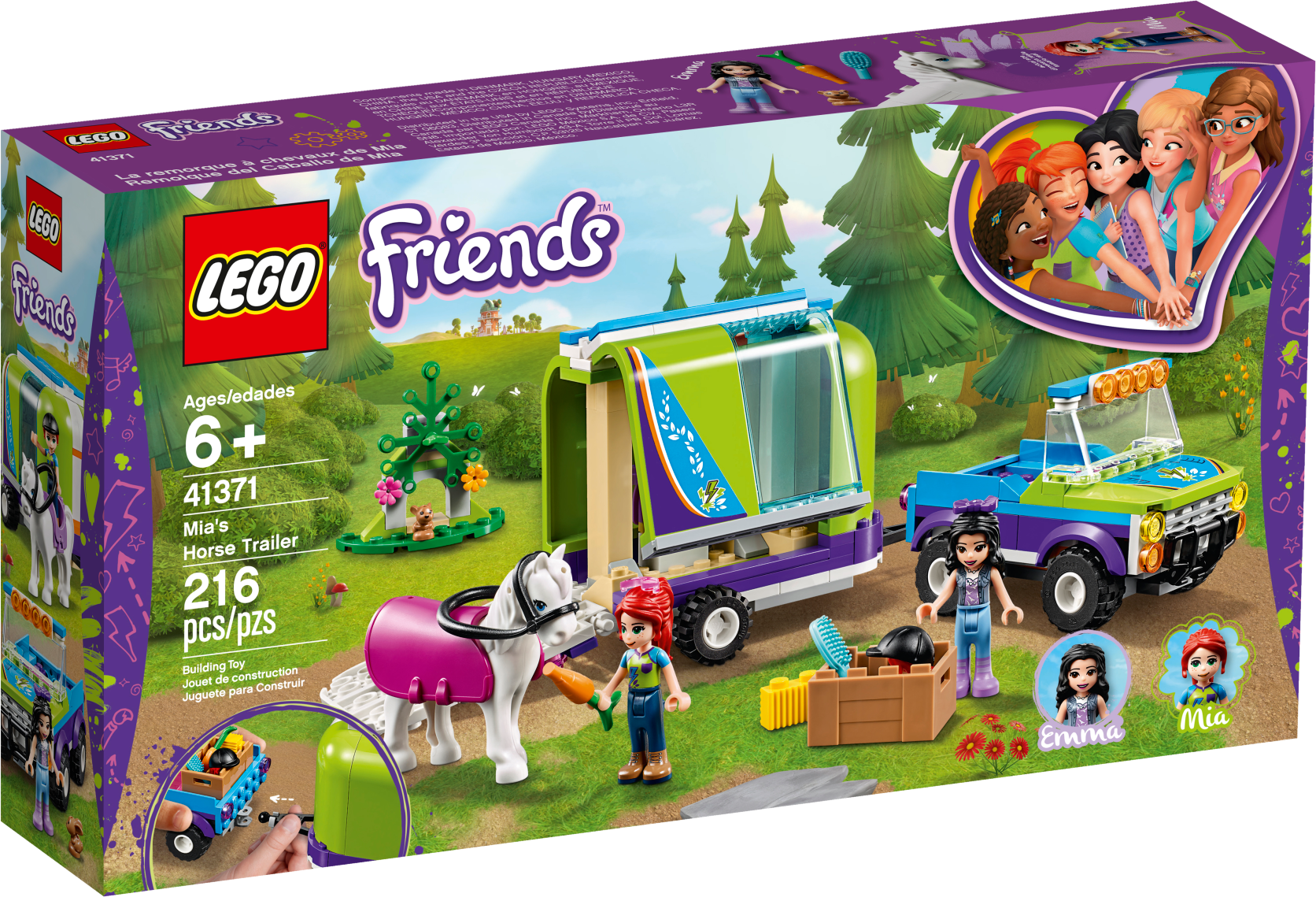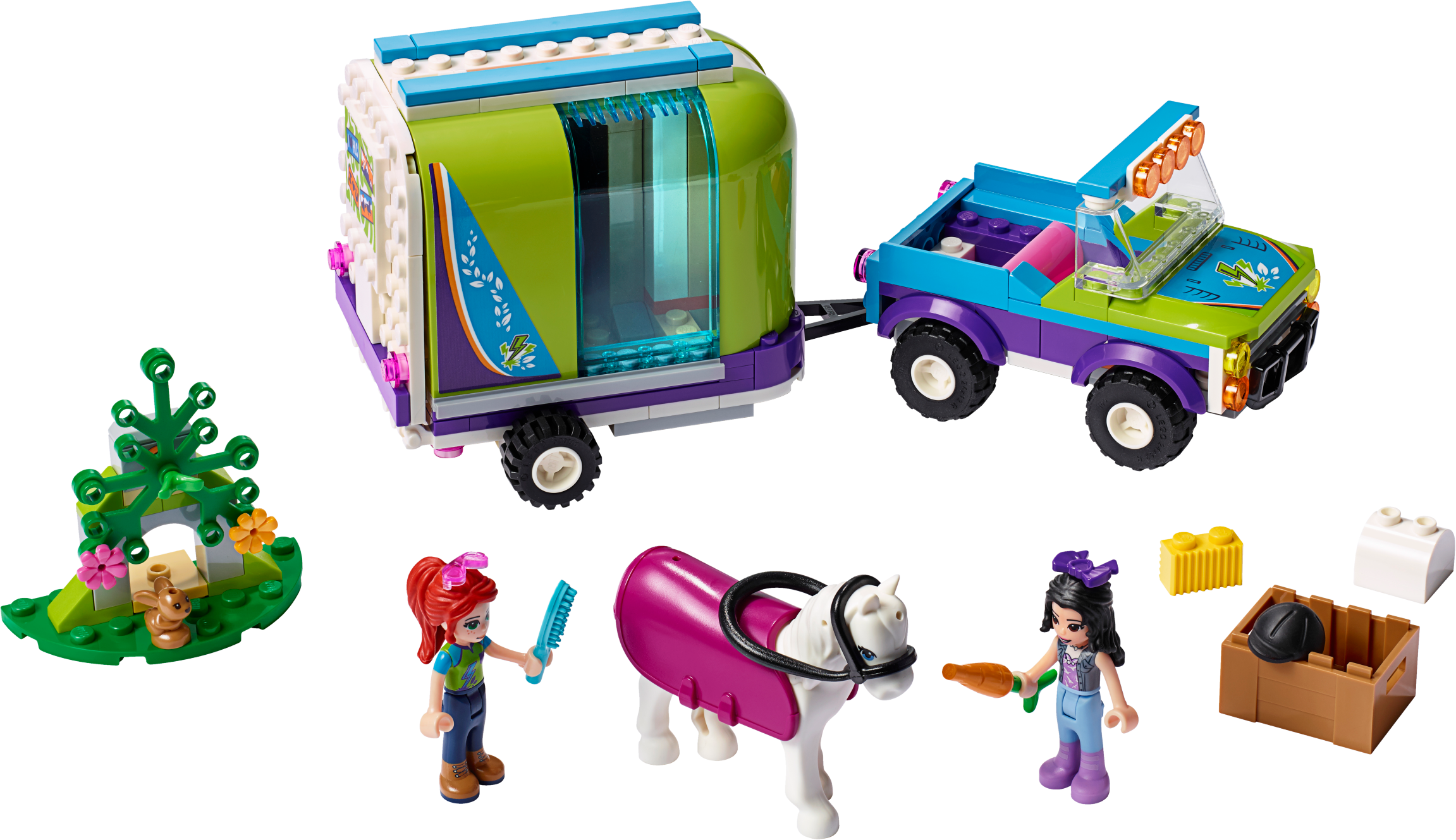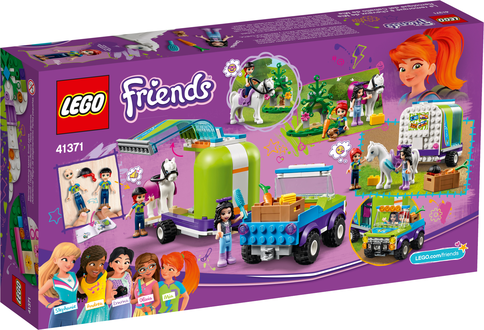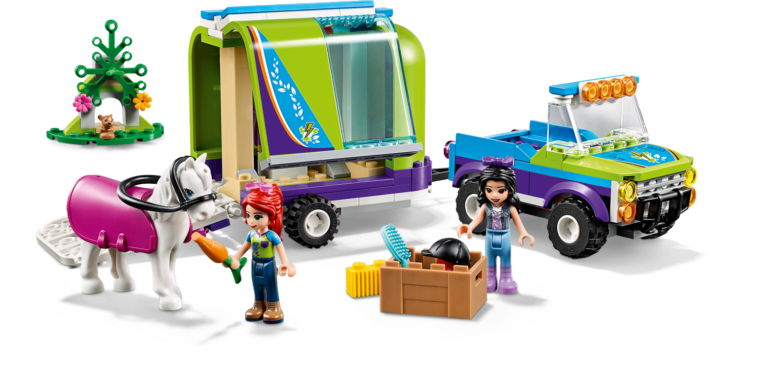 It’s time to enjoy some fresh forest air on horseback with LEGO® Friends 41371 Mia’s Horse Trailer playset. Realistic features will encourage your animal-lover to role-play what it’s like to own a horse. The toy horse trailer has a hinged tailgate that the horse can walk up. A hinged side makes it easy to load all the horse-riding gear the girls need. The playset comes with a LEGO 4x4 for towing the trailer to the woods. The girls can explore the forest on horseback, looking for wildlife as they go. When the exercise is over your Friends fan can show their nurturing side by grooming the white horse toy and feeding her some hay. Give any LEGO builder an amazing building experience with Instructions PLUS, available in the LEGO Life app for smartphones and tablets. The easy-to-use, intuitive building instructions let them zoom, rotate and visualize their creation using the special ghost mode as they go. Instructions PLUS is also great for younger builders, guiding them through the building process for a greater sense of independence and achievement. This toy horse trailer and truck includes 2 mini-doll figures, plus 2 animal figures. This horse toy for kids includes 2 mini-doll figures: Mia and Emma, plus a toy horse and a rabbit figure. Features a buildable 4x4 buggy and LEGO® Friends horse trailer toy with a hinged side panel and tailgate, a buildable forest scene for the rabbit and a box of horse care accessories. Accessory elements include a horse blanket, saddle, bridle, riding helmet, carrot, hay, brush, bow and sunglasses. Kids can role-play hitching up the horse trailer toy, then going to pick up Emma in Mia's ATV. Help your youngster express their caring side by feeding the horse a carrot and some hay. Multiple play scenarios let imaginations roam free amid the wildlife setting. Use the LEGO® Life app to access the intuitive Instructions PLUS building instructions. Help even younger builders through the building process, with easy-to-use zoom, rotate and ghost-mode functions to visualize their creations as they go. LEGO® Friends horse sets encourage imaginative play, and make building creative and fun. Makes an ideal Christmas gift or gift for the holiday season for creative kids. This set is part of the LEGO® Friends world of everyday heroes and exciting real-world scenarios. ATV measures over 2” (6cm) high, 3” (9cm) long and 1” (5cm) wide. Trailer measures over 3” (8cm) high, 5” (13cm) long and 3” (8cm) wide.