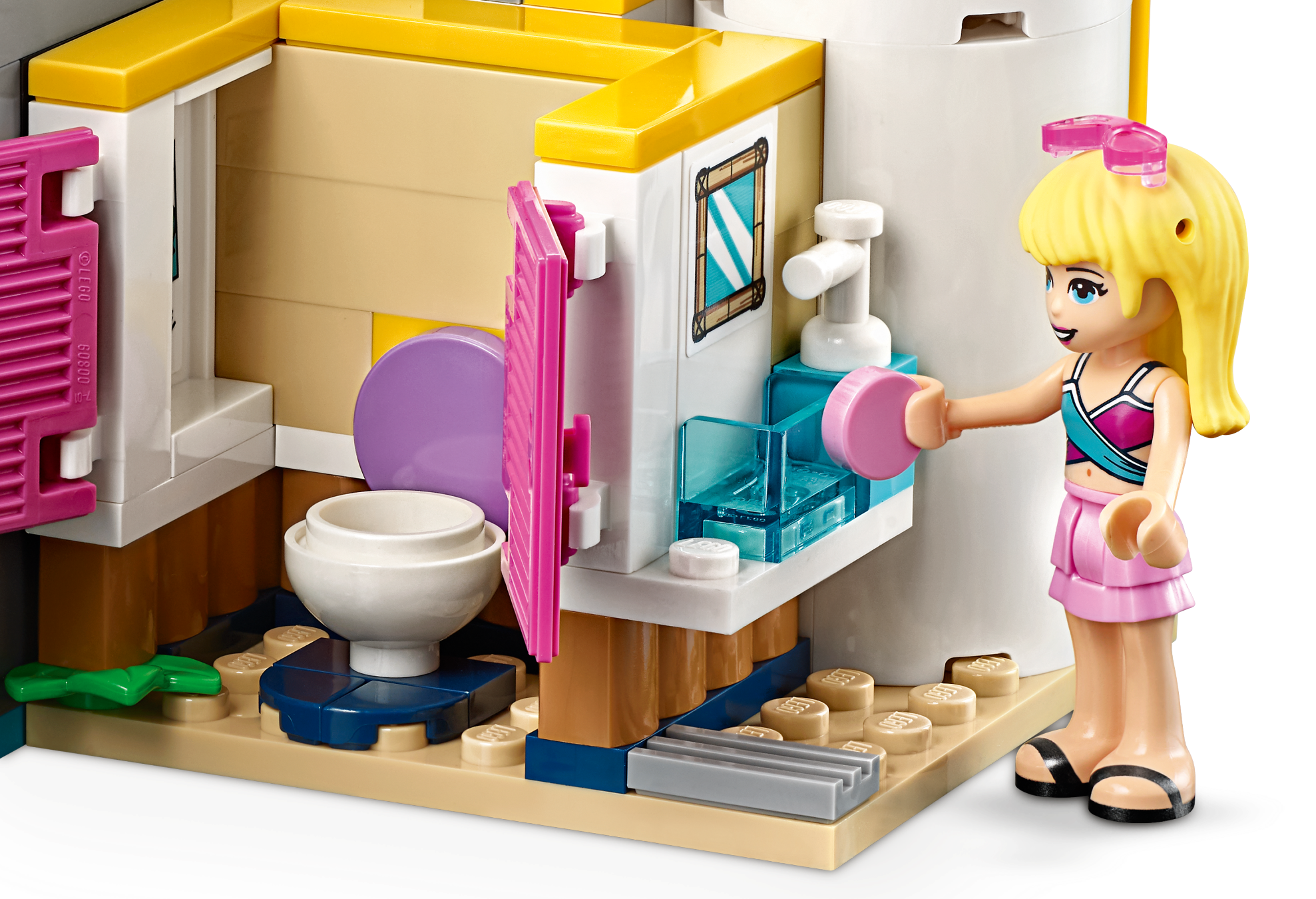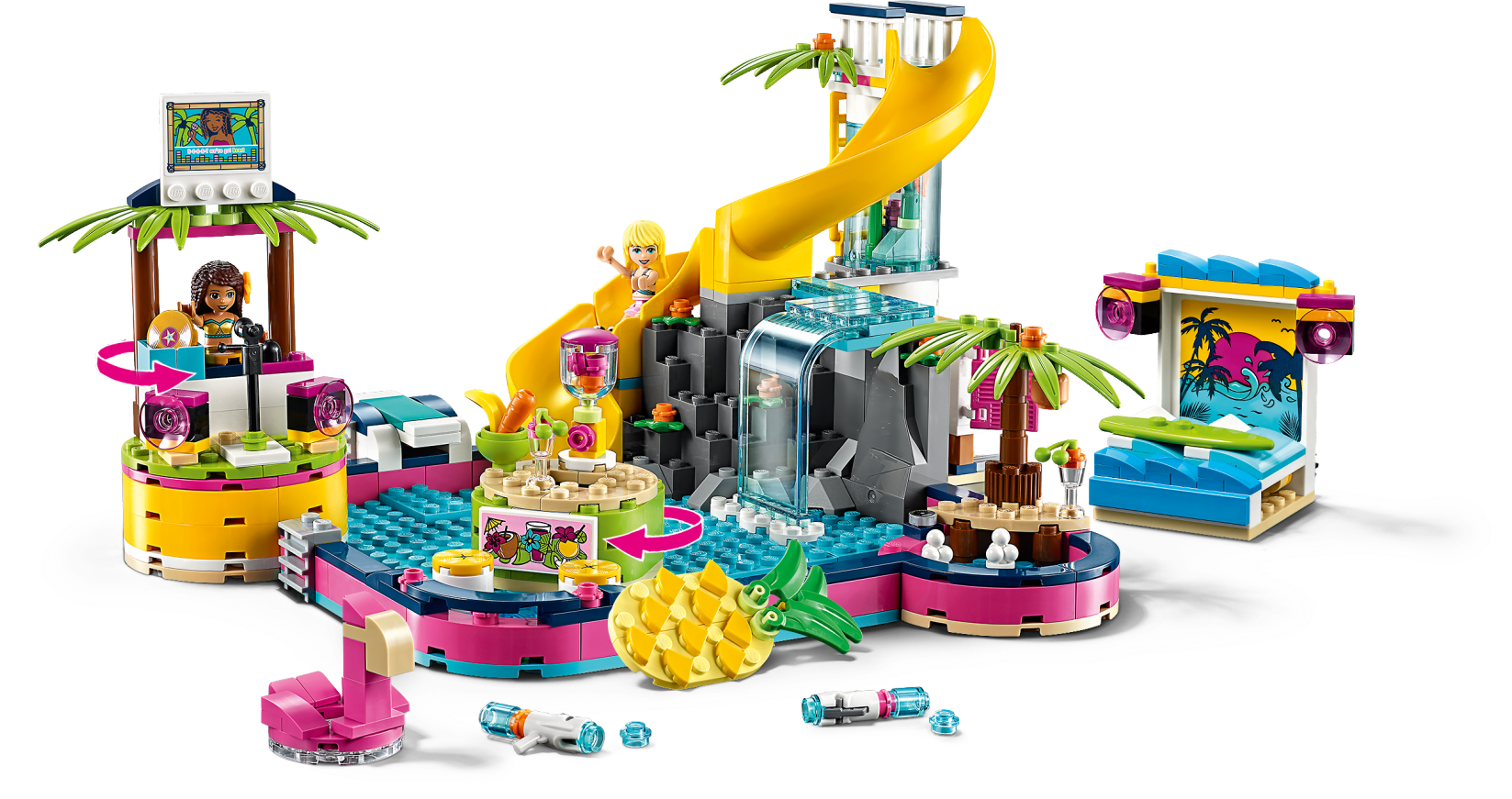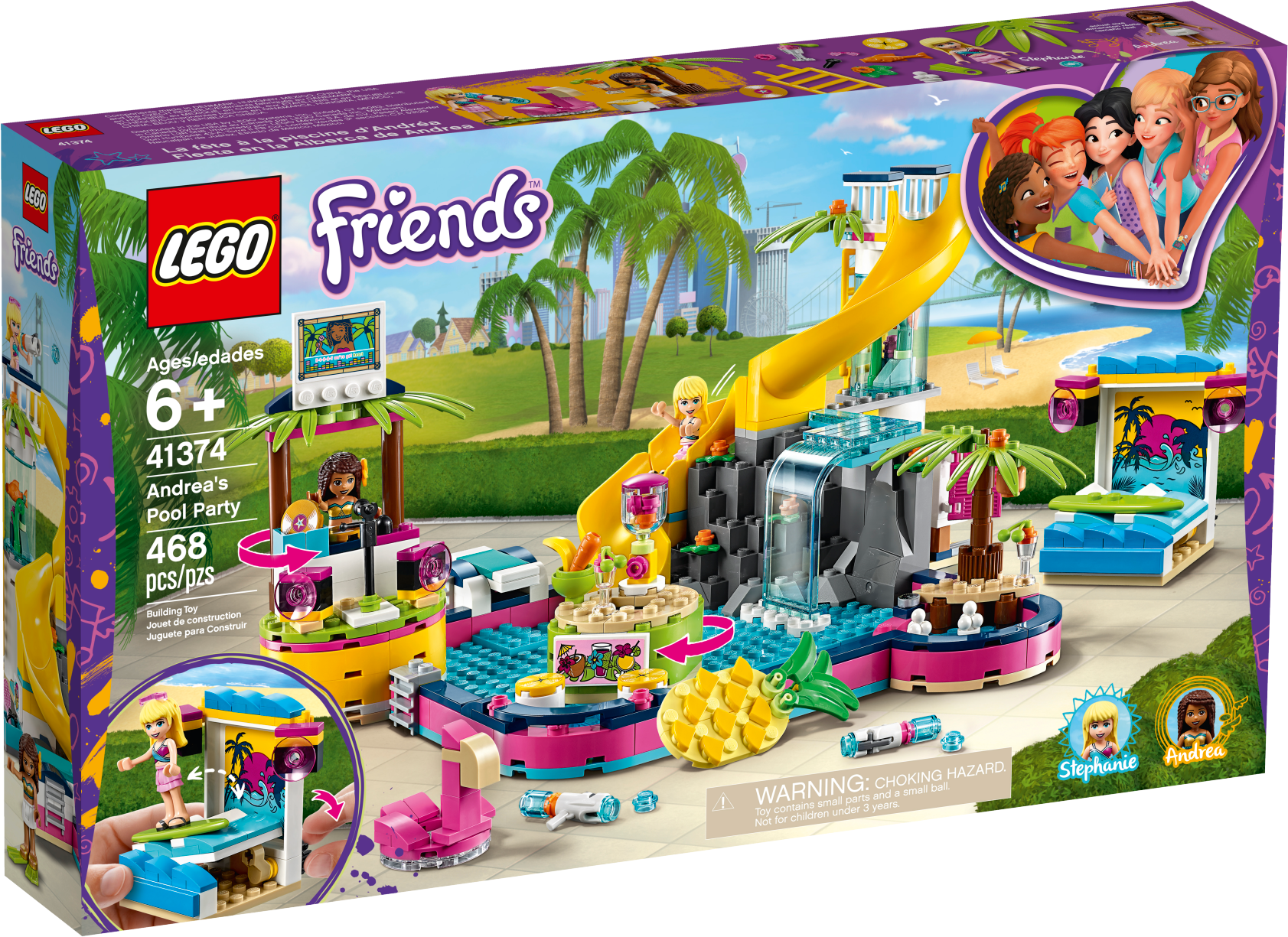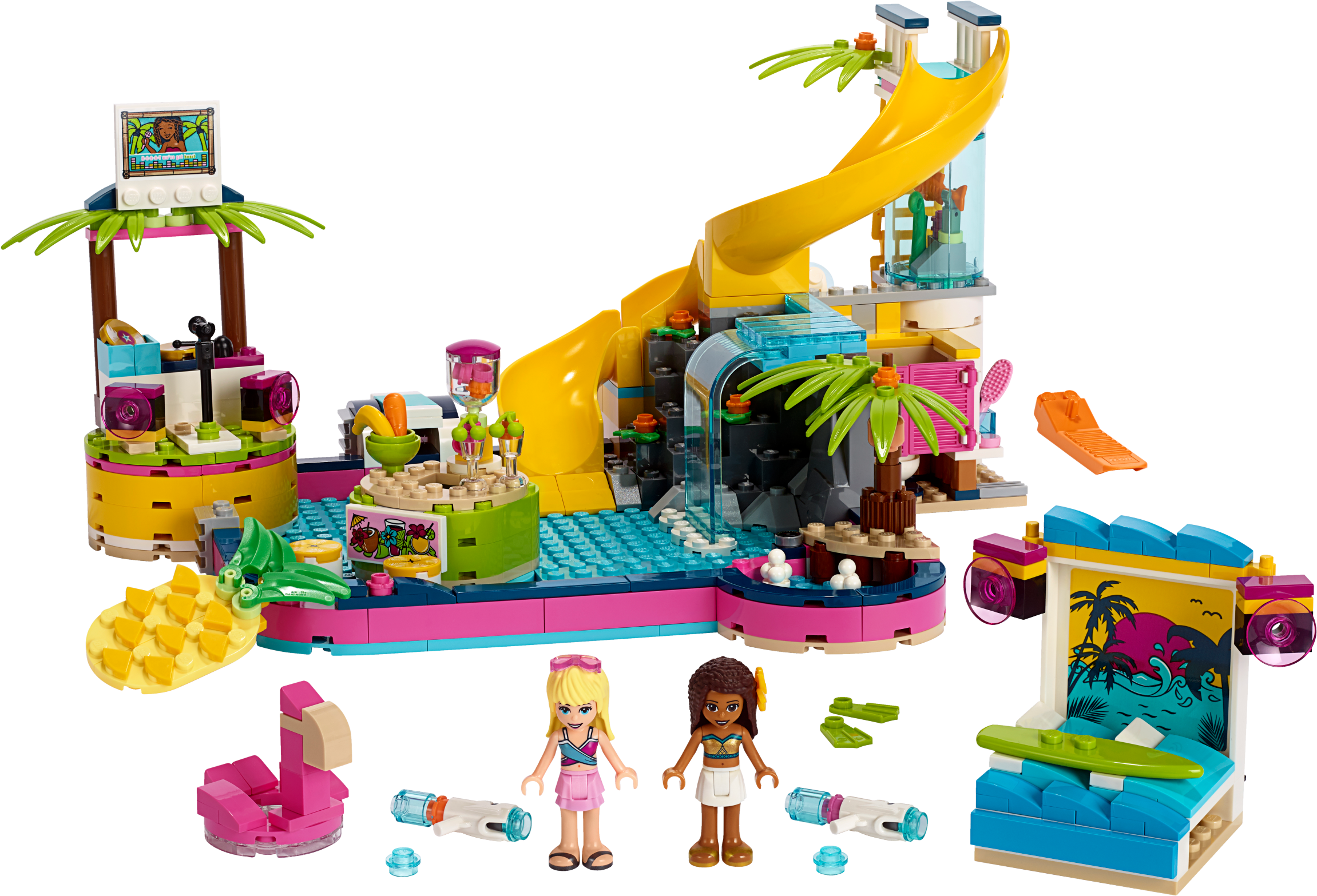 Make a splash with LEGO® Friends 41374 Andrea’s Pool Party. This LEGO Friends pool party is the coolest ticket in town as there’s so much going on to fire your child’s imagination. Let your little builder pretend to be Andrea and host this LEGO pool party, mixing tunes or singing from the DJ box. Or they can imagine that they are Stephanie, chilling out and enjoying all the fun features. This pool party playset has an aquarium, slide, waterfall, wave machine and a juice bar. When it's time to dry out there’s a changing room and a toilet. Give any LEGO builder an amazing building experience with Instructions PLUS, available in the LEGO Life app for smartphones and tablets. The easy-to-use, intuitive building instructions let them zoom, rotate and visualize their creation using the special ghost mode as they go. Instructions PLUS is also great for younger builders, guiding them through the building process for a greater sense of independence and achievement. This toy for girls and boys includes 2 mini-doll figures. Includes 2 mini-doll figures: Andrea and Stephanie. Features a buildable pool with a slide, waterfall, sprung springboard, bubble pool, rotating DJ box, shower area with lockers, toilet and an aquarium. Juice bar comes with 2 bar stools and can be played with separately at the side or fixed in the toy swimming pool as a swim-up bar. Wave machine features a set of speakers, surfboard and a twistable dial function to recreate a wave motion. Accessory elements include a fruit bowl, blender, banana, carrot, glasses with cherries, surfboard, records, water guns with shooting action, bow tie, hair brush, fins and a fish. Kids will love to pretend to be Andrea, singing to her friends. By rotating the wave machine’s dial, kids can pretend to make the girls surf. Fun details such as pistols that ‘shoot' water, help enhance the play. Pool party scenario helps young children to act out and explore social situations. Makes an ideal Christmas gift or gift for the holiday season for creative kids. Use the LEGO® Life app to access the intuitive Instructions PLUS building instructions. Help even younger builders through the building process, with easy-to-use zoom, rotate and ghost-mode functions to visualize their creations as they go. LEGO® Friends toys encourage imaginative play, and make building creative and fun. This set is part of the LEGO® Friends world of everyday heroes and exciting real-world scenarios, making it a great gift for kids. LEGO® pool complex measures over 5” (15cm) high, 11” (29cm) wide and 7” (20cm) deep. Wave machine measures over 2” (7cm) high, 1” (4cm) wide and 1” (5cm) deep.