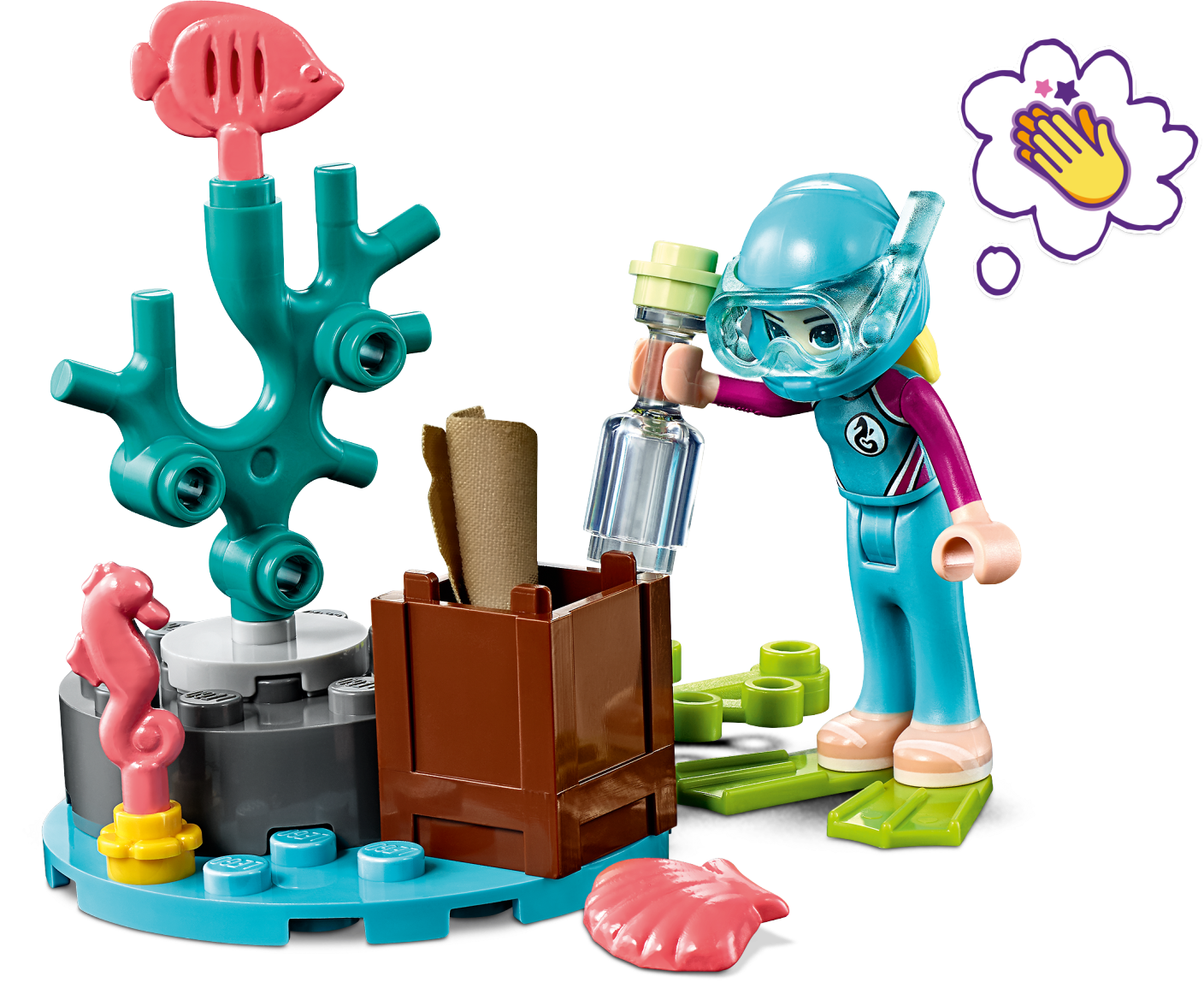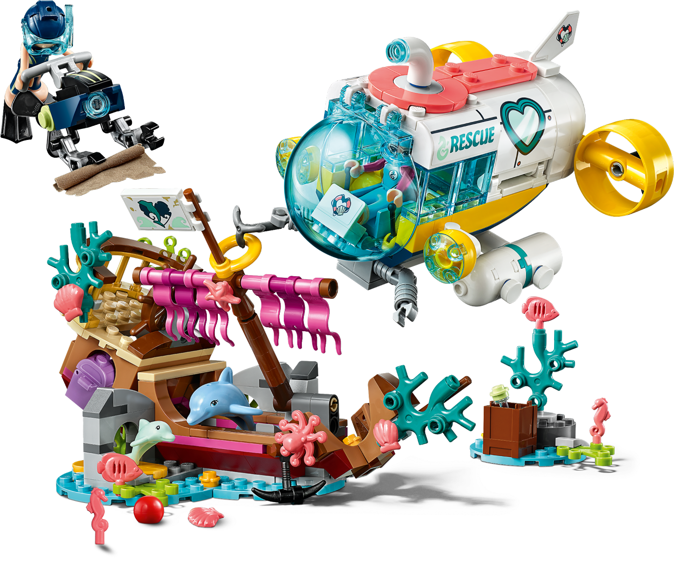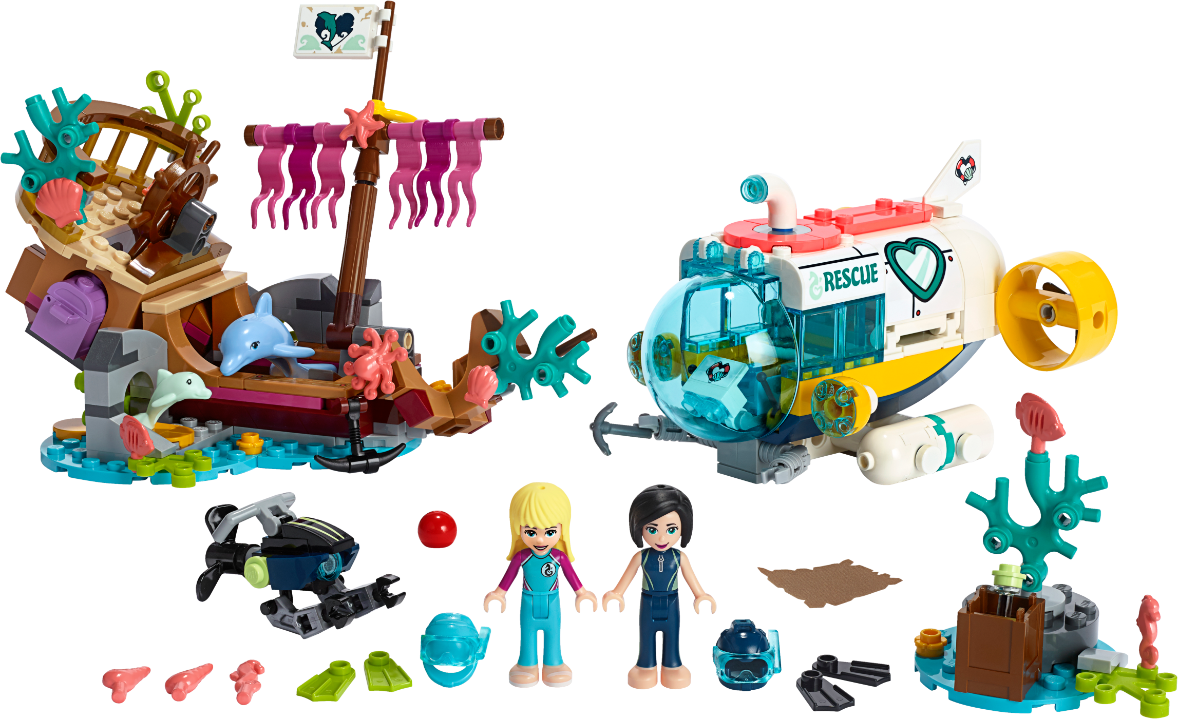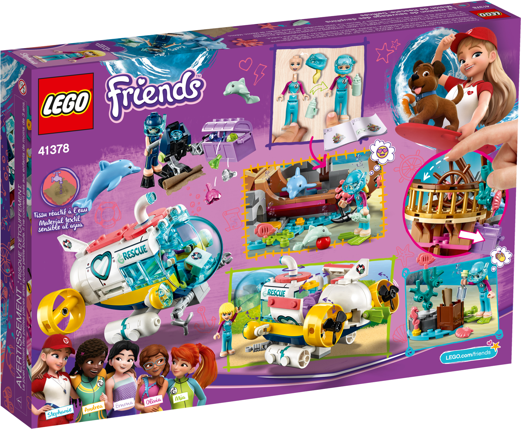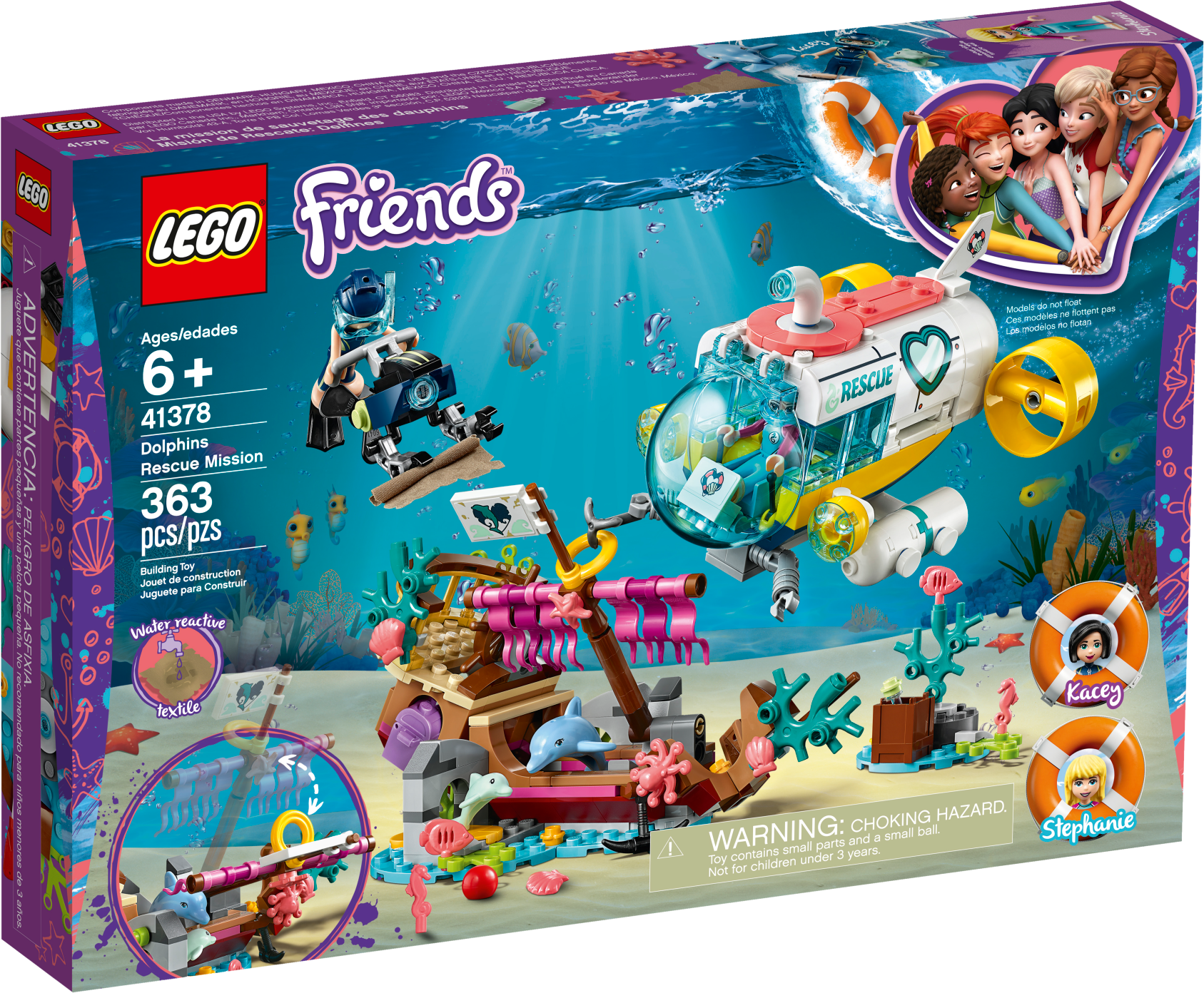 Let your little builder get immersed in a race to a rescue a trapped dolphin and find the hidden treasure with LEGO® Friends 41378 Dolphins Rescue Mission creative toy. This dolphin playset allows kids to act out an underwater LEGO rescue mission as Stephanie dives in her cool submersible craft to free a stricken dolphin from a shipwreck. The shipwreck's mast is hinged so Stephanie can lift it to free the dolphin with the grabbing arm of her craft. A hidden gem-filled treasure chest adds another dimension to the action, as does the textile pirate’s map that reveals secret information when brushed with water. But who will find the map first, Stephanie or bad-girl Kacey? The only certainty is the fun your Friends fan will have as they decide who wins this LEGO treasure hunt! Construction set includes 2 mini-doll figures, plus 2 dolphin figures for hours of imaginative play. Includes 2 mini-doll figures: Stephanie and Kacey, plus 2 dolphin figures. Features a toy submarine with a viewing sphere with hinged windscreen, plus an underwater scooter, shipwreck with hinged mast, and a mini island with a treasure trunk. Accessory elements include a water-reactive textile treasure map, 2 wigs, 2 diving helmets, coral and sea creature elements, treasure chest with gems, ball, bottle, fins, syringe, baby bottle and a grabbing tool. Inspire your little builder to set sail on a LEGO® rescue mission. Help your child to explore how to care for an animal’s wellbeing with this creative toy. Kids will love to act out the exciting race to the treasure between Stephanie and Kacey. Water-reactive textile treasure map adds an element of surprise. Combine this dolphin playset with other LEGO® Friends animal rescue toys such as the 41376 Turtles Rescue Mission, 41380 Lighthouse Rescue Center and 41381 Rescue Mission Boat sets to extend the action-packed fun. Use the LEGO® Life app to access this building kit’s intuitive Instructions PLUS building instructions. Help even younger builders through the building process, with easy-to-use zoom, rotate and ghost-mode functions to visualize their creations as they go. LEGO® Friends sets encourage imaginative play, and make building creative and fun. This toy for girls and boys is part of the LEGO® Friends world of everyday heroes and exciting real-world scenarios. Submarine rescue vehicle measures over 3” (8cm) high, 5” (14cm) long and 4” (11cm) wide. Shipwreck measures over 5” (13cm) high, 7” (20cm) long and 4” (11cm) wide.